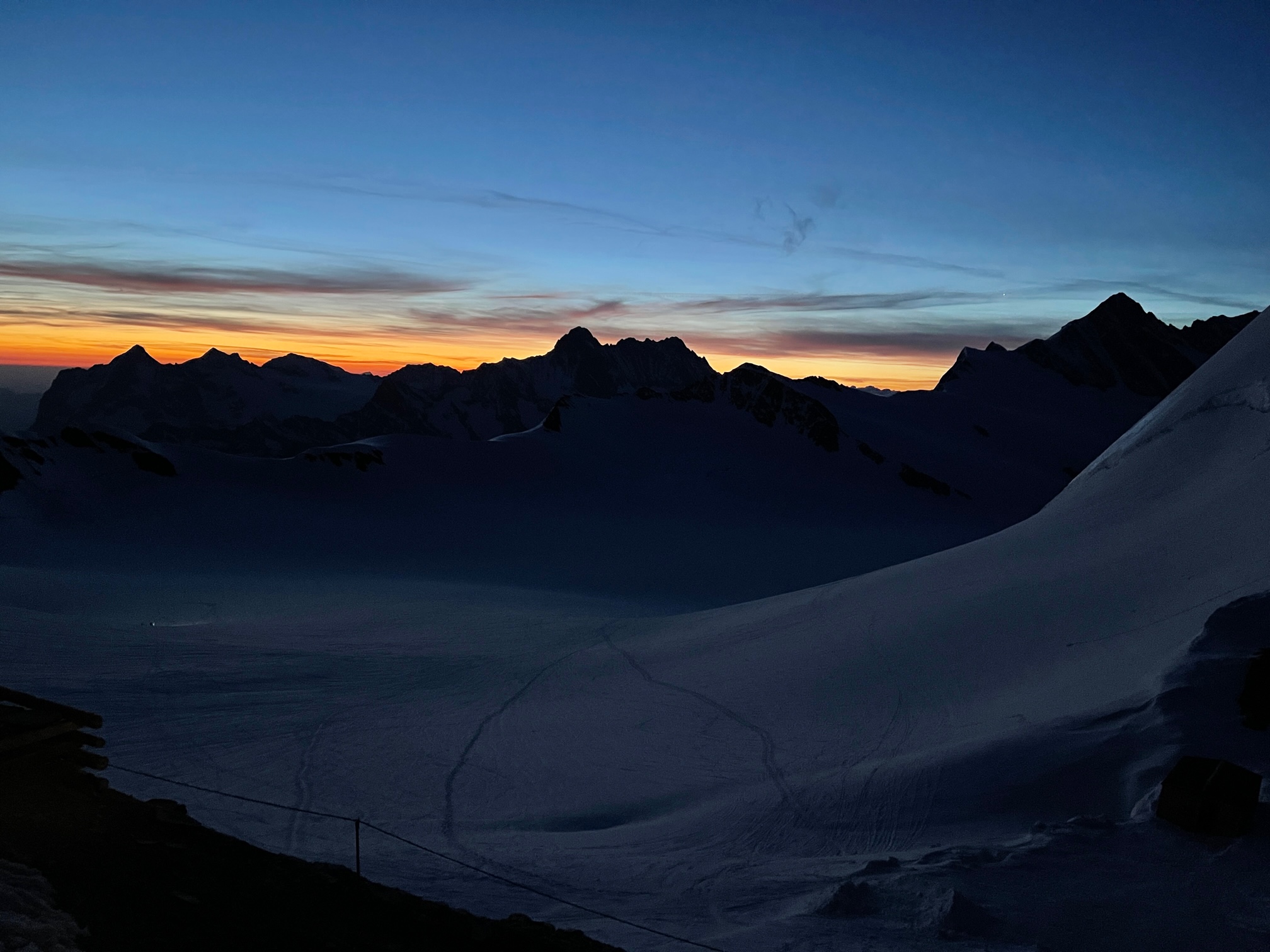 On rejoint la cabane Mönchsjoch pour passer la première nuit. On a de la chance de bien supporter l’altitude et en règle générale, dormir à près de 3700m de nous pose pas de problème. Il faut savoir qu’à cette altitude, en plus d’un léger mal de tête, le système digestif est quelques peu mis à mal. Alors avec la double ration de papet vaudois et l’excellente saucisse aux choux servie pour le repas du soir, la nuit a été quelque peu mouvementée 😅.