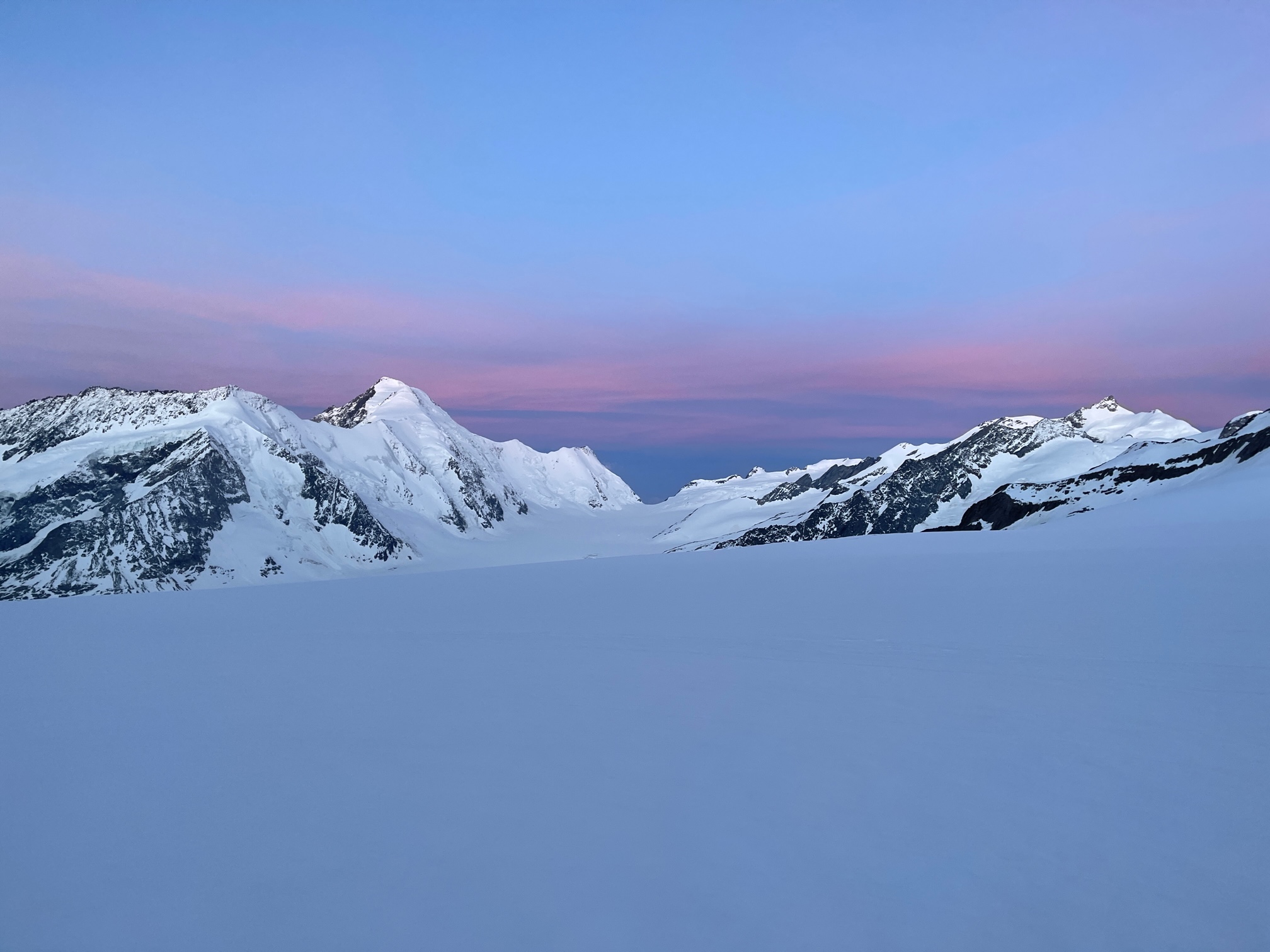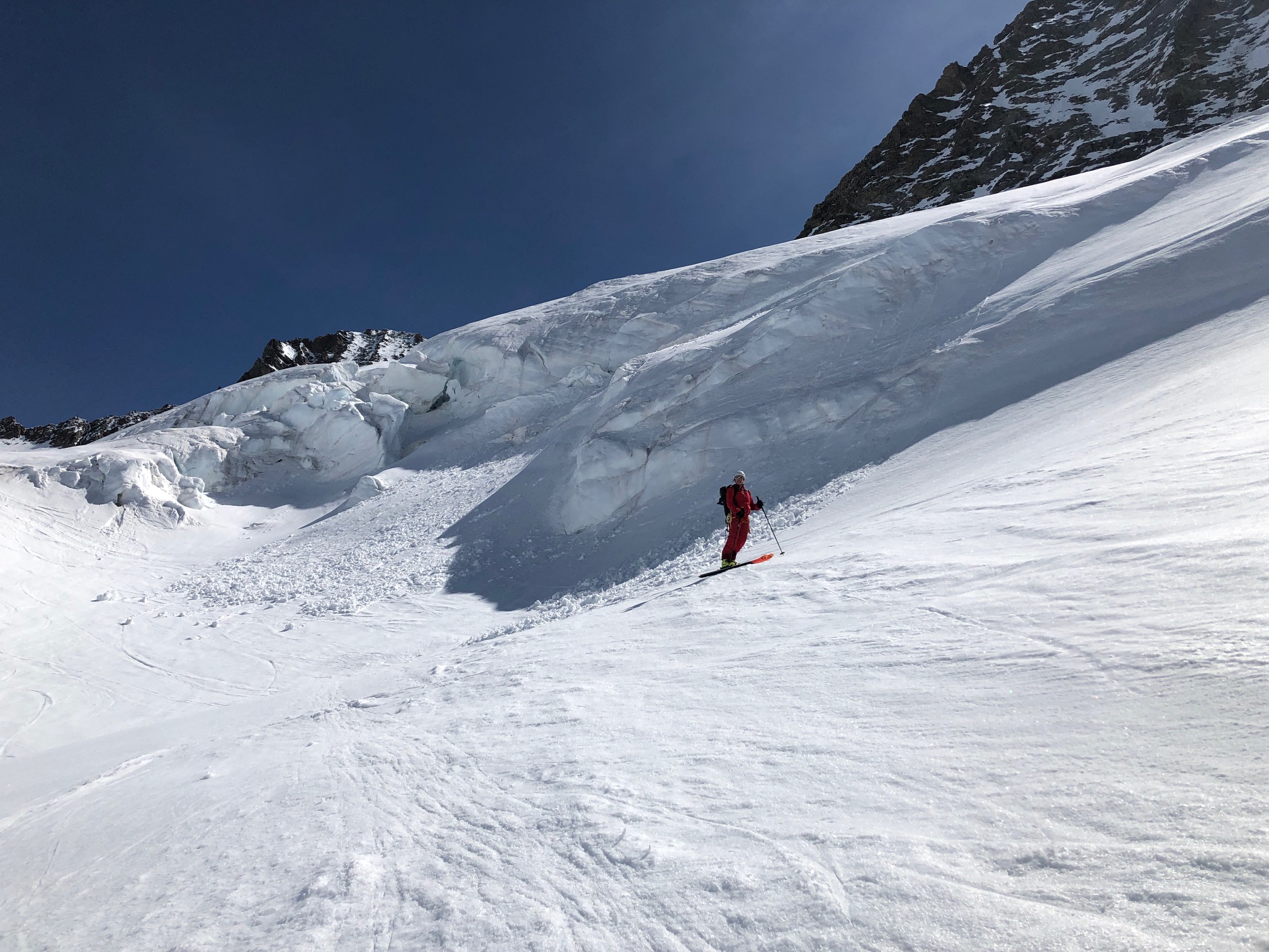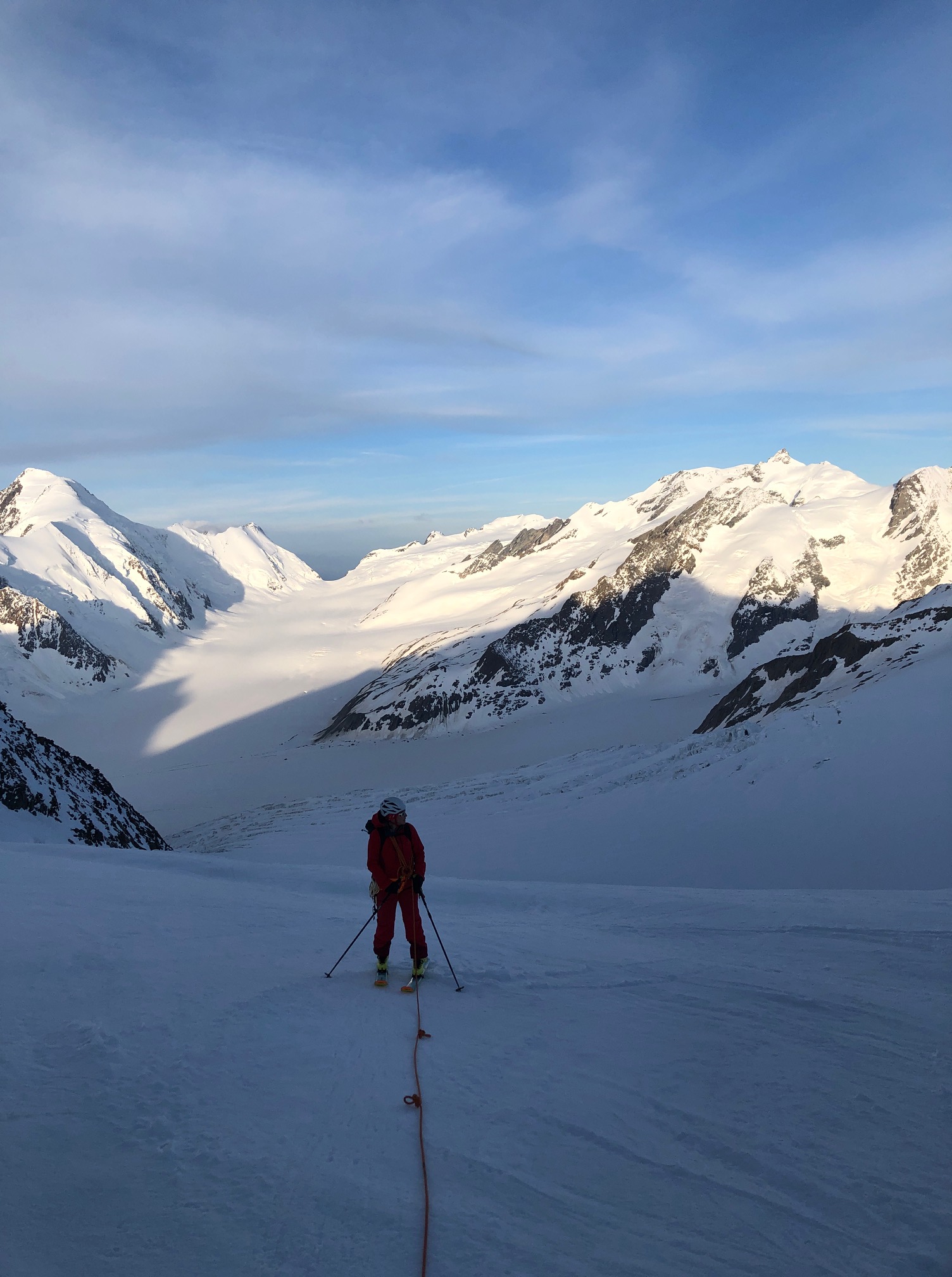 On descend l’Ewigschneefäld sur une neige bien dure, on se laisse glisser paisiblement jusqu’au plat sous le Gross Grünhorn. On peaute et on commence à monter bien tranquillement, la neige est béton c’est juste magnifique. Quelle chance on a d’être ici ! Il y a un groupe devant nous et deux cordées qui arrivent du Grünegghorn, sinon personne.
