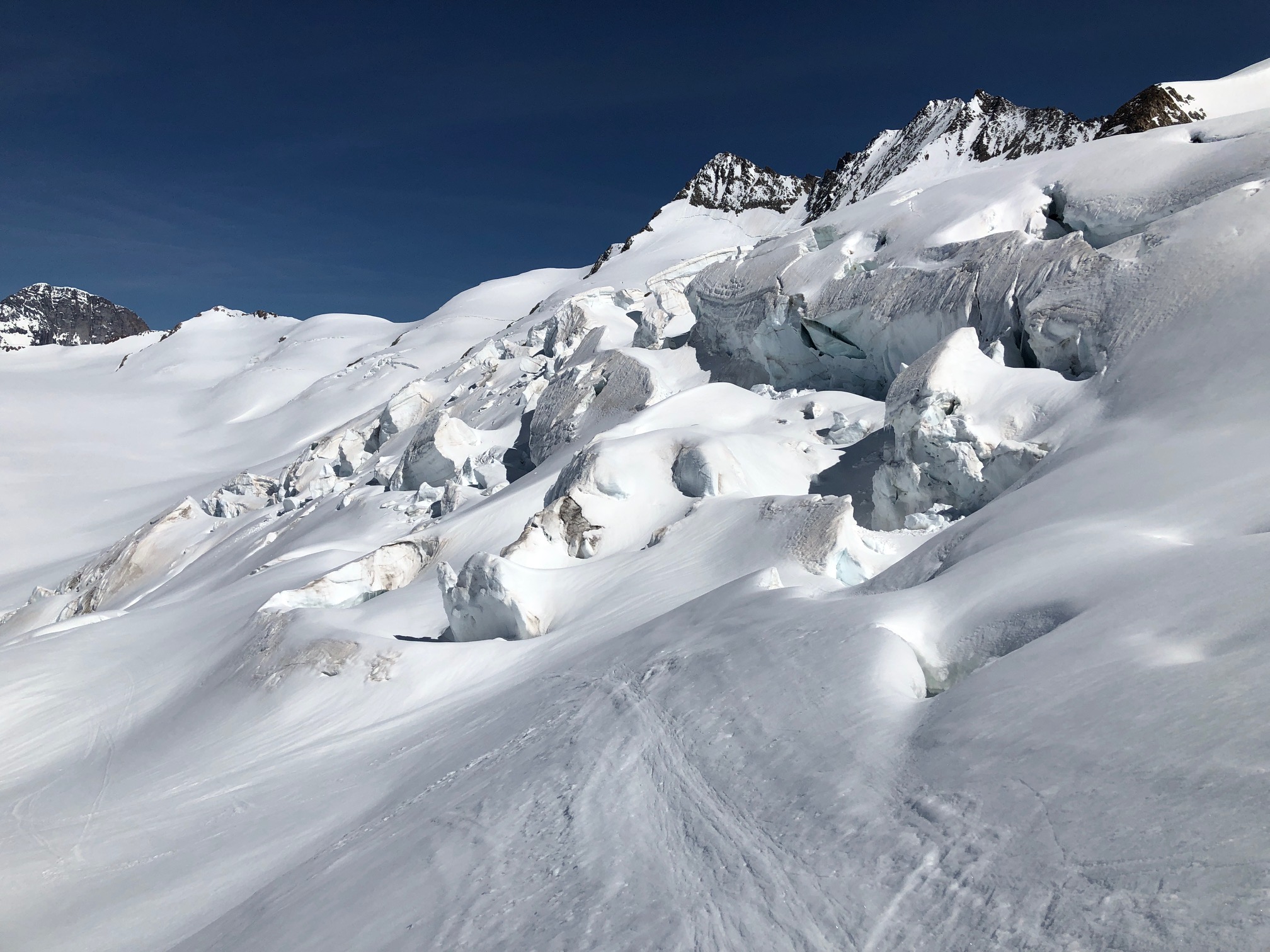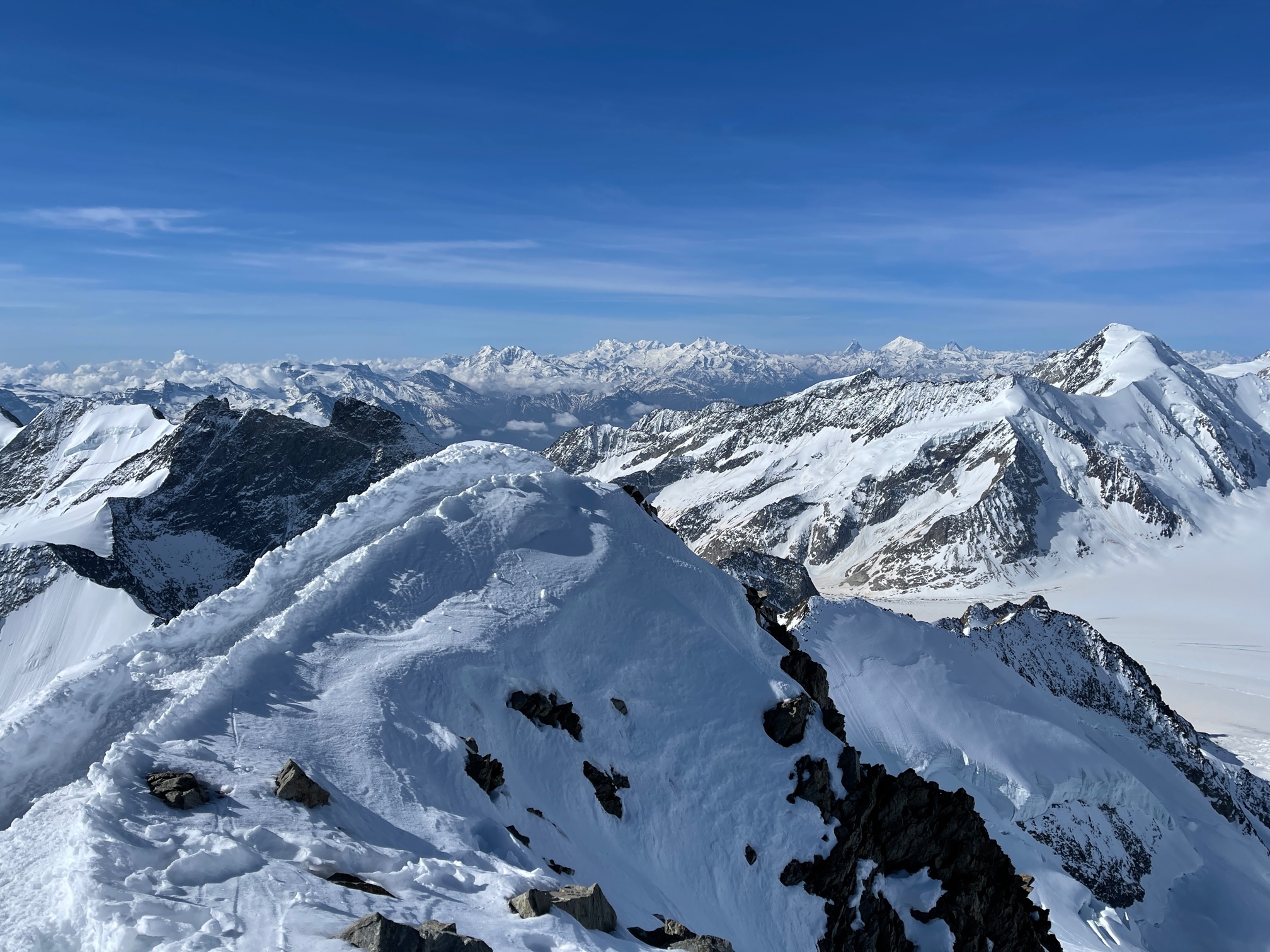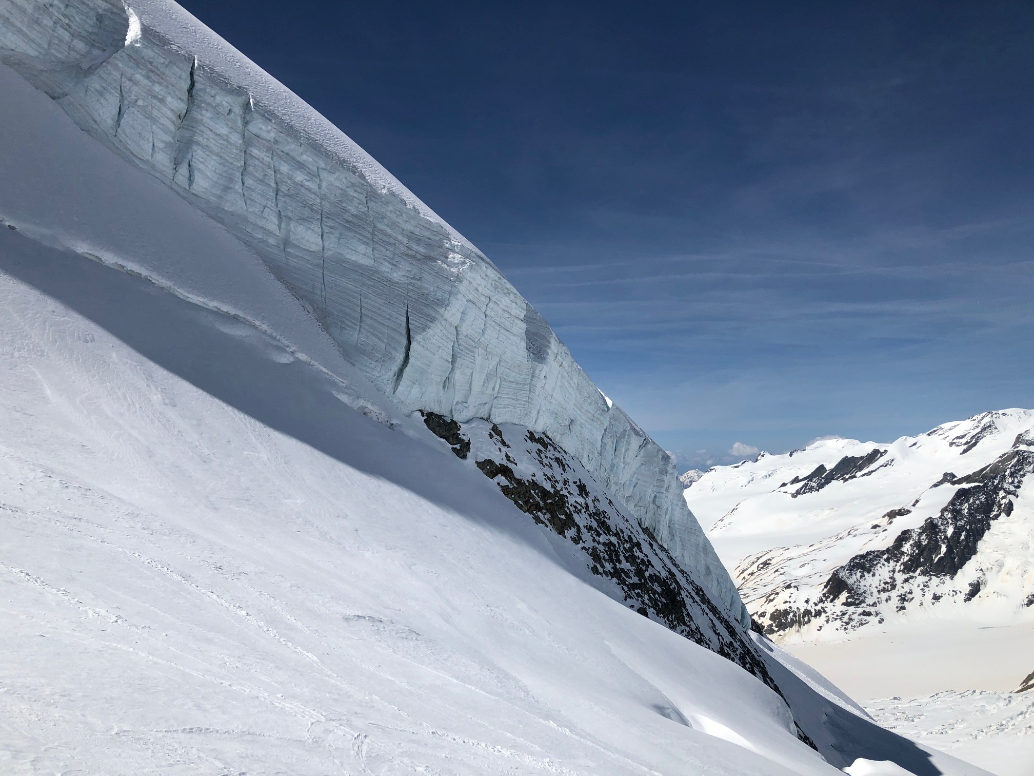 On descend l’Ewigschneefäld sur une neige bien dure, on se laisse glisser paisiblement jusqu’au plat sous le Gross Grünhorn. On peaute et on commence à monter bien tranquillement, la neige est béton c’est juste magnifique. Quelle chance on a d’être ici ! Il y a un groupe devant nous et deux cordées qui arrivent du Grünegghorn, sinon personne.