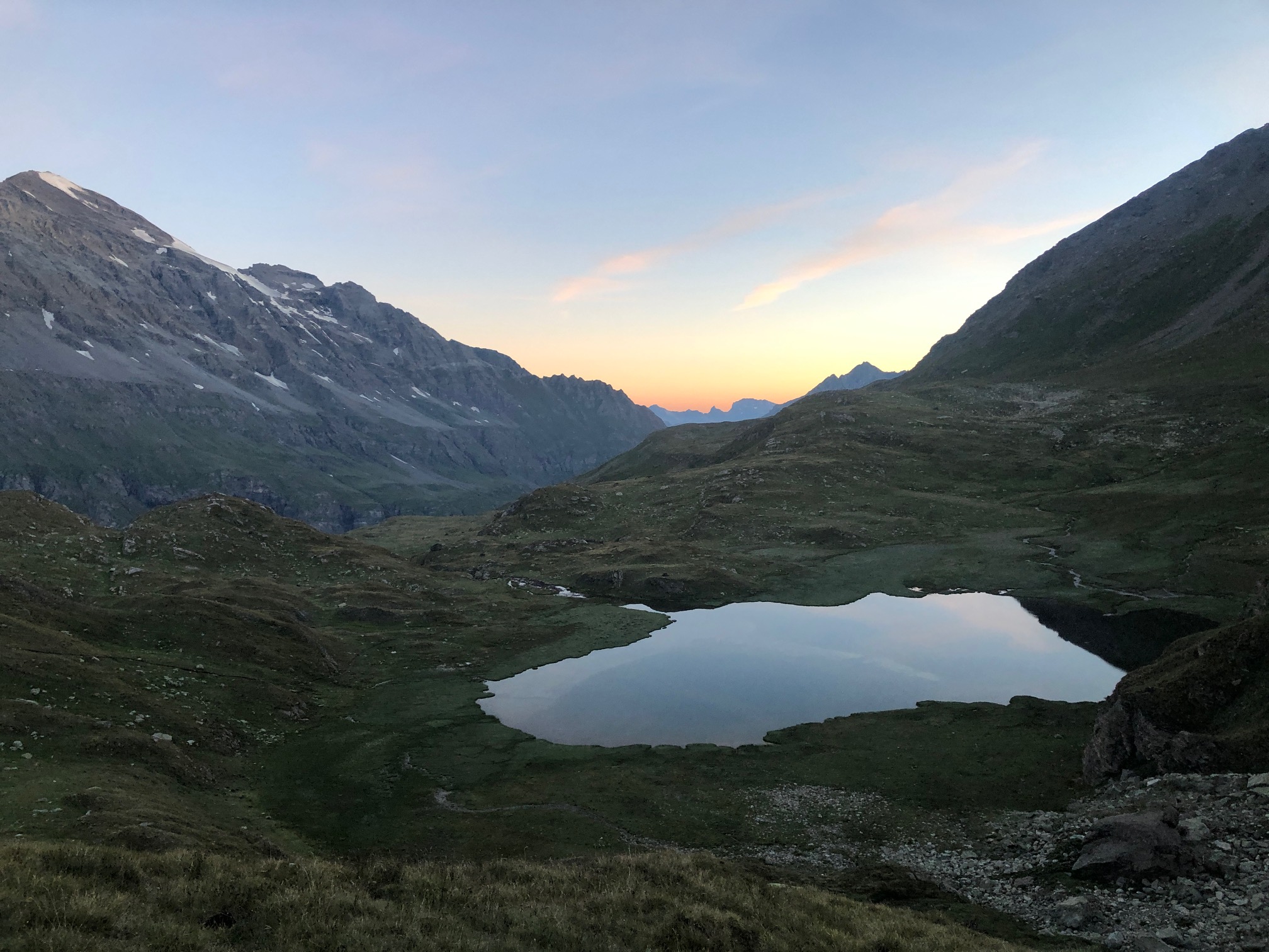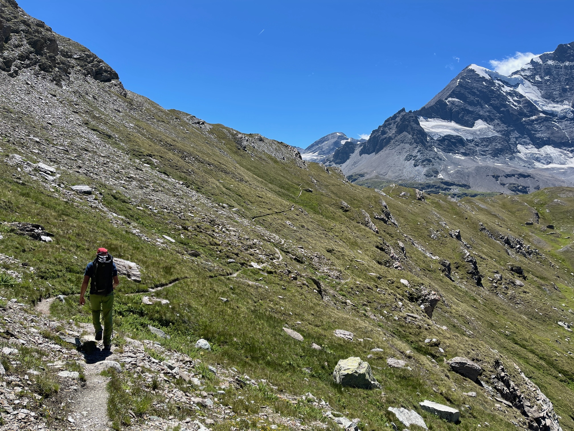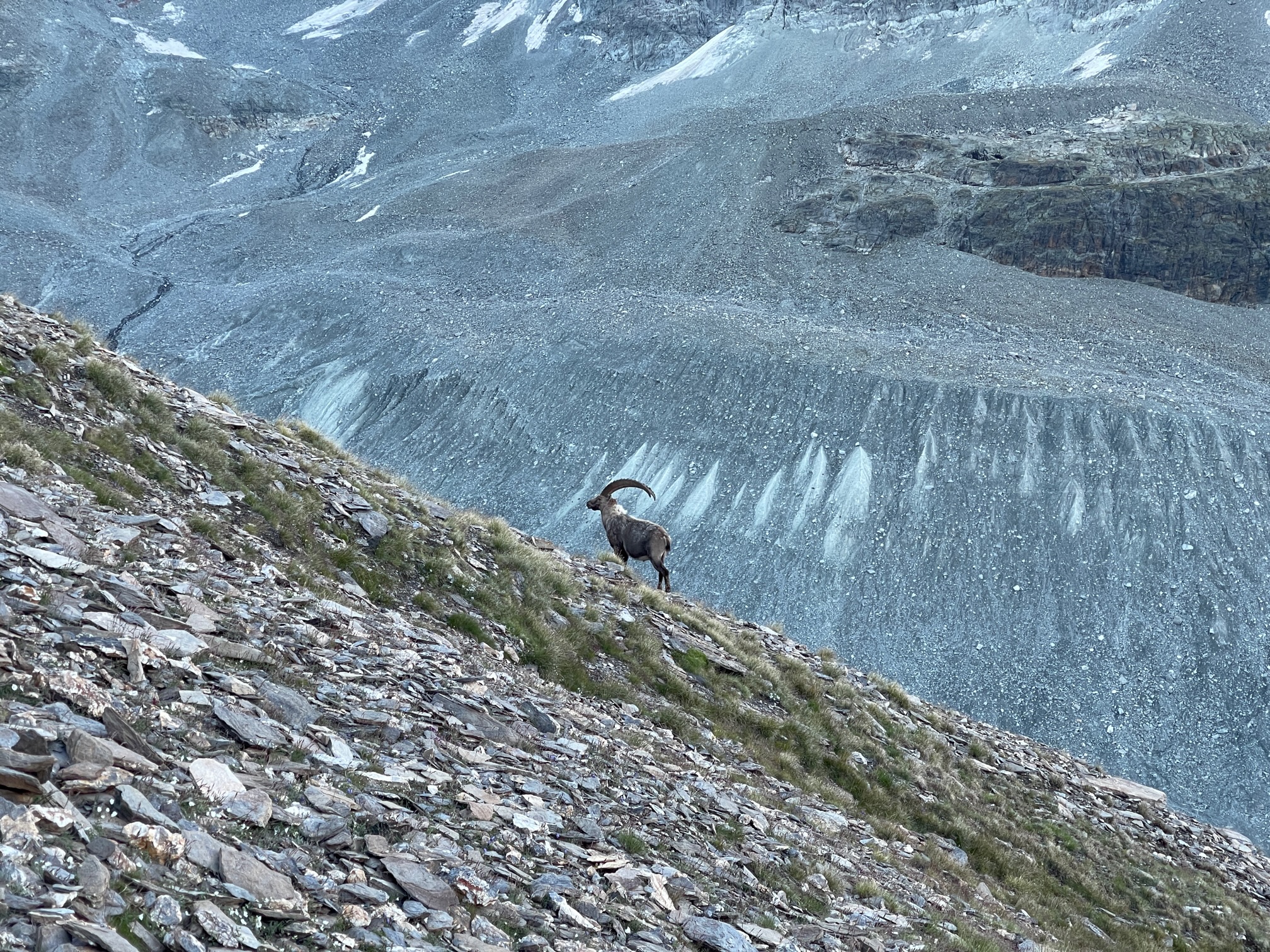 Levés à 4h15, forcés et contraints par notre gardien préféré à dormir une demie heure de plus, on quitte la cabane à 5h sous un ciel limpide. On sait qu’on va commencer par marcher deux heures sur un sentier, donc on ne s’excite pas et on se met en route bien tranquillement. La recherche des lagopèdes et les bouquetins nous occupe l’esprit et on ne voit pas trop le temps passer jusqu’au col de la Lire Rose. Là, on s’équipe et on démarre l’arête, d’abord bien peinard, puis avec quelques jolis passages de grimpe. Le rocher est étonnamment bon, en tous cas sur l’échelle de Bagnes et comparé à nos autres expériences dans le coin, en particulier le Pleureur et la Tour de Boussine.