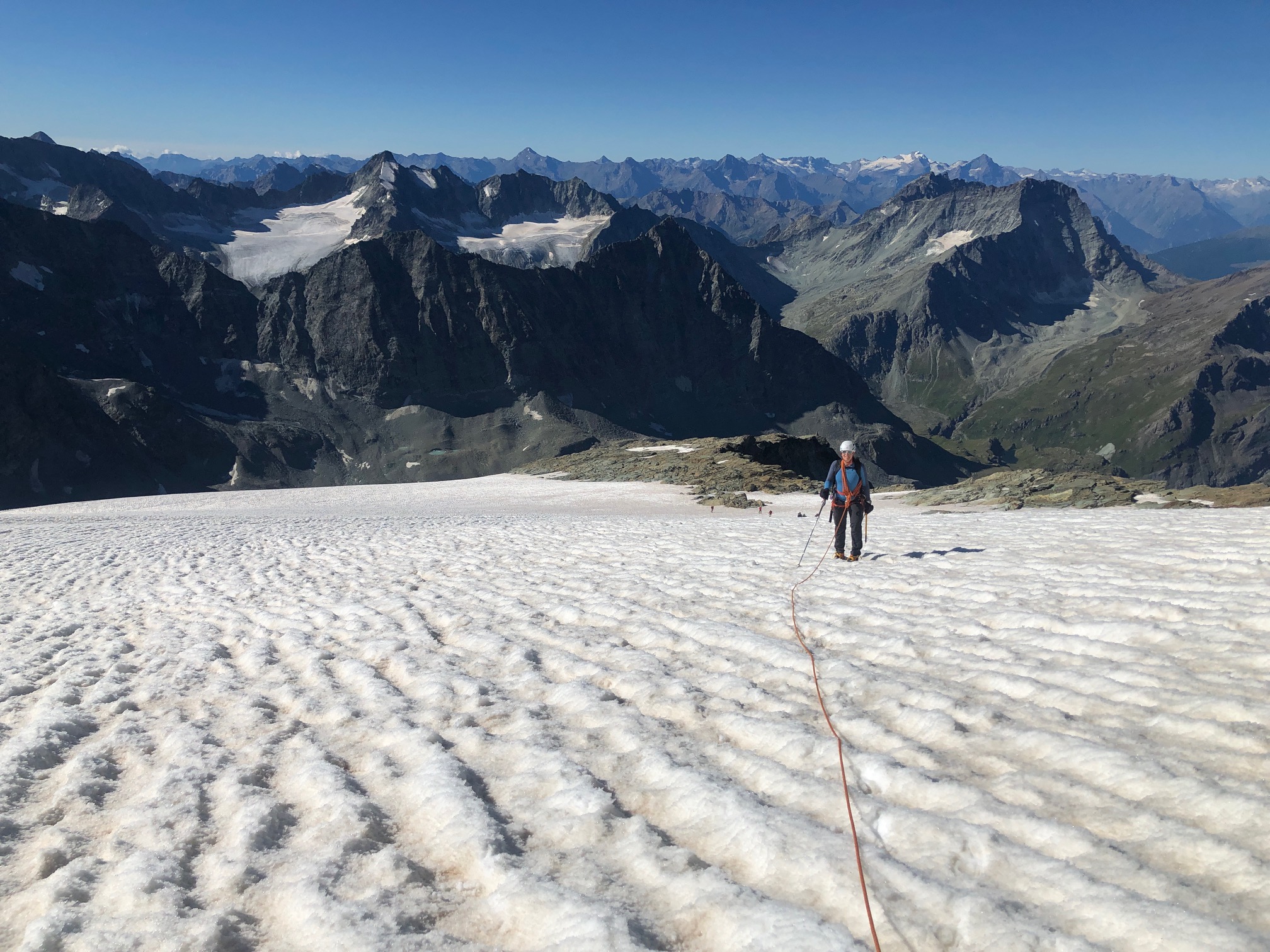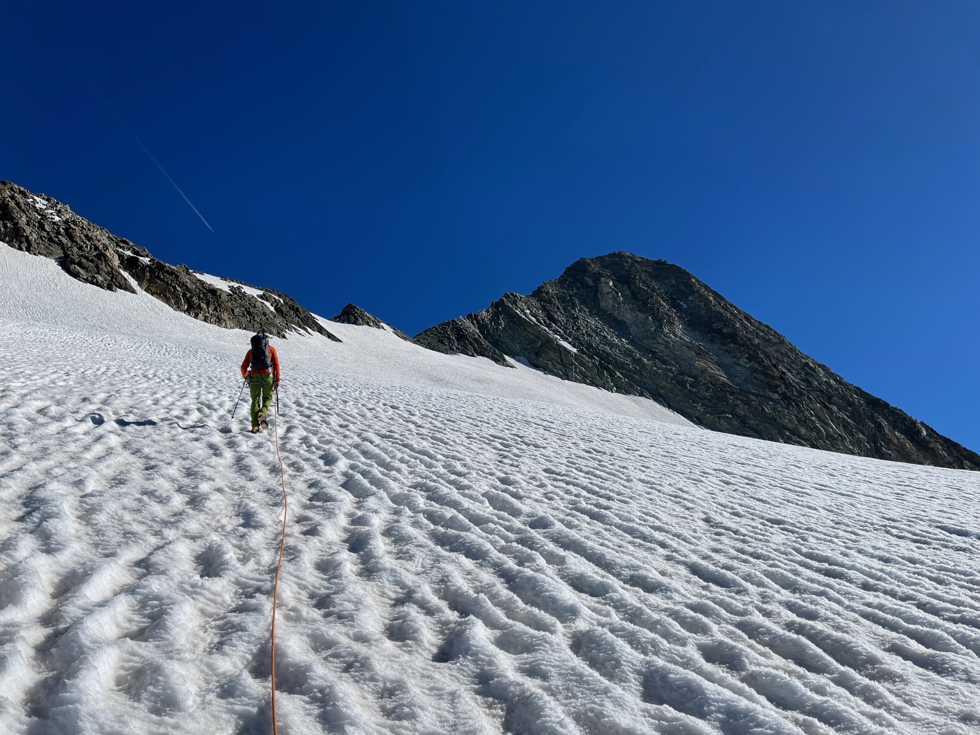 Après la jolie longueur pour contourner la tour rouge, on arrive enfin au soleil. Le cheminement jusqu’au gros cairn n’est plus très long. On chausse les crampons et on traverse le glacier, tout en neige.