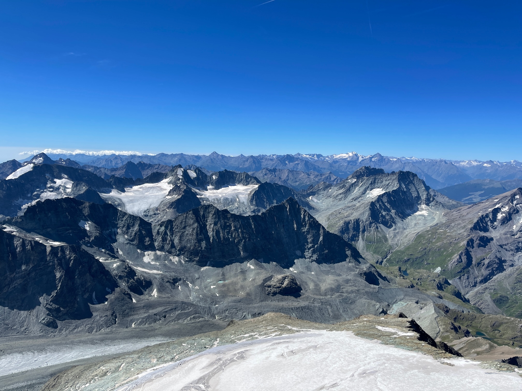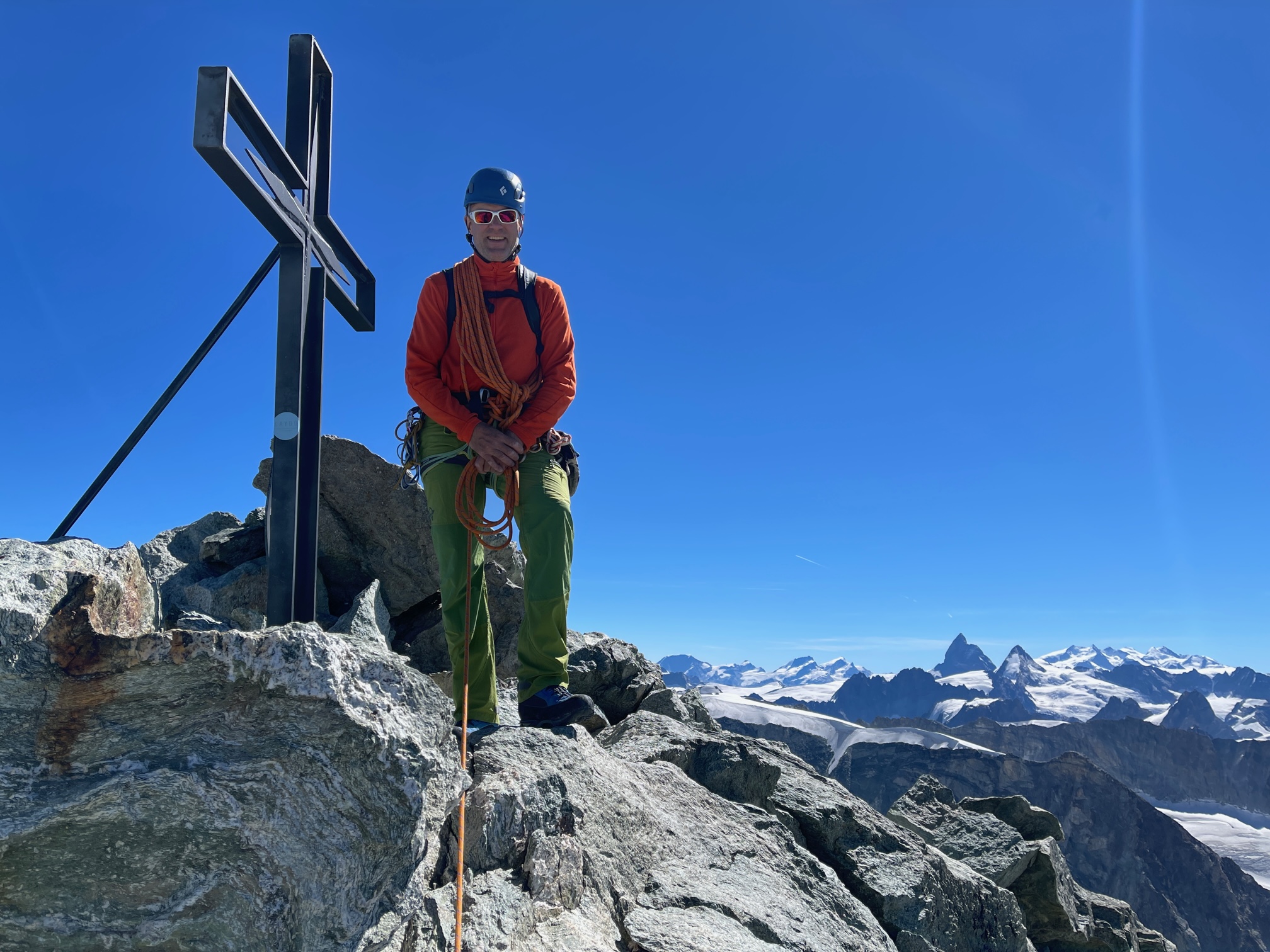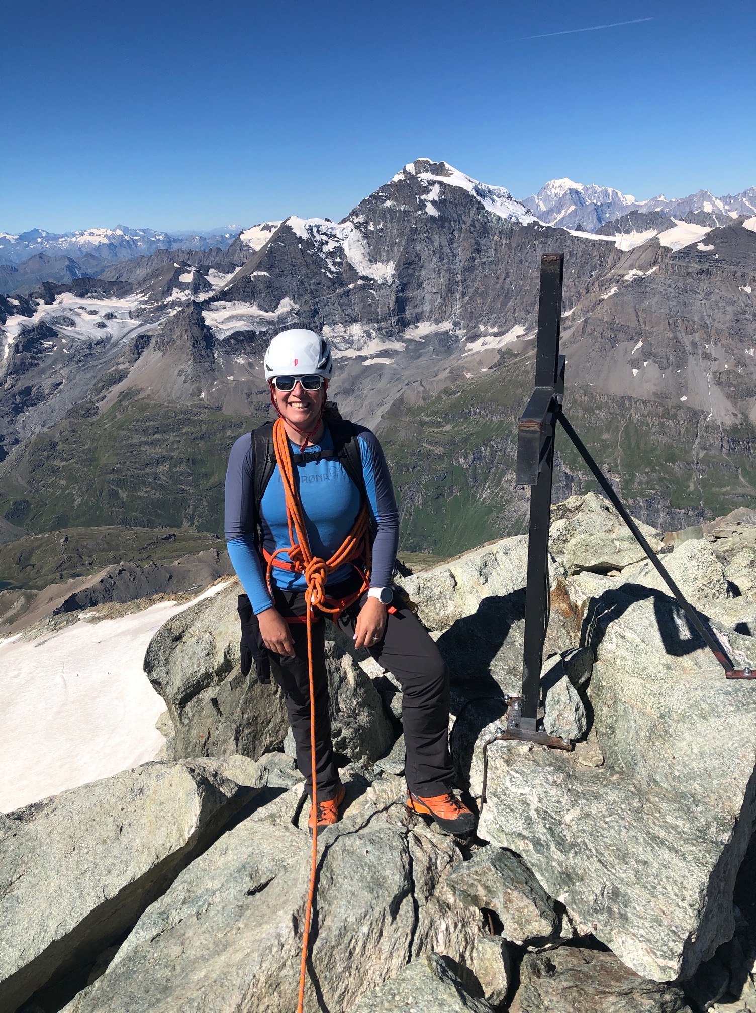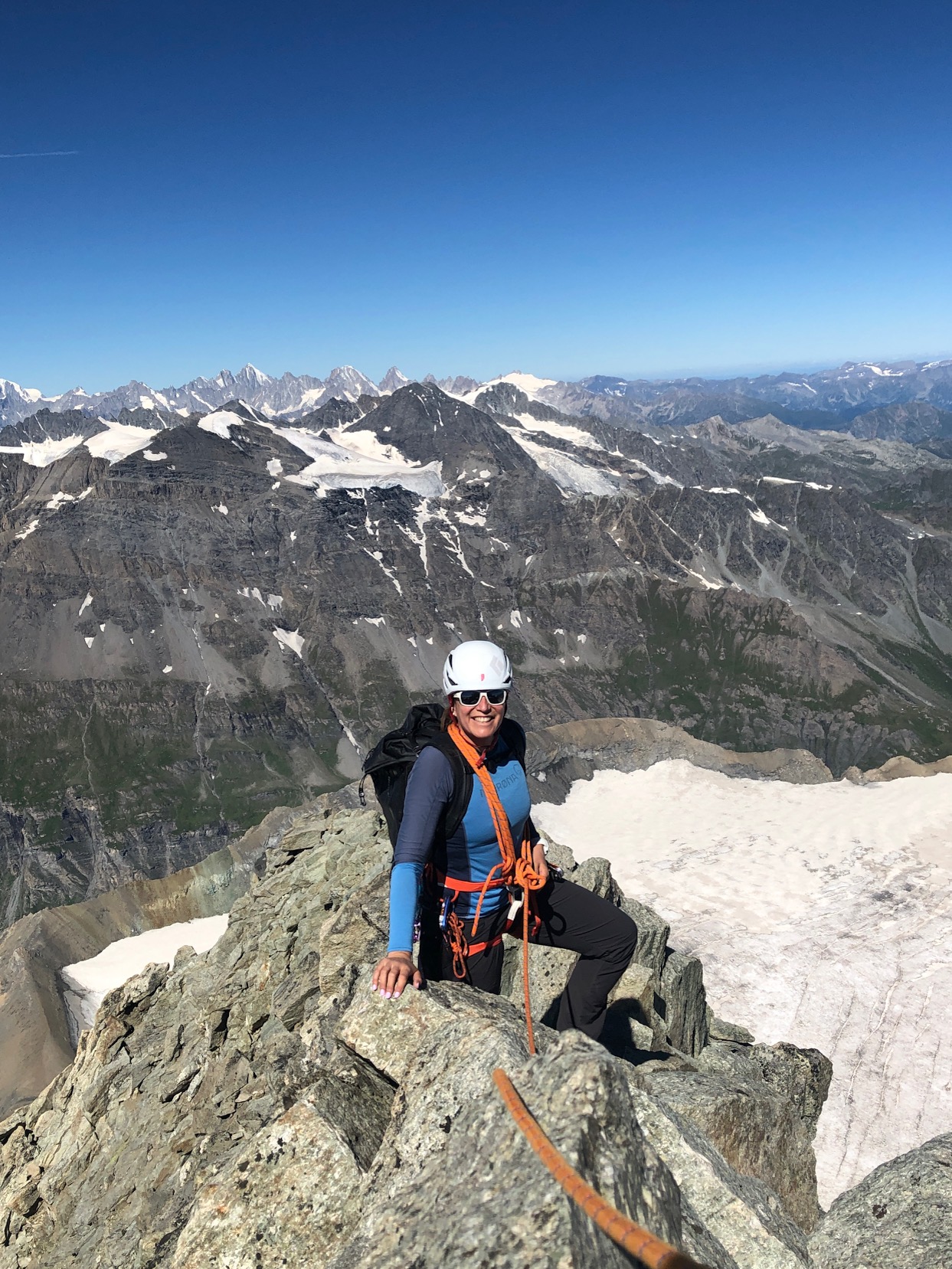 L’arête sommitale est un cran au dessus en terme de difficultés, mais ça reste abordable. C’est quand même impressionnant de regarder en bas de la face N, c’est assez mal plat. On passe quelques instants au sommet, la vue à 360° est majestueuse. Bon ben, reste plus qu’à redescendre. On retourne sur nos pas, sauf que j’aime toujours pas la désescalade. Il y a deux endroits qui sont équipés pour faire des petits rappels et je ne m’en prive pas, le reste ça va plutôt bien.