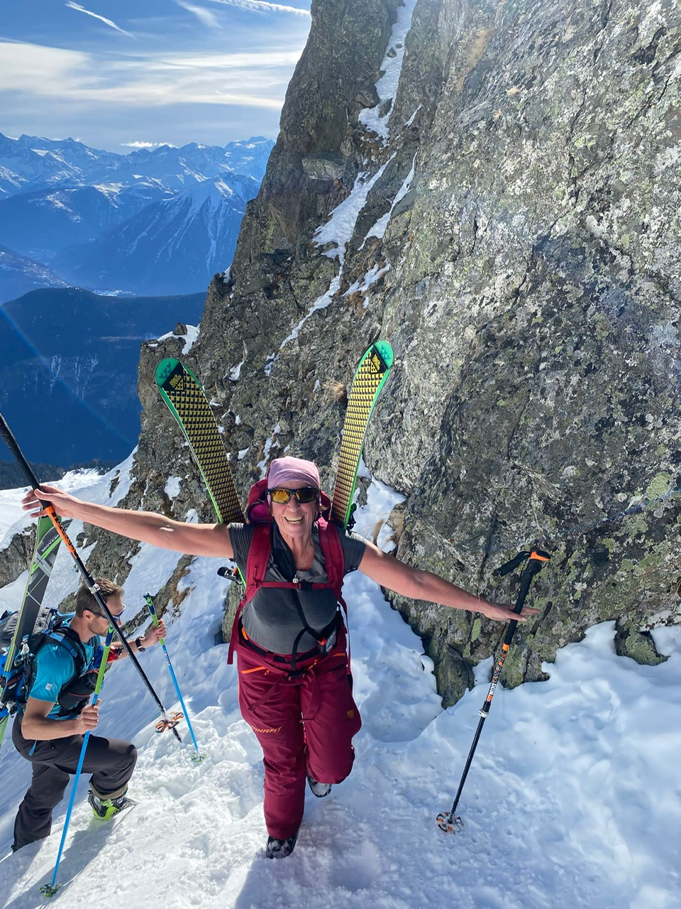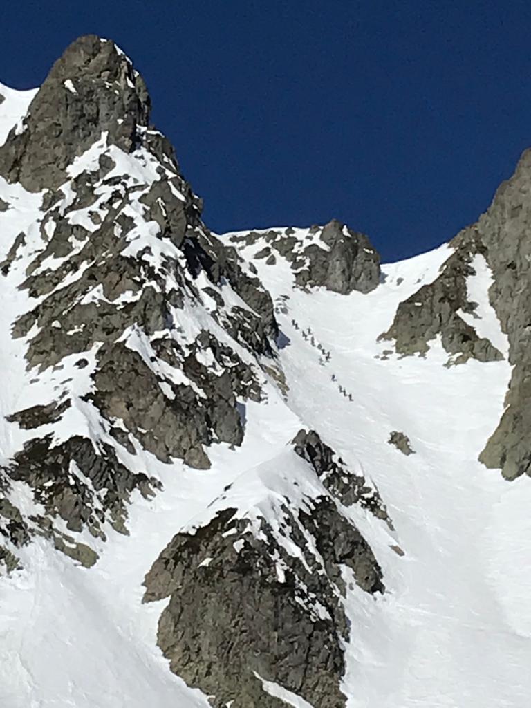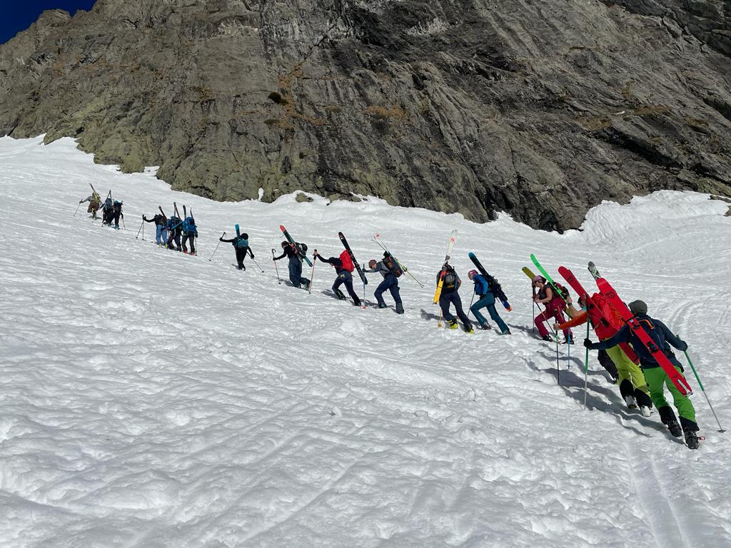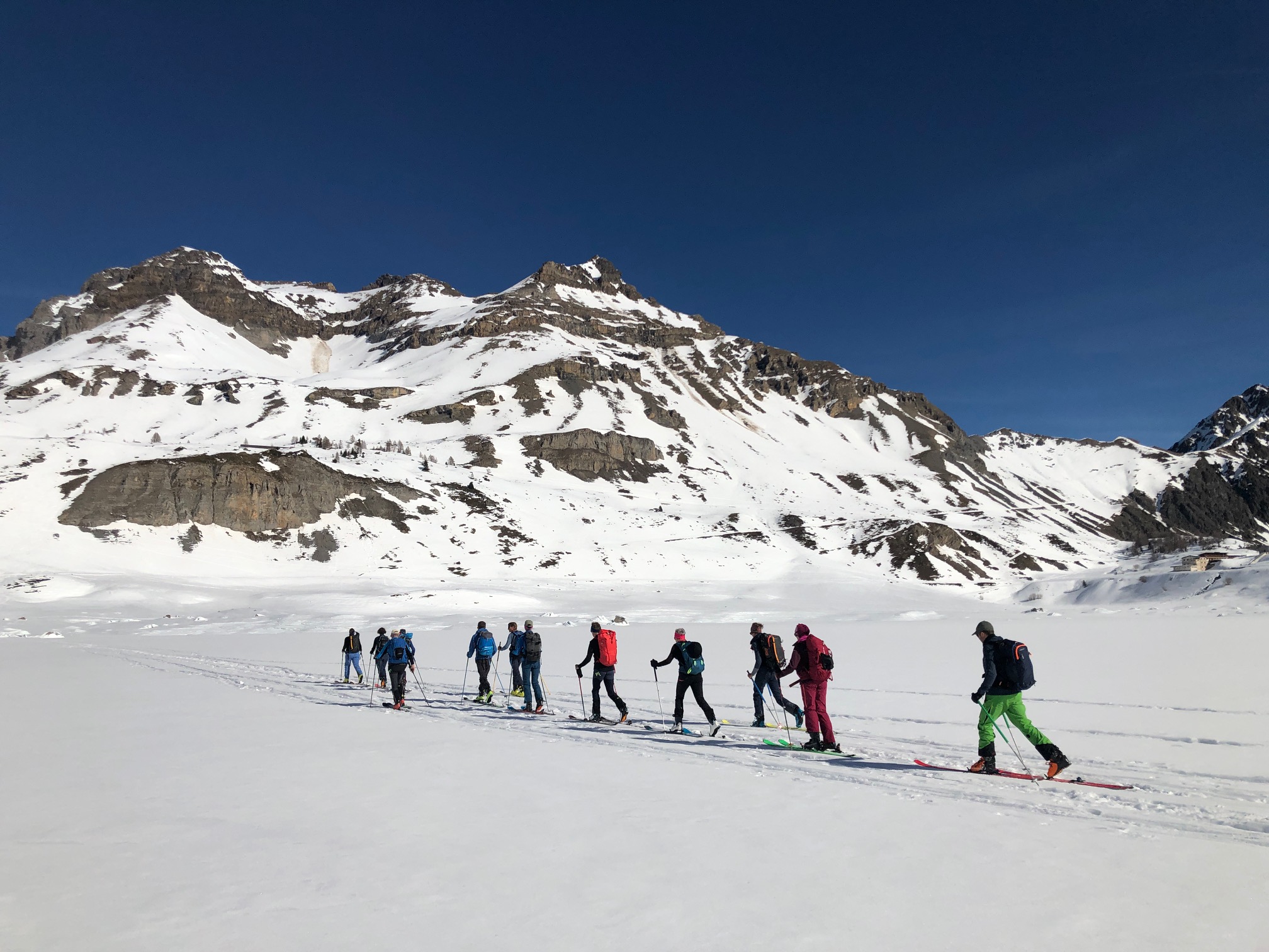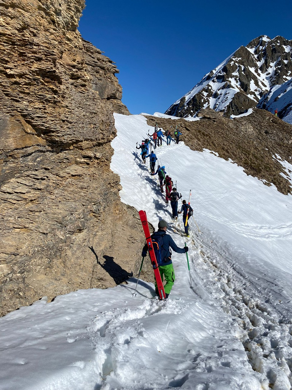 La montée à la Golette d’abord, une première pour une bonne partie du groupe. C’est une jolie montée, et elle était en super conditions. S’en est suivi une belle descente sur le lac de Salanfe, avec quelques pentes encore en poudre… on ne s’attendait pas à ça.