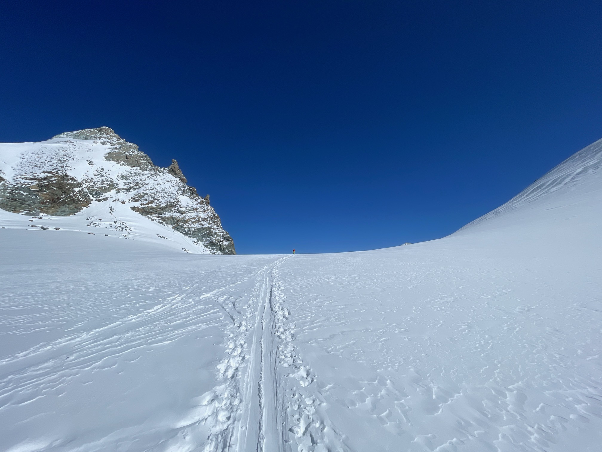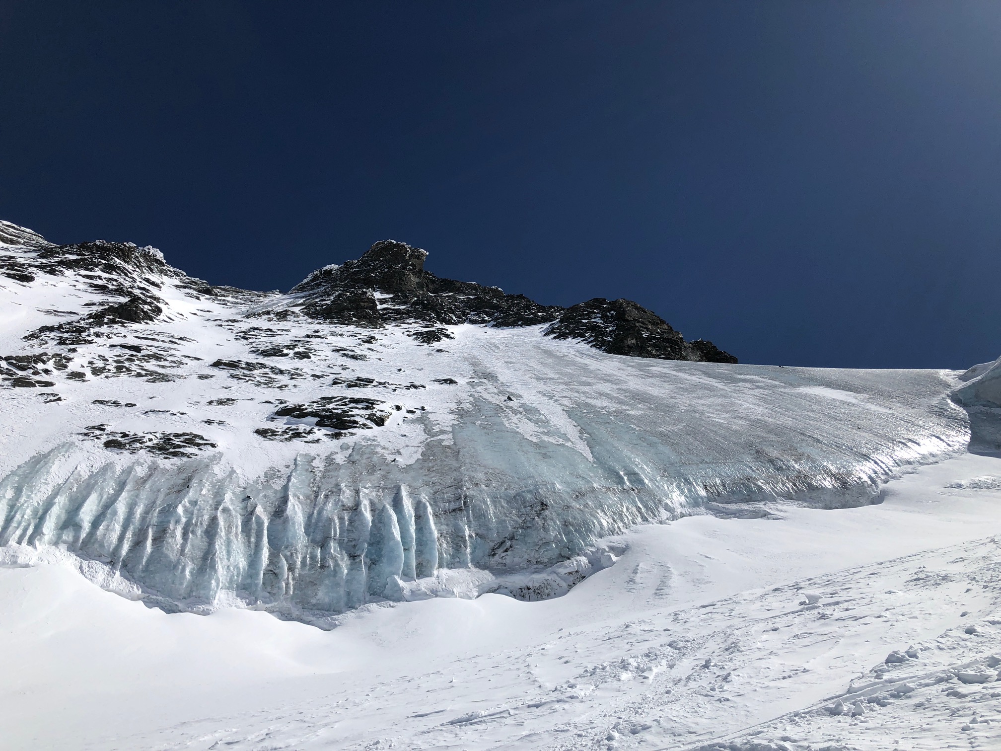 L’arrivée à l’Allalinpass vient nous sortir de notre torpeur avec sa vue dingo sur Weisshorn d’abord, puis sur tous les 4000 entourant Zermatt. Trop beau. On croit faire les malins à essayer de couper au plus haut pour ne pas perdre trop d’altitude, mais on va se faire un peu chier à slalomer entre des crevasses monstres. En montagne, le chemin le plus court n’est pas forcément le plus rapide, on devrait le savoir depuis le temps. On fera mieux au retour.