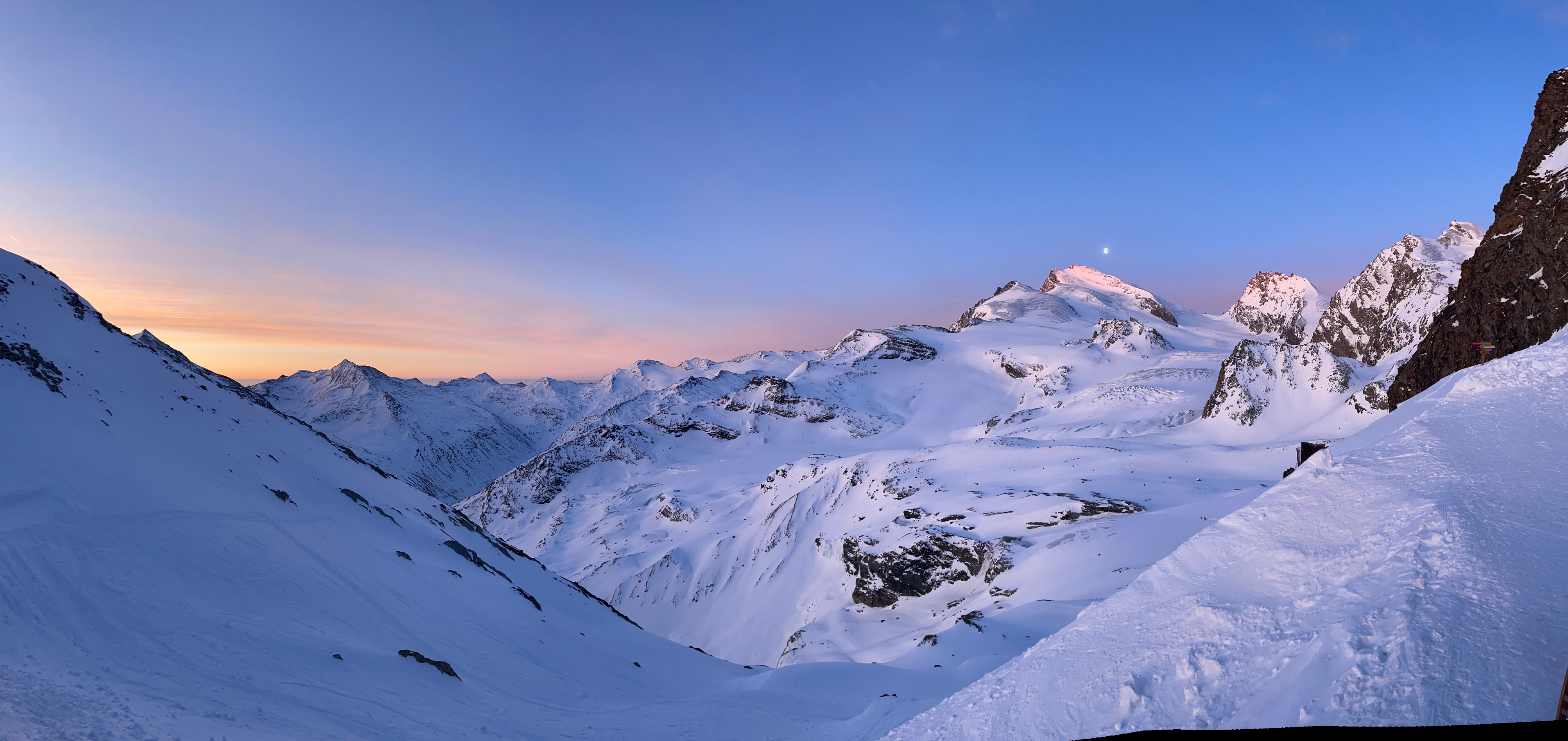 5h55, ciel étoilé, froid vivifiant, on descend les 150m sous la cabane. C’est le meilleur moment de la journée: je suis encore en pleine forme, on est tout seuls et le spectacle que nous offre la nature est dément. On a déjà remonté ce glacier de l’Allalin plusieurs fois, on s’encorde et on enclenche le pilote automatique. A 20m l’un de l’autre, les discussions sont inexistantes et chacun s’enferme dans sa bulle et dans ses pensées.