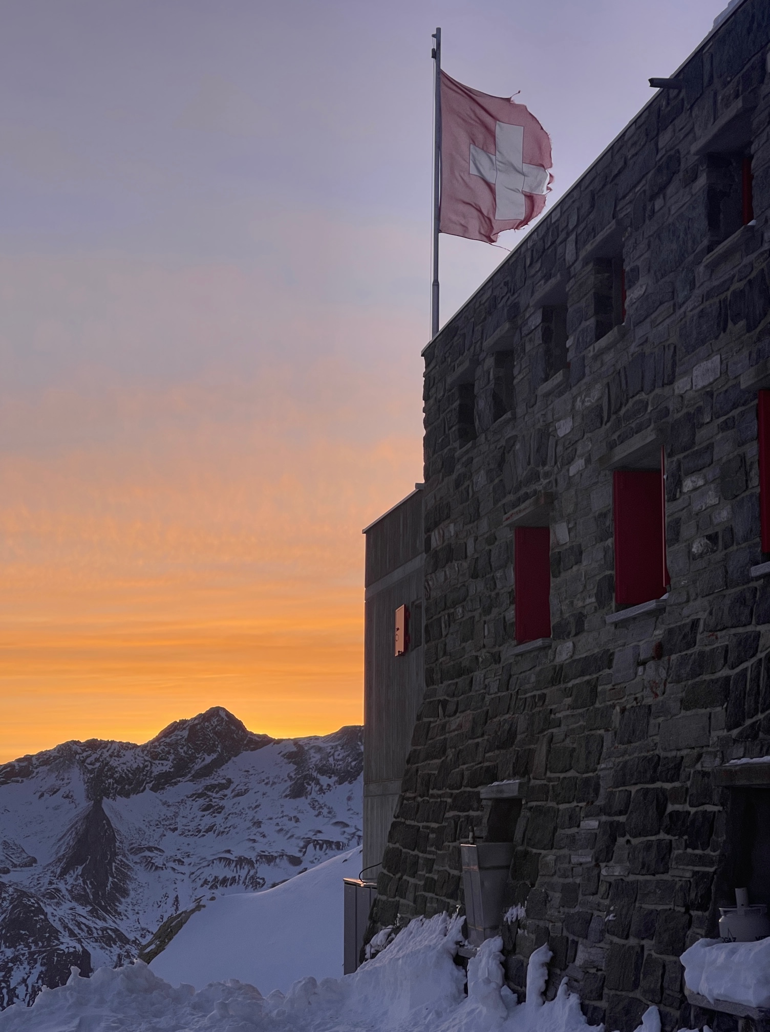 La descente est top. Neige nickel (heureusement, parce qu’on a plus trop de jambes…), le glacier trop beau, on repeaute une première fois pour repasser l’Allalinpass et une deuxième fois, moins rigolotte, pour remonter à la cabane. Heureusement, ça sent la p’tite mousse !