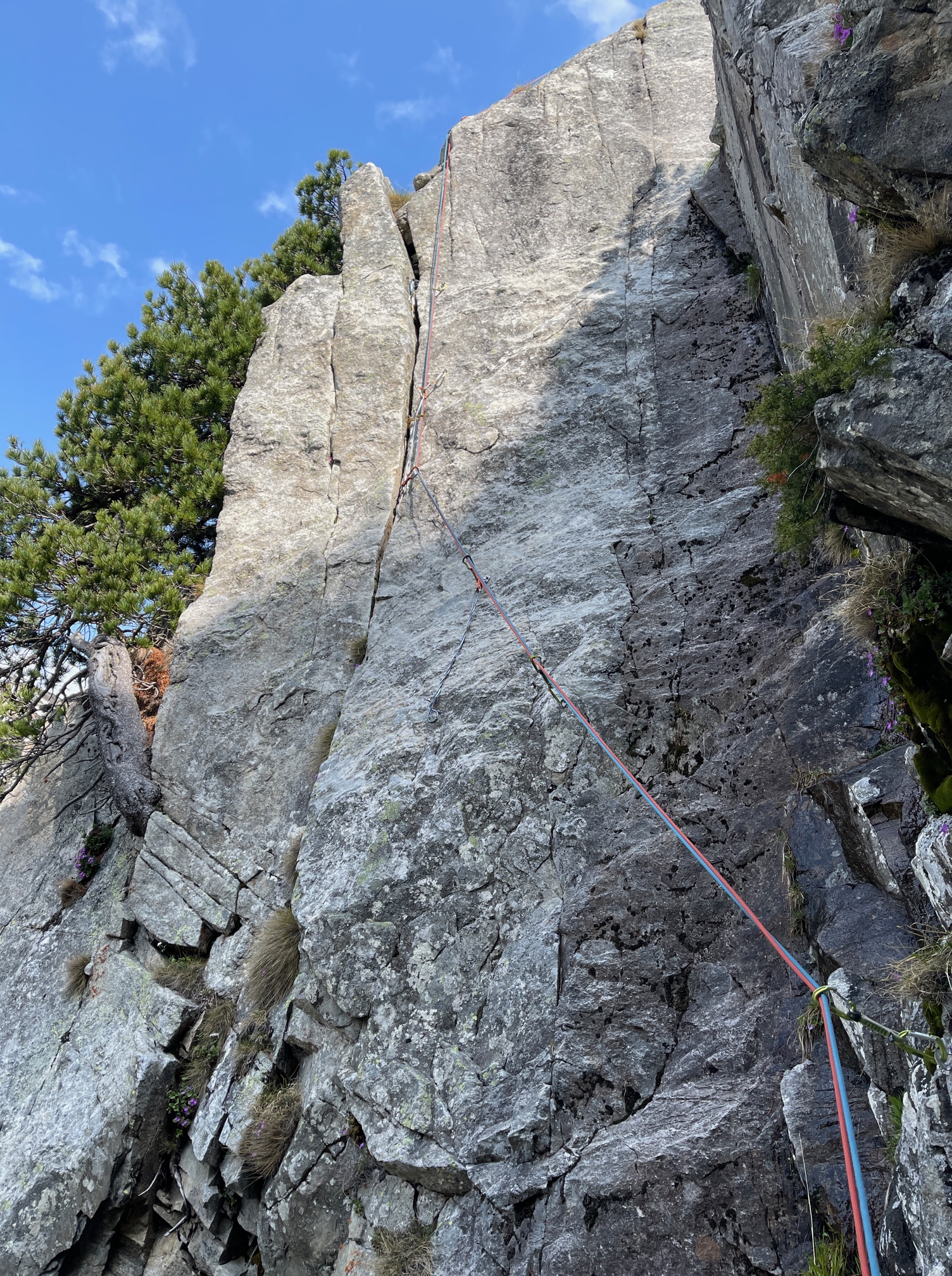 Avec le topo en poche, on prend le temps d’observer le pilier de loin et de repérer l’attaque. Ça a l’air super beau. L’approche est évidente, même nous on ne s’est pas perdu, c’est dire. Pål part dans la première longueur. Gloups. Ah ouai quand même, ça réveille ce départ. Je l’entend un peu pester, ça promet pour moi. Bon à mon tour je me lance, Les premiers mètres sont difficiles, comme souvent je me demande ce que je fous là, je me rappelle que c’était mon idée et que des fois je ferais mieux de lire un bon polar plutôt que de chercher des topos sur internet…. Mais après quelques instants, tout va bien, le rocher est super bon, on est tout seuls, ça promet une belle journée.