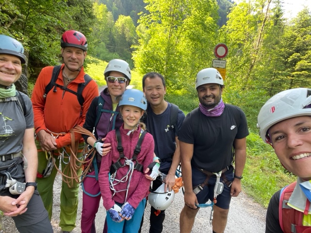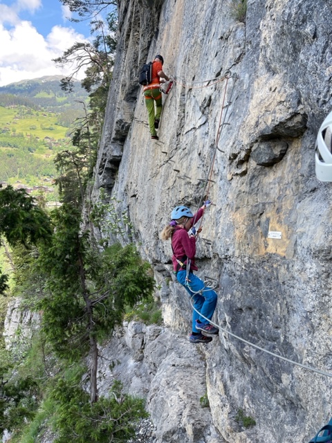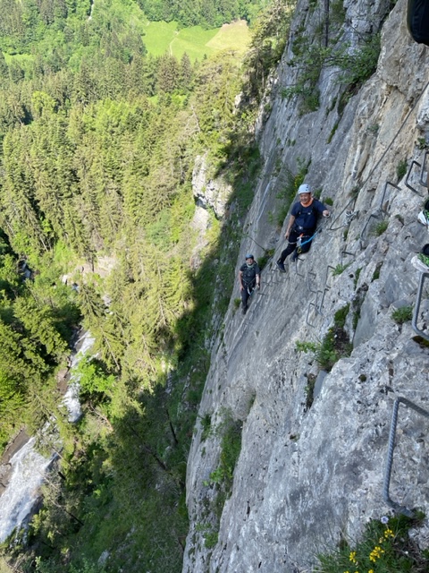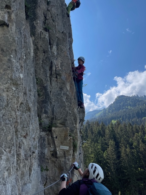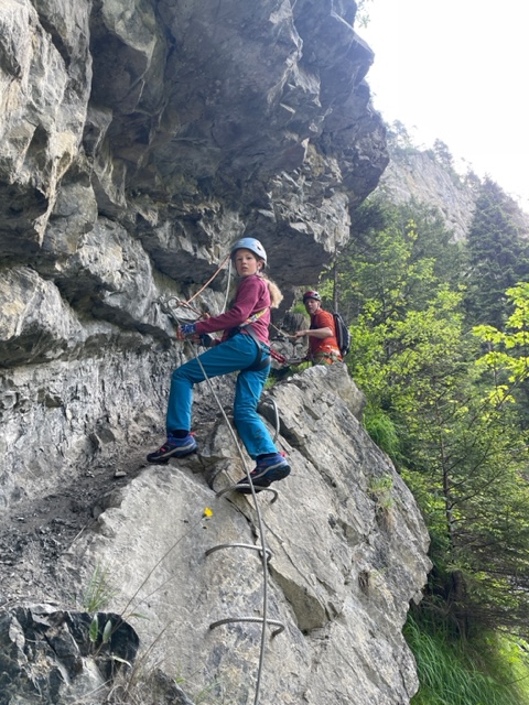 Je ne vais pas vous mentir, ce n’est pas ma passion ces via ferrata. Mais ça faisait des années qu’on me demandais d’en organiser une pour le club du boulot et finalement, je l’ai fait. Je doit reconnaître que contre toute attente, j’ai eu beaucoup de plaisir. C’était probablement dû à la présence de Selina, 12 ans, la fille de mes collègues. A la base cette sortie n’était pas prévue pour des gamins, mais on a fait une exception. Parce que Selina, c’est une gamine incroyable. Elle est venue grimper avec nous depuis qu’elle à 5 ans, on savait qu’elle n’aurait aucun soucis. Par contre, elle ne fait pas le poids requis pour utiliser les longes de via ferrata, Pål l’a encordée et ils sont partis devant.
