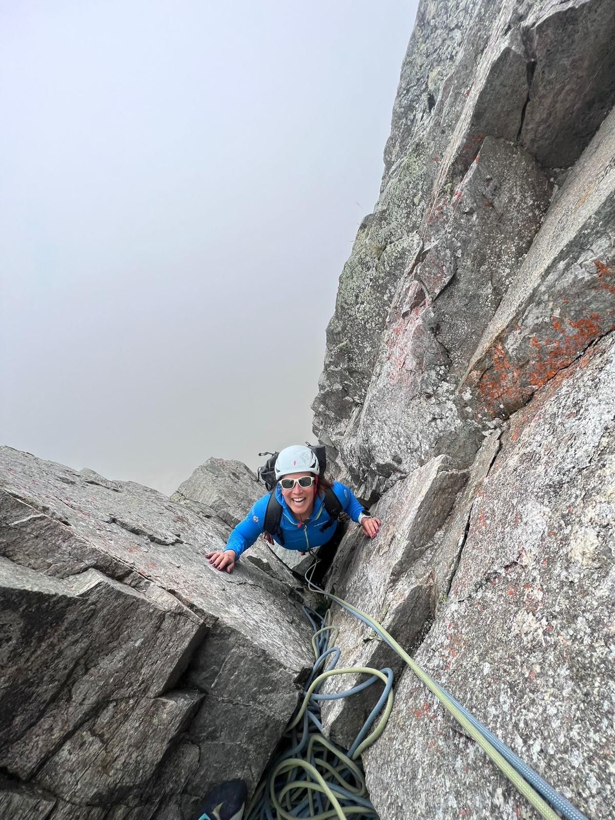 Les longueurs 2 et 3 ne posent pas de problème, le rocher est incroyable et on avance correctement. Vient ensuite une longueur bien physique dans une fissure-dièdre très cool. Avec ma condition physique sans faille, je dois bien évidemment faire quelques pauses mais j’arrive au sommet dans trop d’encombres.