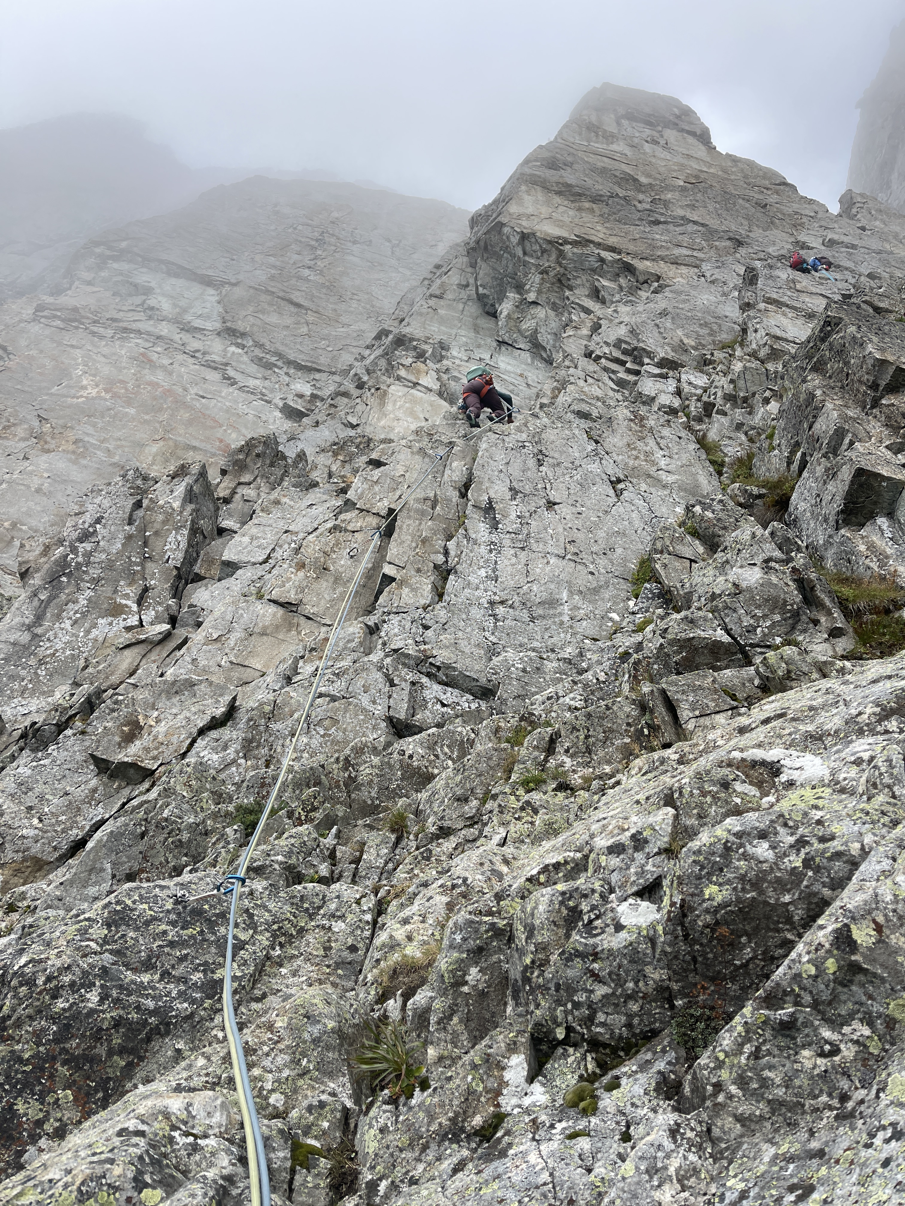 Ah mon tour: mon style oscille entre le phoque et le rhinocéros, mon souffle par contre, c’est clairement celui du boeuf. Ajoutez à cela mes auto-encouragements pathétiques et vous avez le tableau ! En plus au milieu de la longueur, j’ai la bonne idée de me retourner: alors que nous avions été dans le brouillard jusqu’ici, je découvre un vide intersidéral et Chamonix 1500 m plus bas.