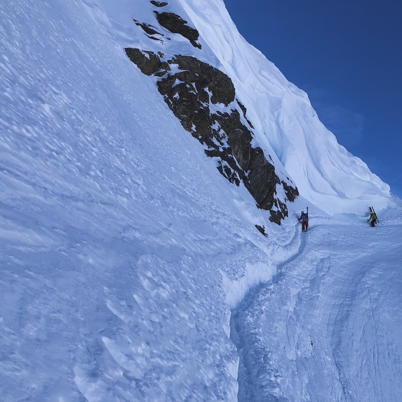 Puis on arrive au passage redouté, la Früestücksplatz. On a beau essayer d’avoir des infos, finalement, tant qu’on y est pas, difficile de savoir dans quel état c’est. Je marche jusqu’au bord et pour moi et mes deux compères, c’est clair qu’on opte pour la descente en crampons. Deux nénéttes super balaises s’élancent à ski, avec des p’tites frites pourries d’ailleurs, j’en ai un haut le coeur à les regarder. Mais c’est vraiment la grande classe d’avoir un niveau pareil. En crampons, ça va bien, mais même si c’est très esthétique, ça ne donne pas envie de pétouiller dans cette pente sous cette corniche géante.