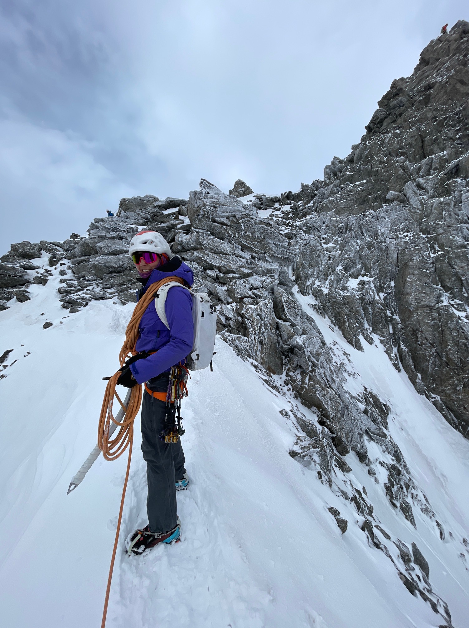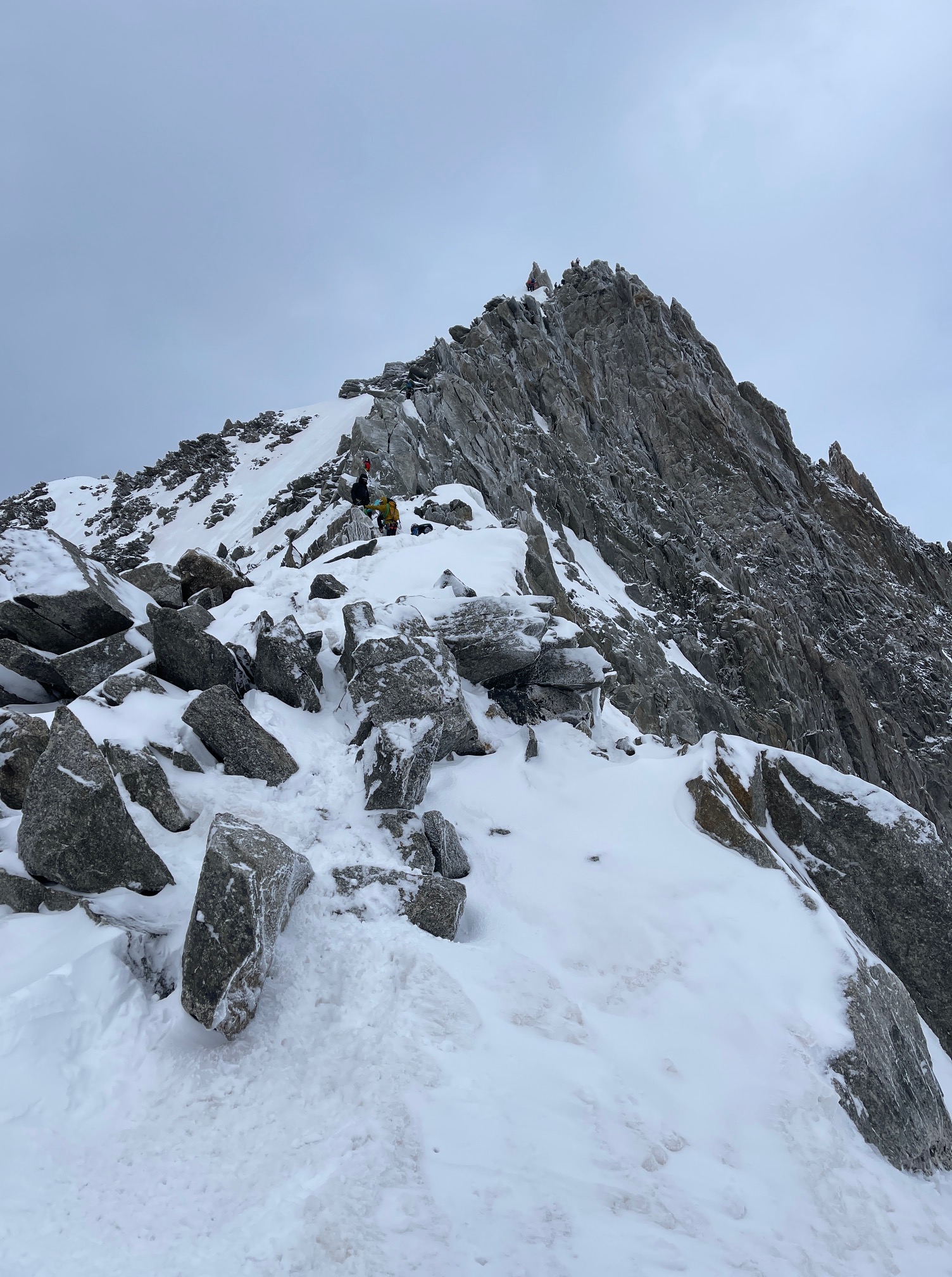 C’est la foule des grands jours sur cette arête, mais les gens sont sympas et l’ambiance bon enfant. Les rochers sont givrés et j’ai un peu de mal sur un petit pas au début, mais le reste se passe plutôt pas mal, l’ambiance est vraiment chouette.