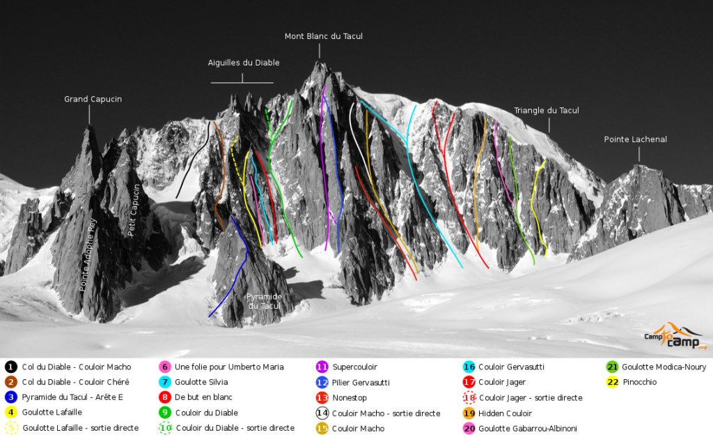 Le lendemain de notre virée aux Marbrées, nous sommes donc parties pour la Pyramide du Tacul. A ne pas confondre, comme je l’ai fait toute la journée et la semaine qui a suivit, avec le Triangle du Tacul, beaucoup plus haut, beaucoup plus mixte et beaucoup plus pas à ma portée. Vous verrez bien la différence sur cet excellent schéma trouvé sur Camp2camp.