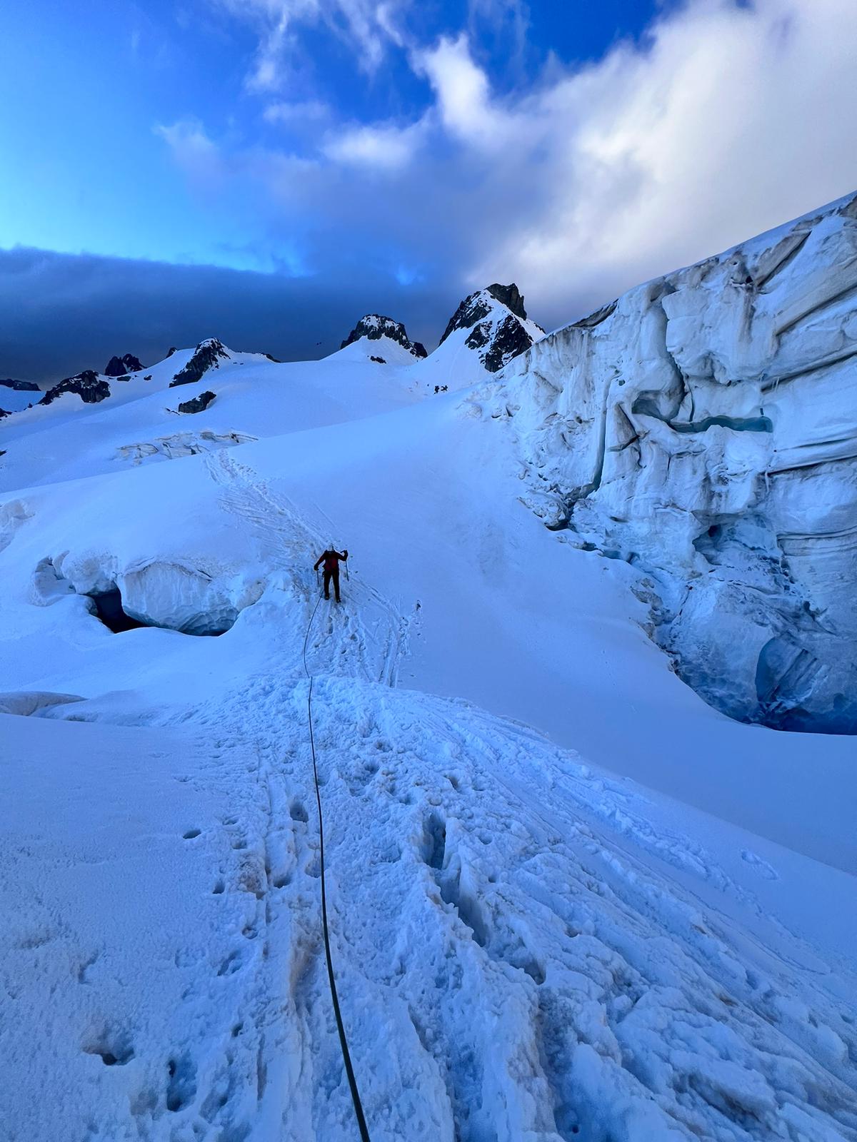Le passage de la rimaye me fout les boules, alors qu’objectivement ça passait super bien, mais je n’aime toujours pas me retrouver au dessus d’un gros trou dans une neige inconsistante. beurk. On arrive au pied de la voie, on laisse tout notre matos lourd ici et on met les chaussons. C’est parti.