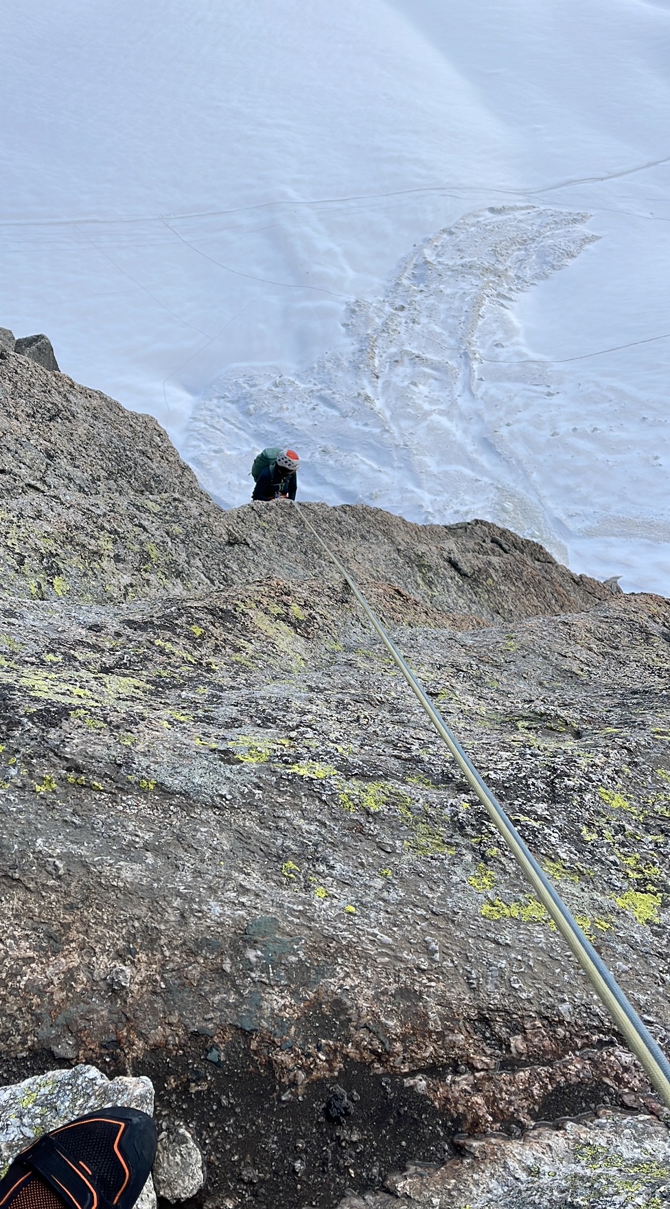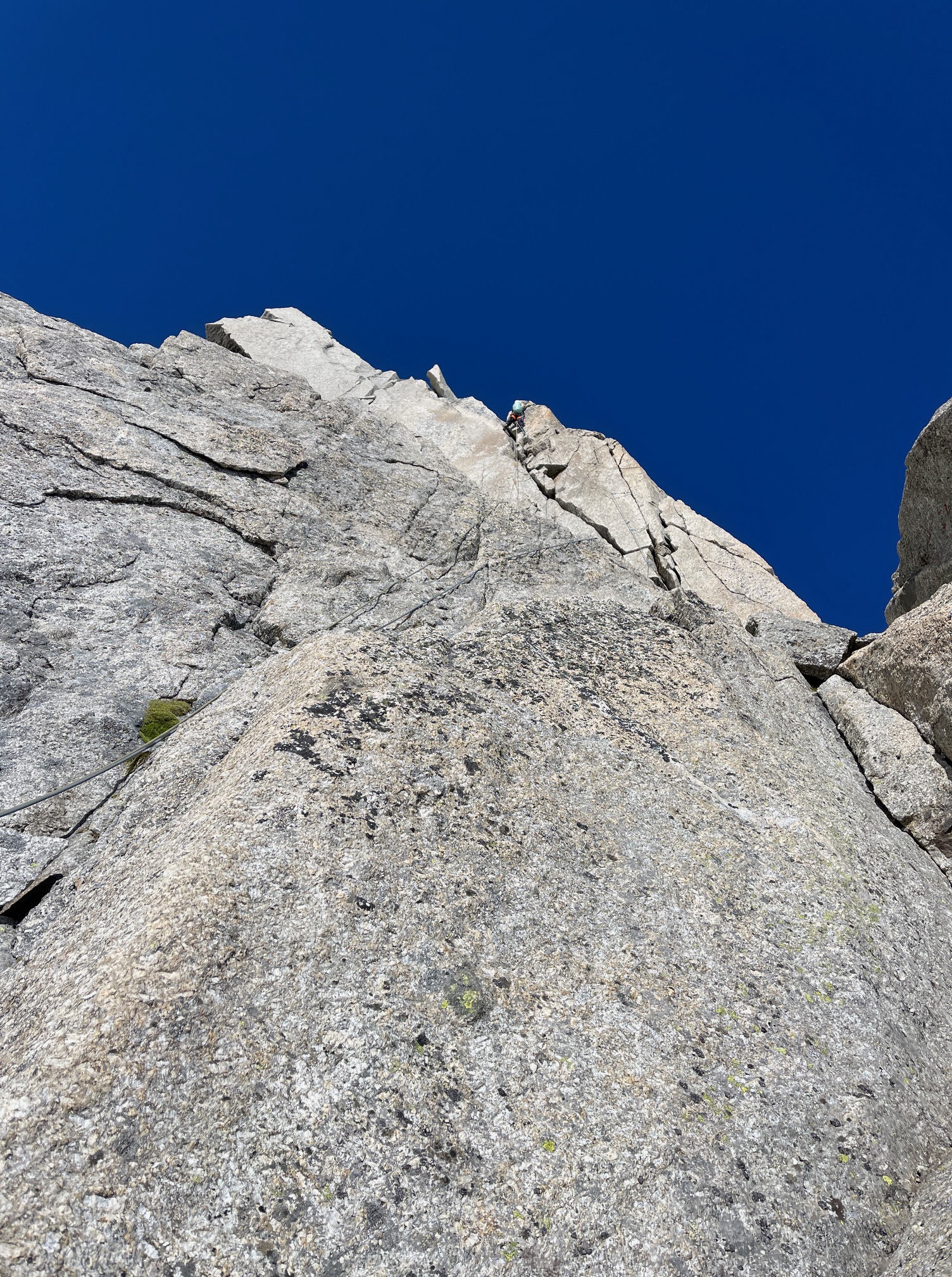 Les deux premières longueurs sont super faciles et jolies. On n’a de loin pas trouvé que des relais chaînés comme c’était noté dans le topo, mais bon, On est clairement au bon endroit. Une cordée de Gallois très sympa est derrière nous et on se marre bien.