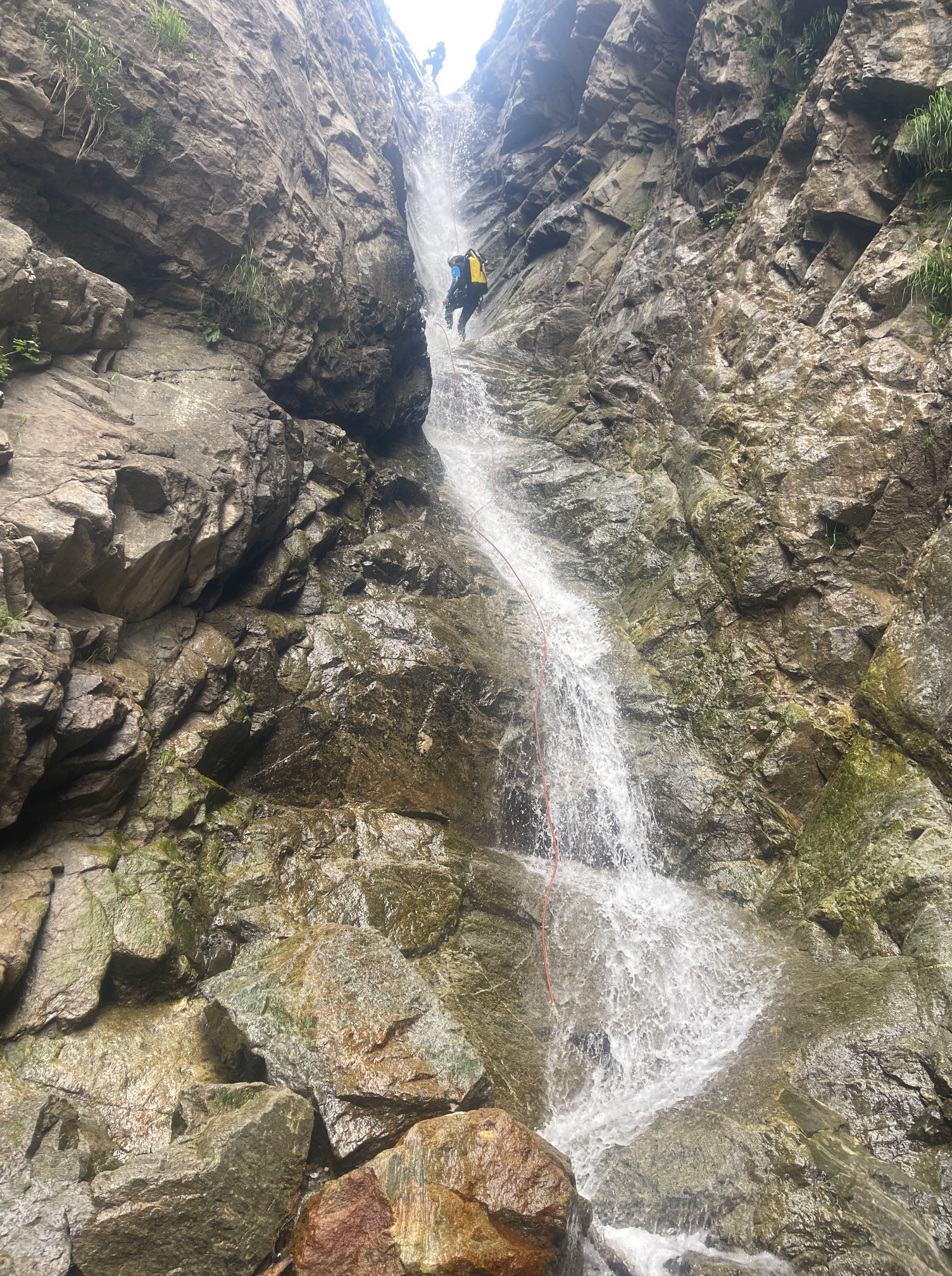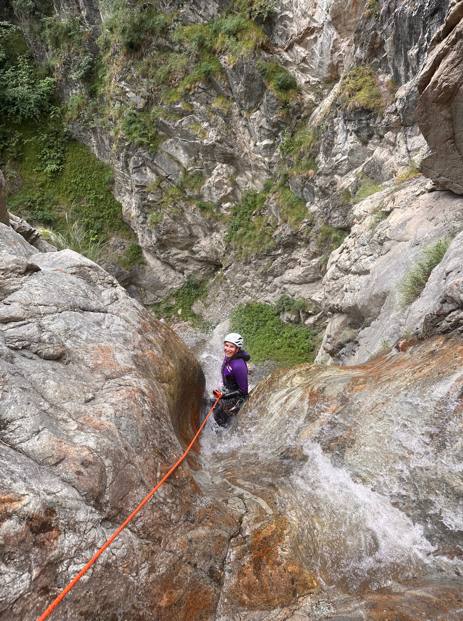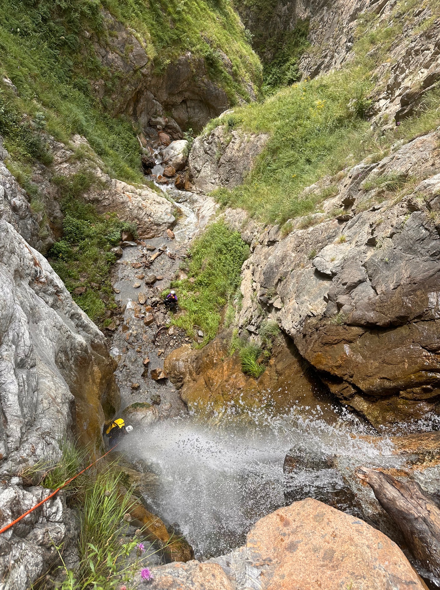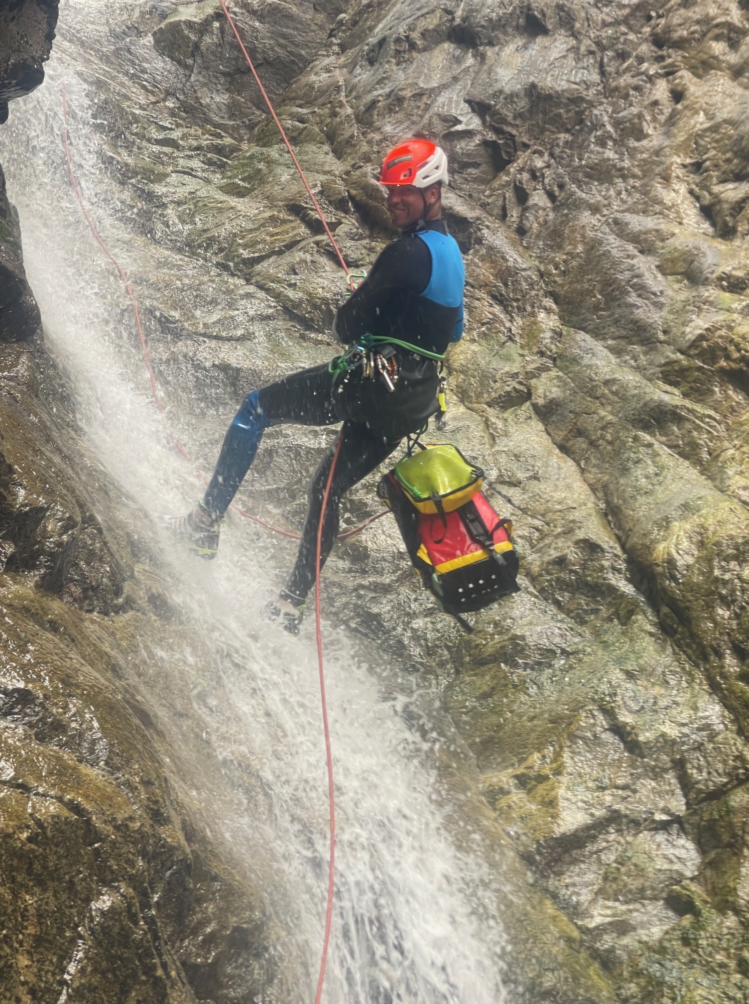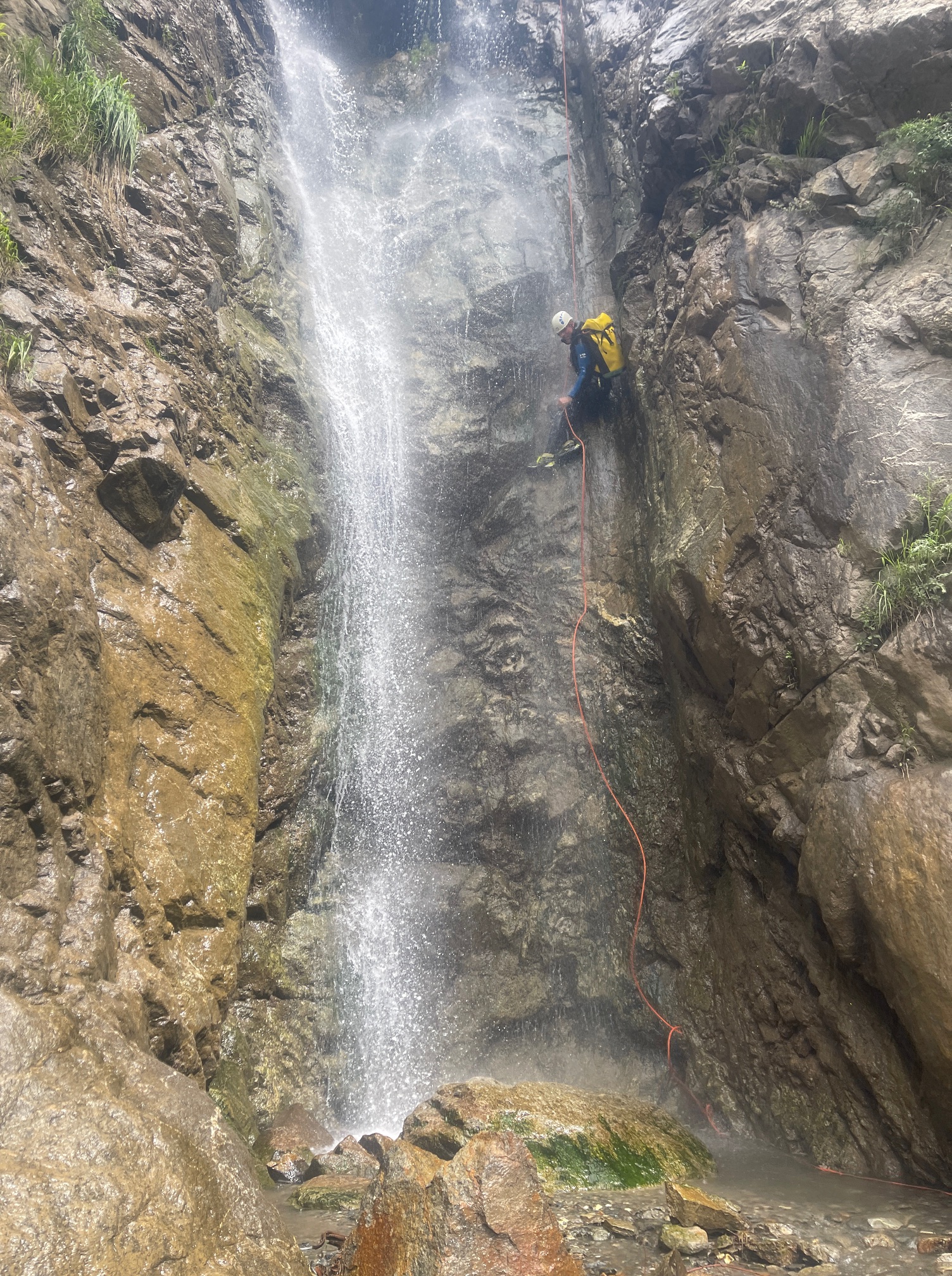 Pål a pris sa corde et équipe plusieurs rappels et mains courante, il est assez à son affaire. Moi par contre c’est vraiment pas ça, une fois sur deux je coince la corde. Quelle gourde. Il faut que je m’améliore si on veut retourner faire ce canyon tous les deux. Jérôme a trouvé très rigolo de nous laisser les deux sur un relai suspendu pour équiper le rappel, je crois que son but était de se marrer pendant qu’on s’entretuait. Mais son plan machiavélique à échoué 😅 (pour cette fois).