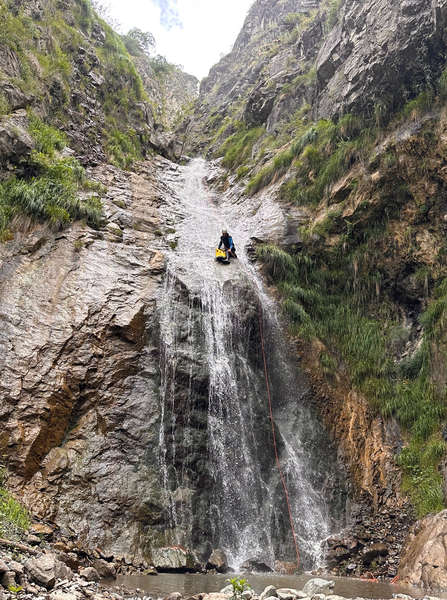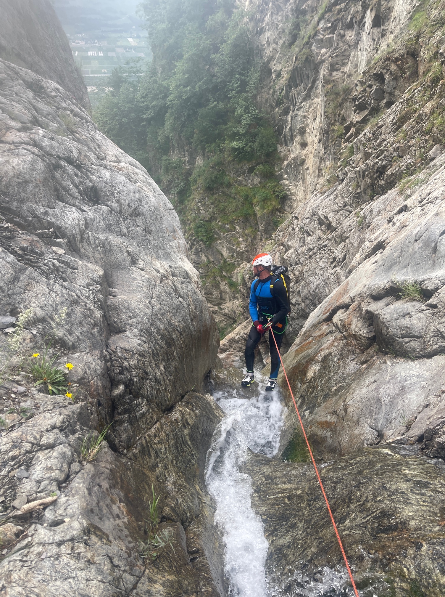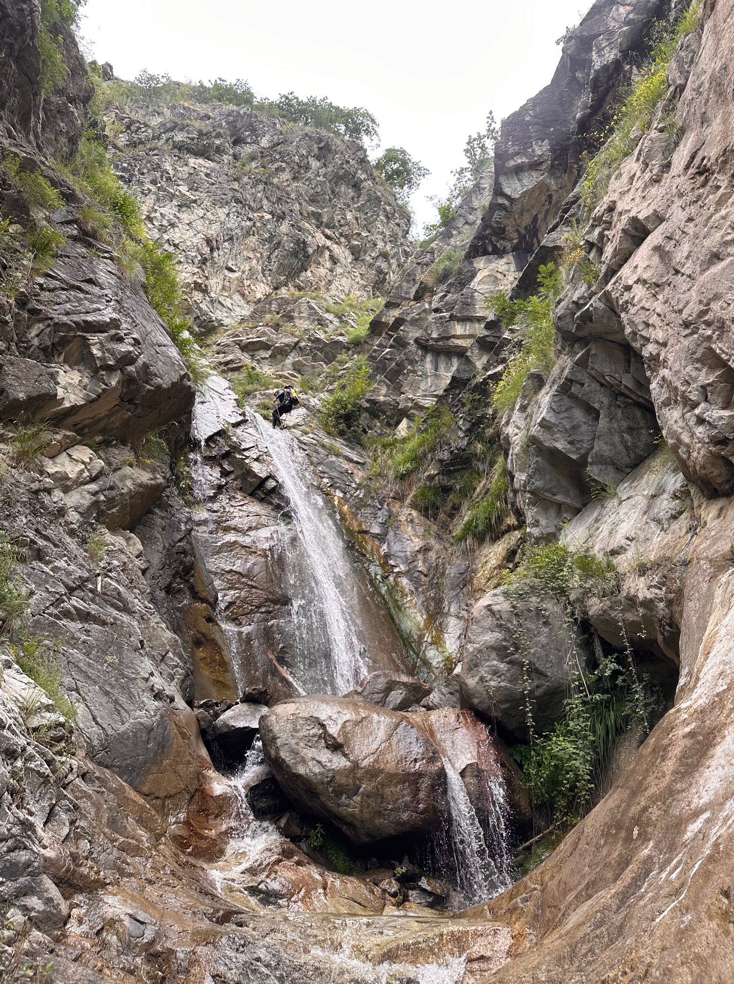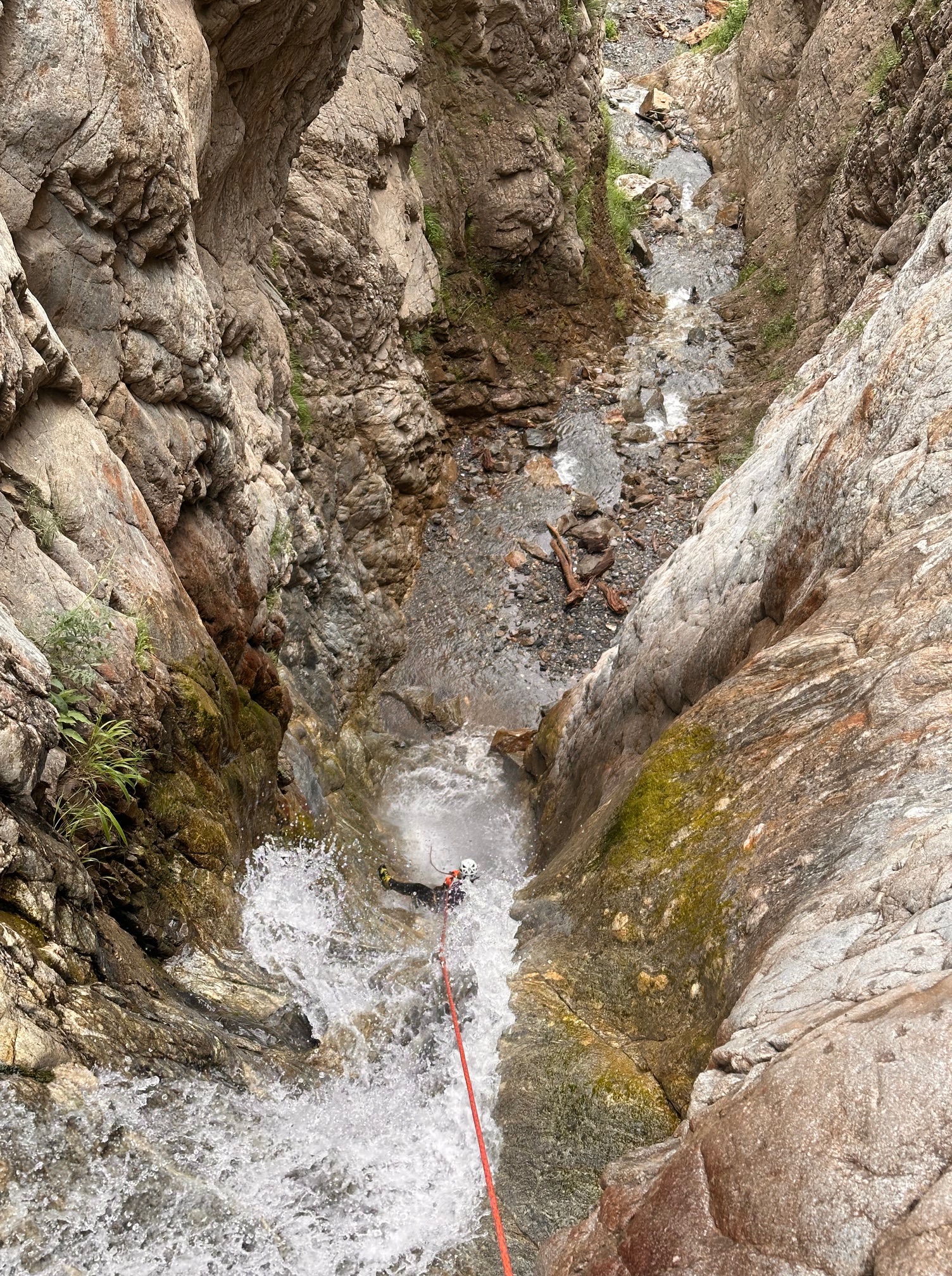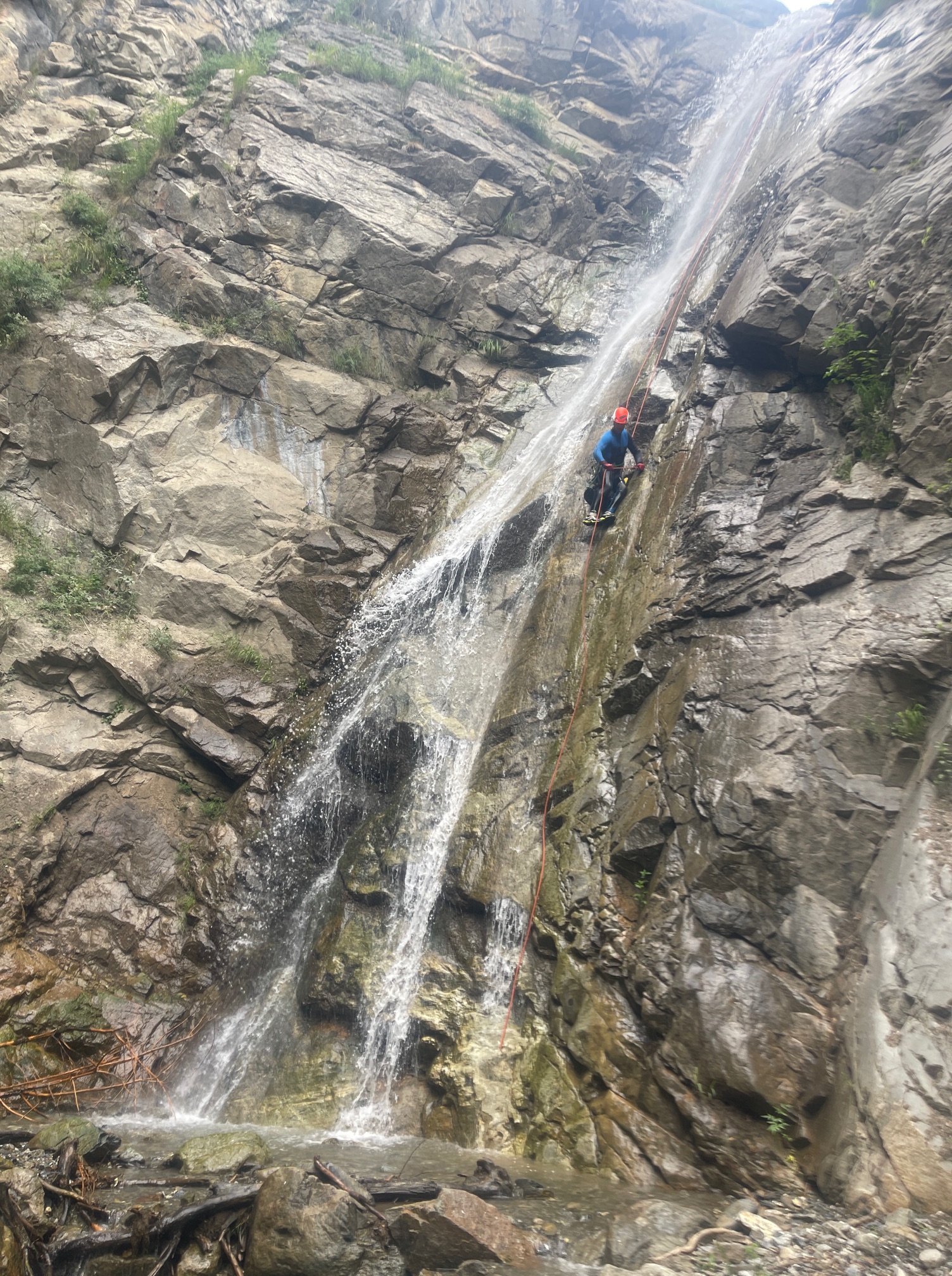 Pål a pris sa corde et équipe plusieurs rappels et mains courante, il est assez à son affaire. Moi par contre c’est vraiment pas ça, une fois sur deux je coince la corde. Quelle gourde. Il faut que je m’améliore si on veut retourner faire ce canyon tous les deux. Jérôme a trouvé très rigolo de nous laisser les deux sur un relai suspendu pour équiper le rappel, je crois que son but était de se marrer pendant qu’on s’entretuait. Mais son plan machiavélique à échoué 😅 (pour cette fois).