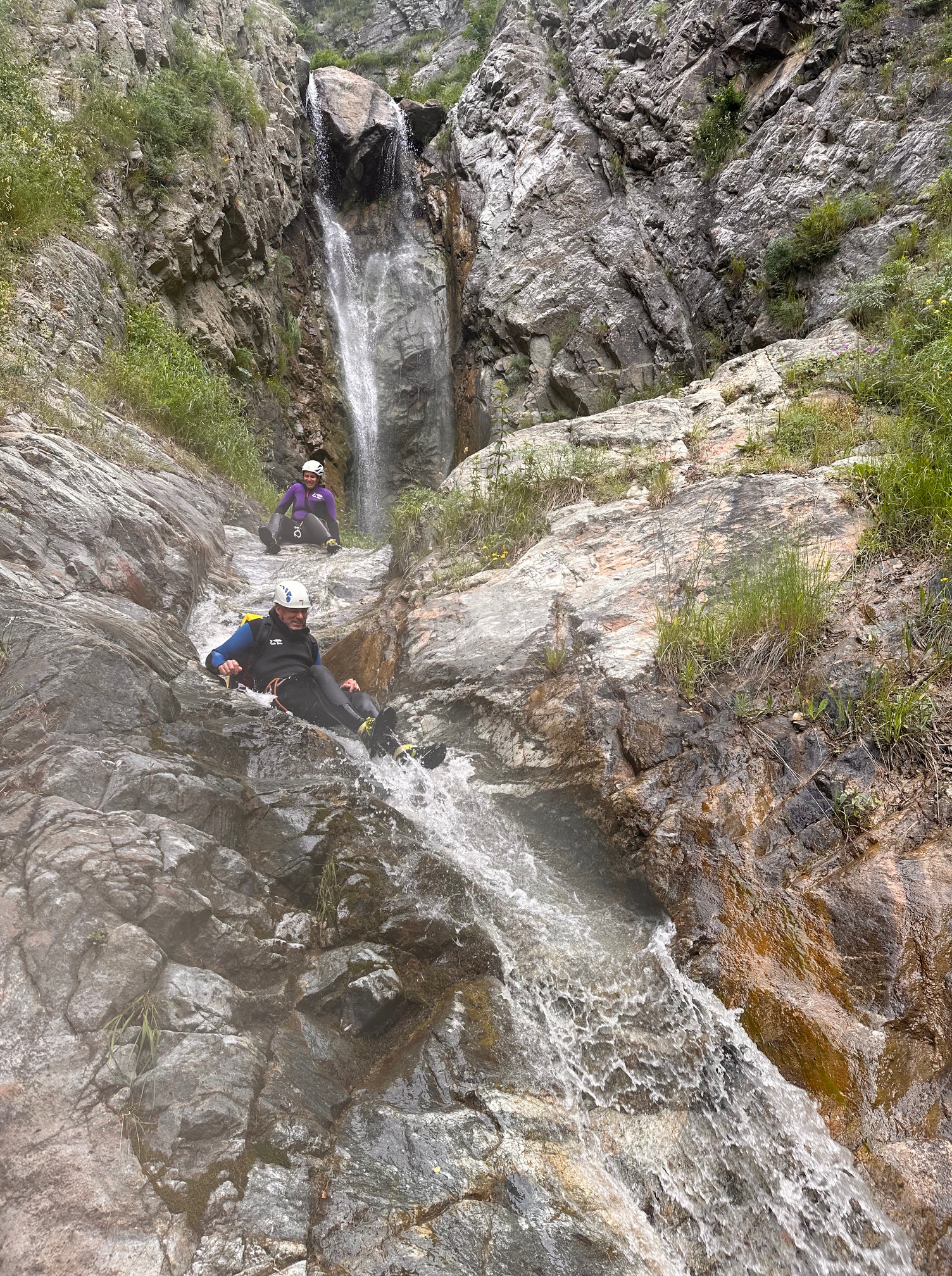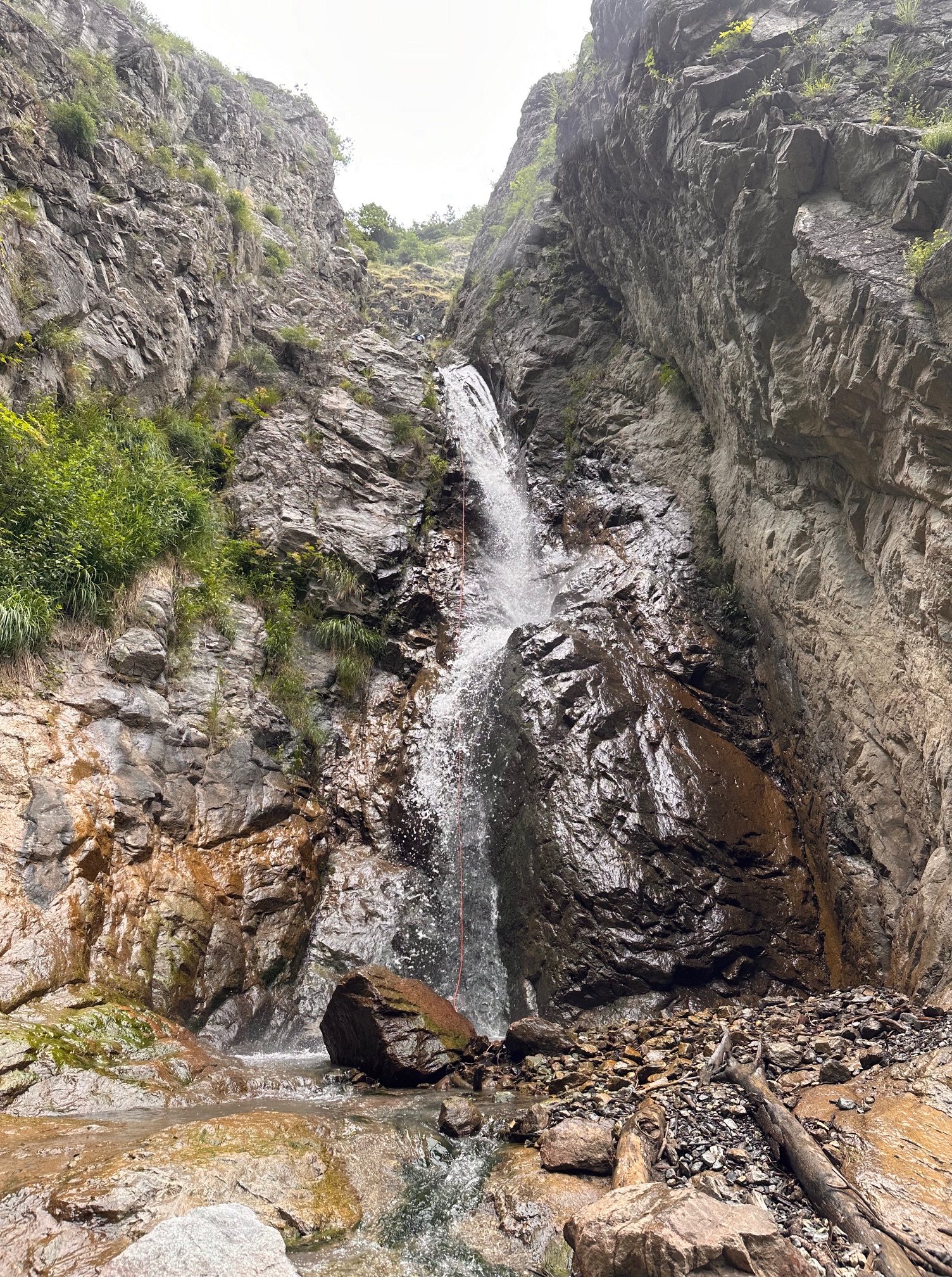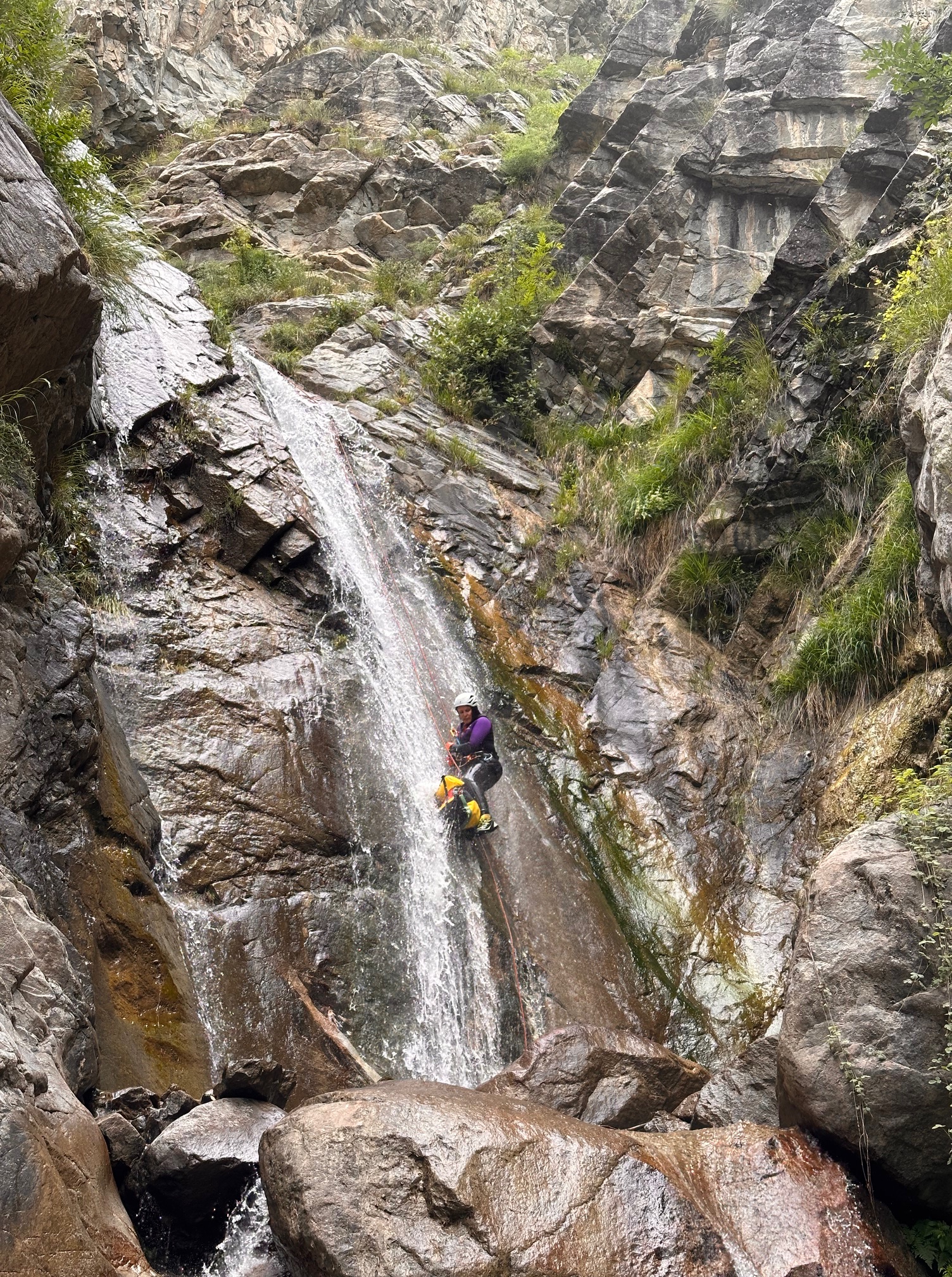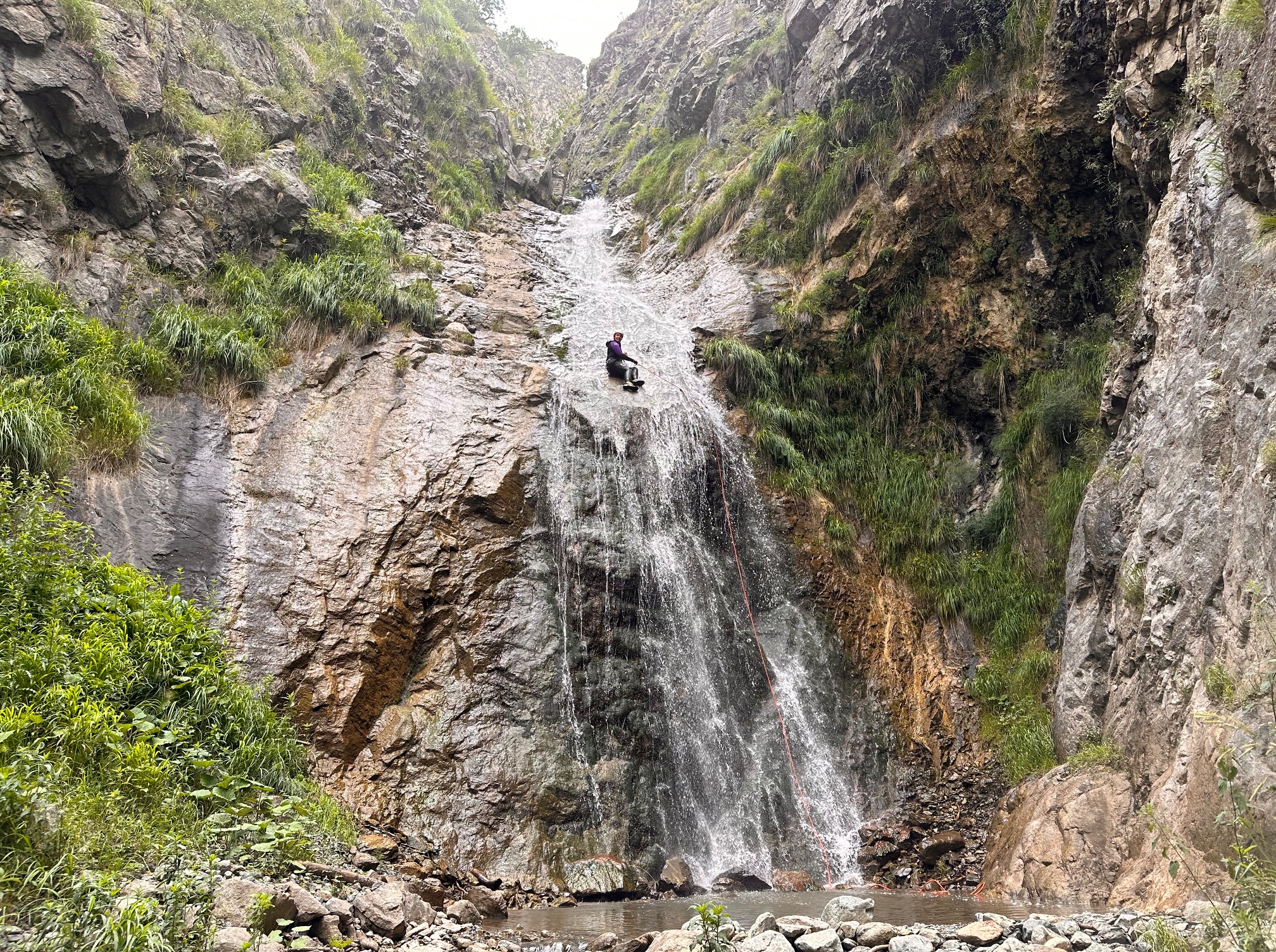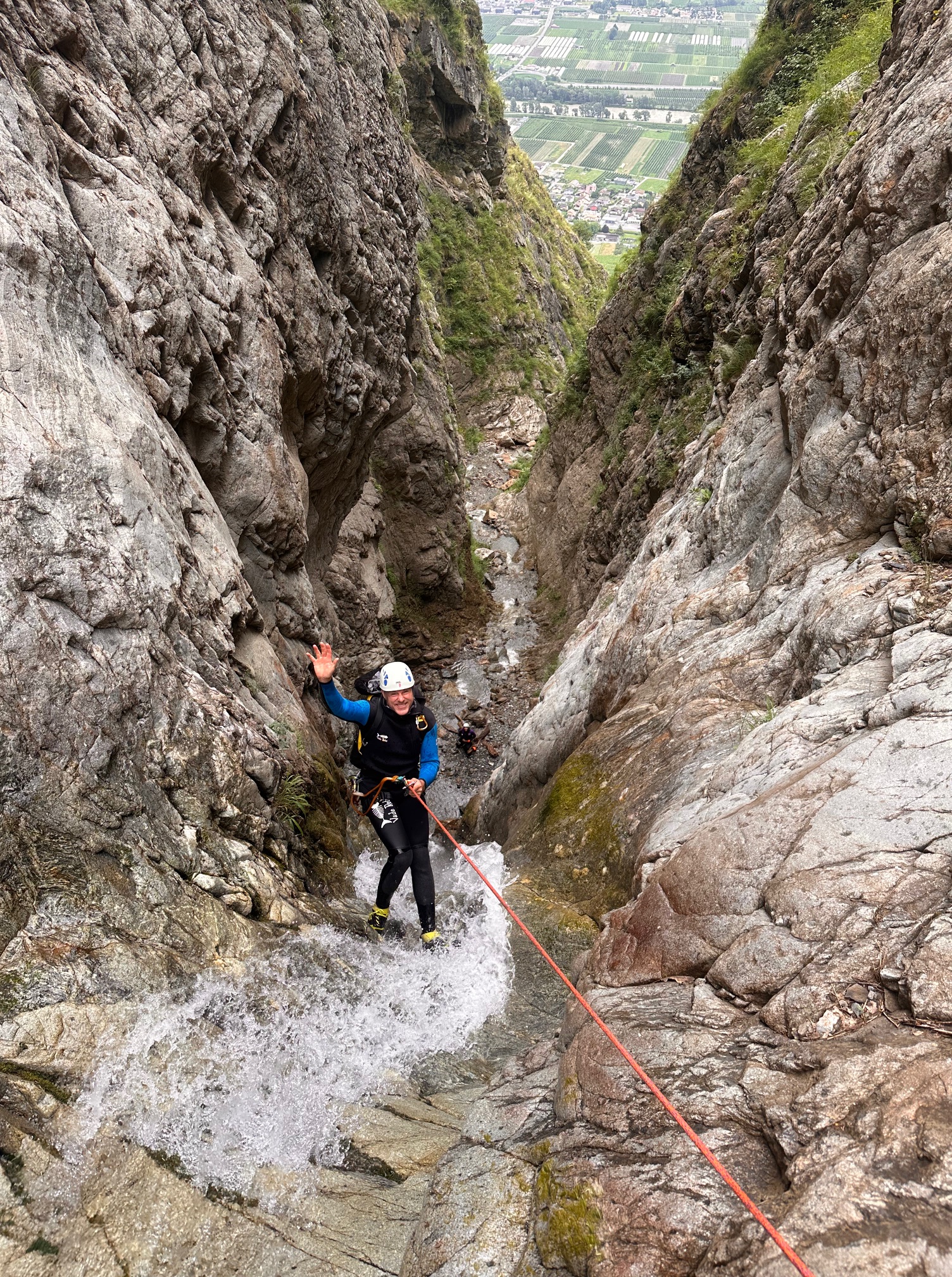 Pål a pris sa corde et équipe plusieurs rappels et mains courante, il est assez à son affaire. Moi par contre c’est vraiment pas ça, une fois sur deux je coince la corde. Quelle gourde. Il faut que je m’améliore si on veut retourner faire ce canyon tous les deux. Jérôme a trouvé très rigolo de nous laisser les deux sur un relai suspendu pour équiper le rappel, je crois que son but était de se marrer pendant qu’on s’entretuait. Mais son plan machiavélique à échoué 😅 (pour cette fois).