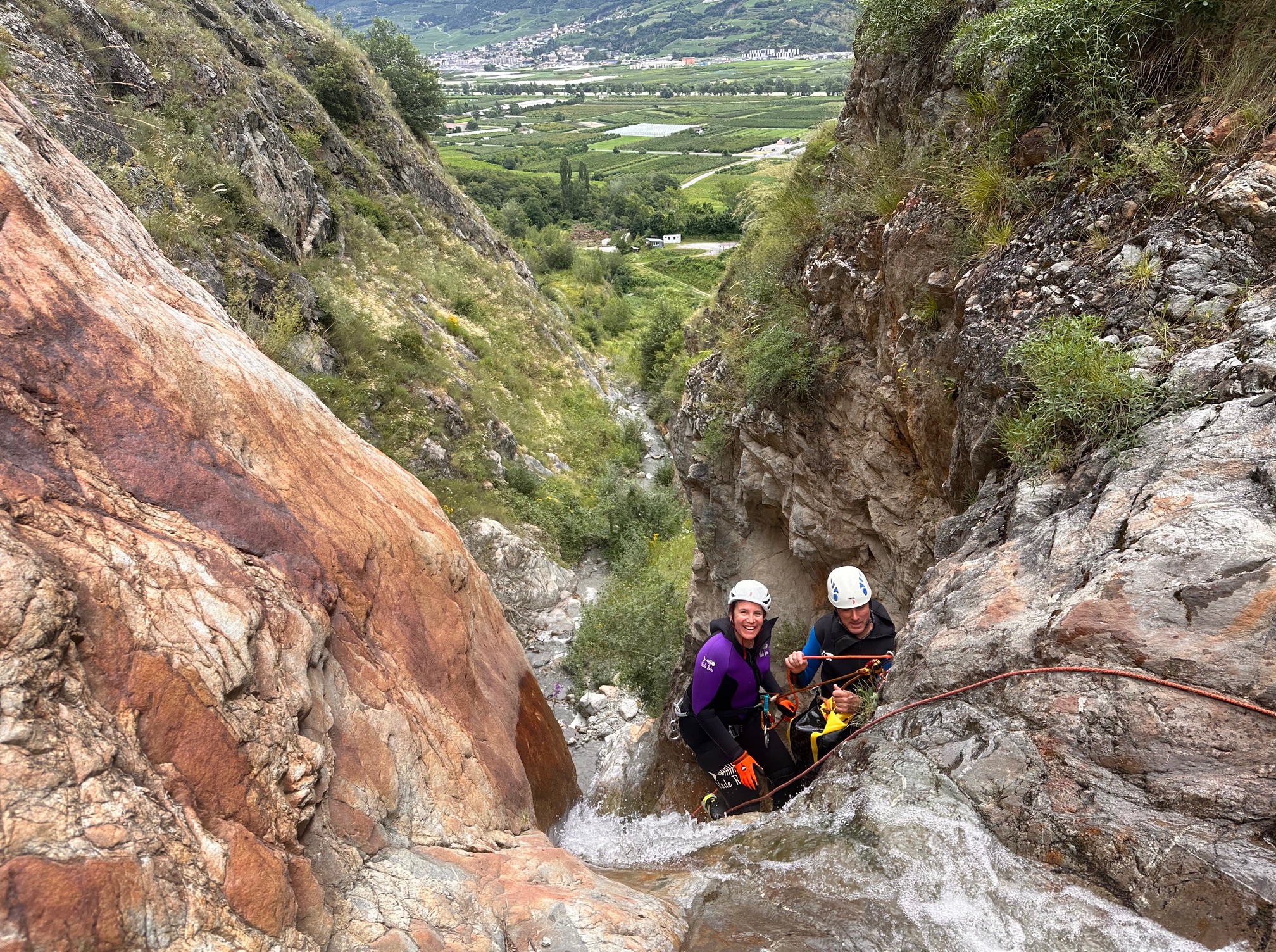 La destination du jour se trouve sur les hauts de Fully, le torrent descend droit en bas du Grand Chavalard. C’est une succession de beaux rappels avec une vue souvent dégagée sur la vallée du Rhône. On aura même eu droit à quelques rayons de soleil.
