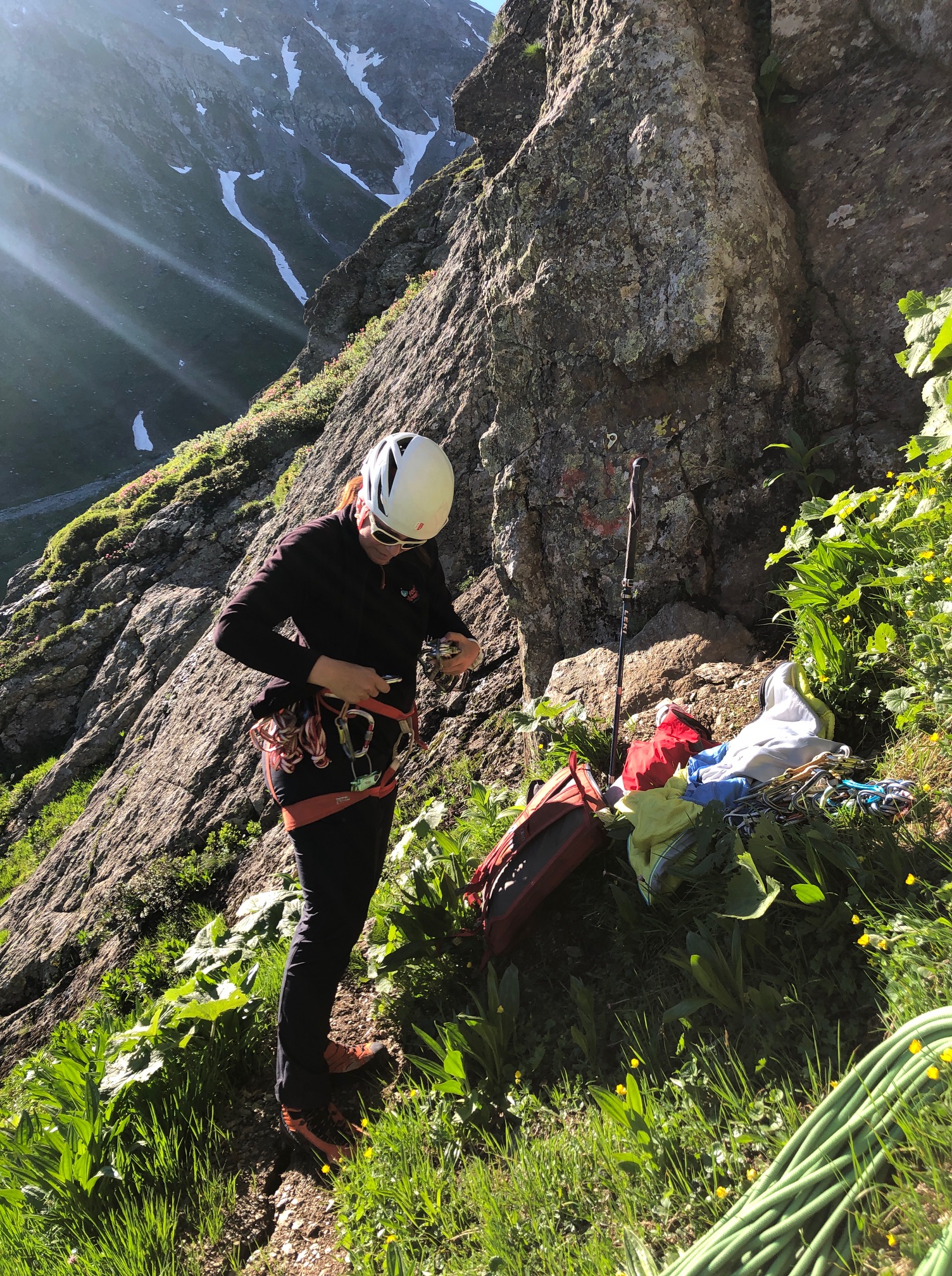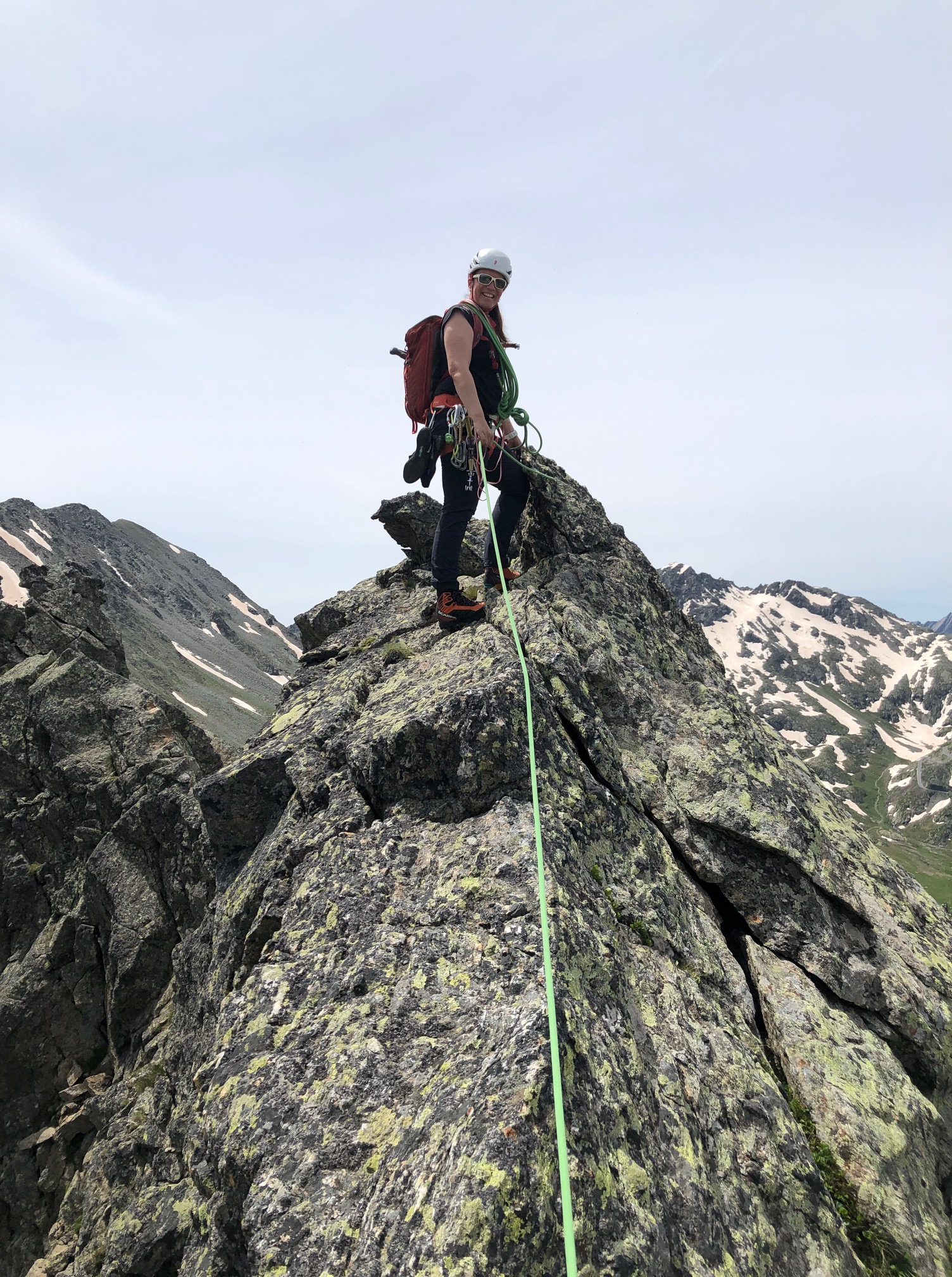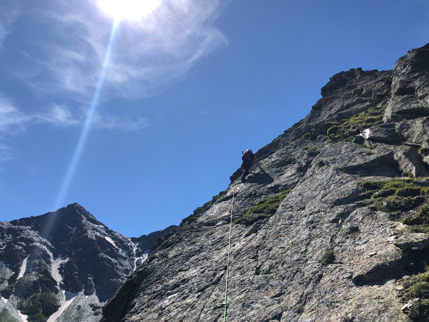 La partie la plus chiante est de remonter le talus détrempé le matin. Ensuite on arrive au plat et au soleil, on trouve l’attaque sans trop pétouiller et c’est parti. Les longueurs d’escalade sont chouettes, je me débrouille, même si pour moi c’est chaussons d’escalade obligatoires. Arrivés sur l’arête, on met les grosses, il y a de la marche et quelques dalles avec des spits bien éloignés, mais qui ont le mérite de montrer la voie. Puis on arrive au Gendarme avec quelques pas de 5a super beaux. Grâce à Elise, je sais que ce n’est pas fini et je ne suis pas surprise quand je vois encore toute la traversée qu’il faut parcourir jusqu’au sommet. C’est pas dur mais encore bien long quand même.