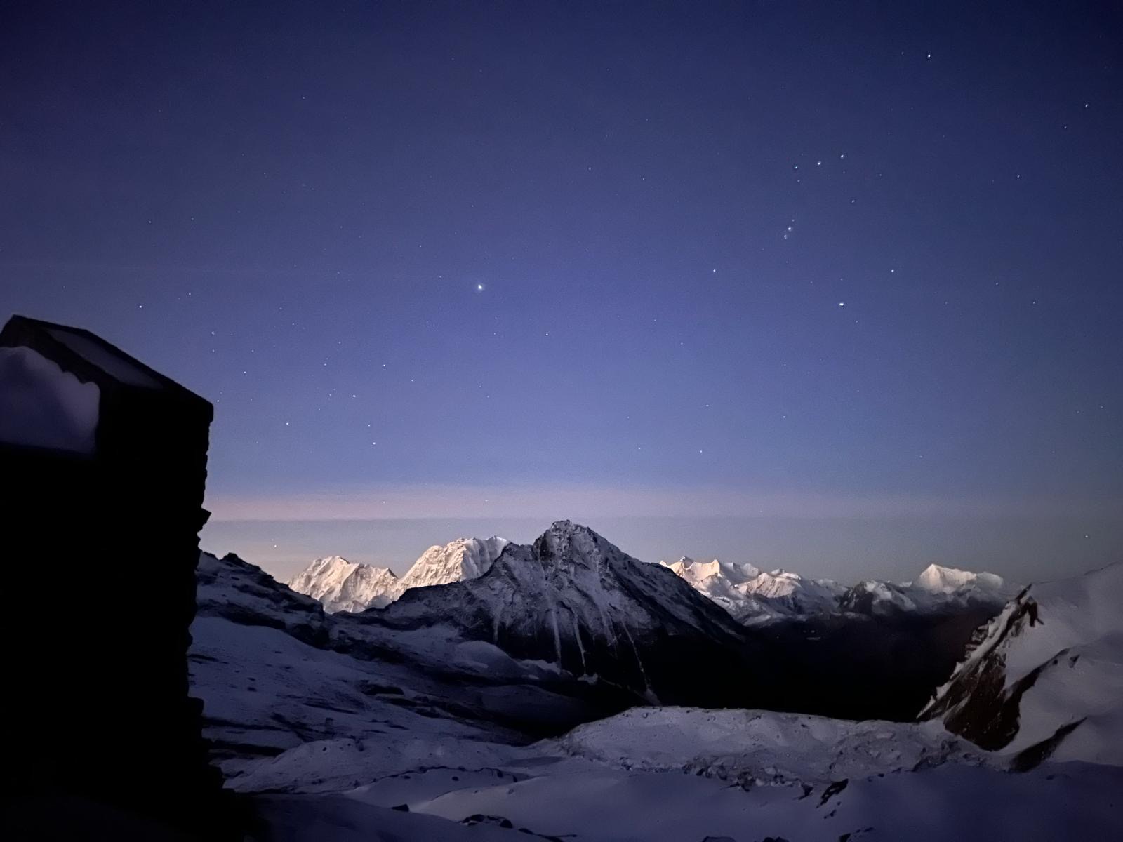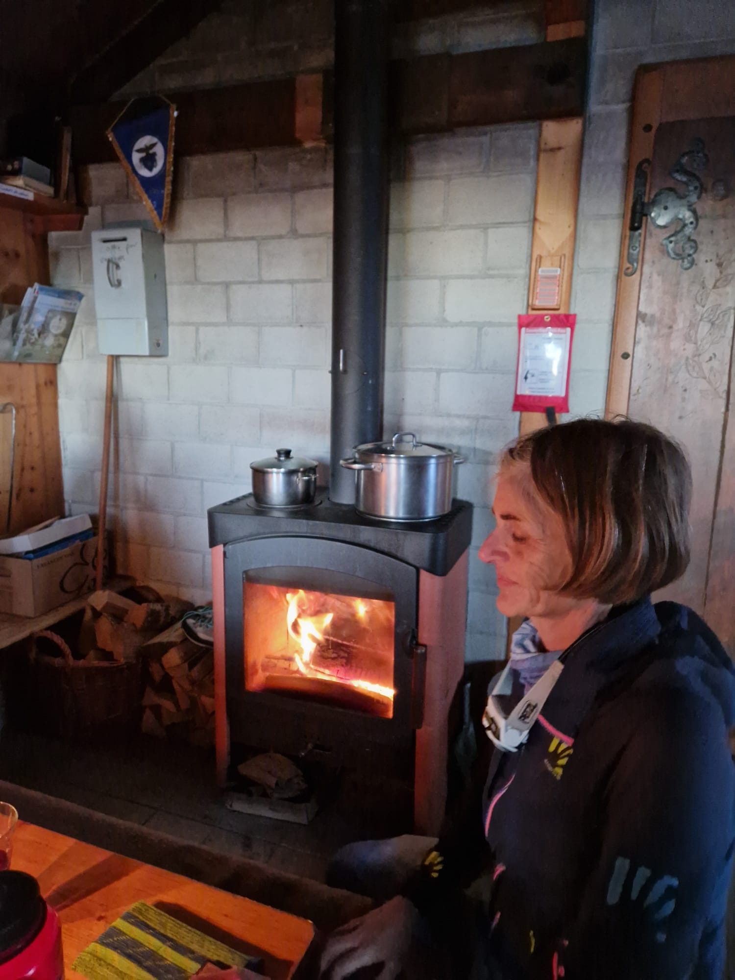 Durant l’après-midi chacun vaque à ses occupation. Je pars jusqu’à la Mäderlicka pour voir un peu les conditions pour le lendemain. Le coin est juste magnifique, mais il y a passablement plus de neige que ce à quoi je m’attendais. On regarde le coucher de soleil depuis la terrasse de la cabane avant de déguster nos lyophilisés au coin du feu. Claudia, Débora et Claude déménagent des matelas dans le réfectoire pour dormir au chaud tandis que Pål et moi, traumatisés par une nuit à 38° dans un local d’hiver surchauffé lors d’une Haute Route, préférons aller dans le dortoir glacial.