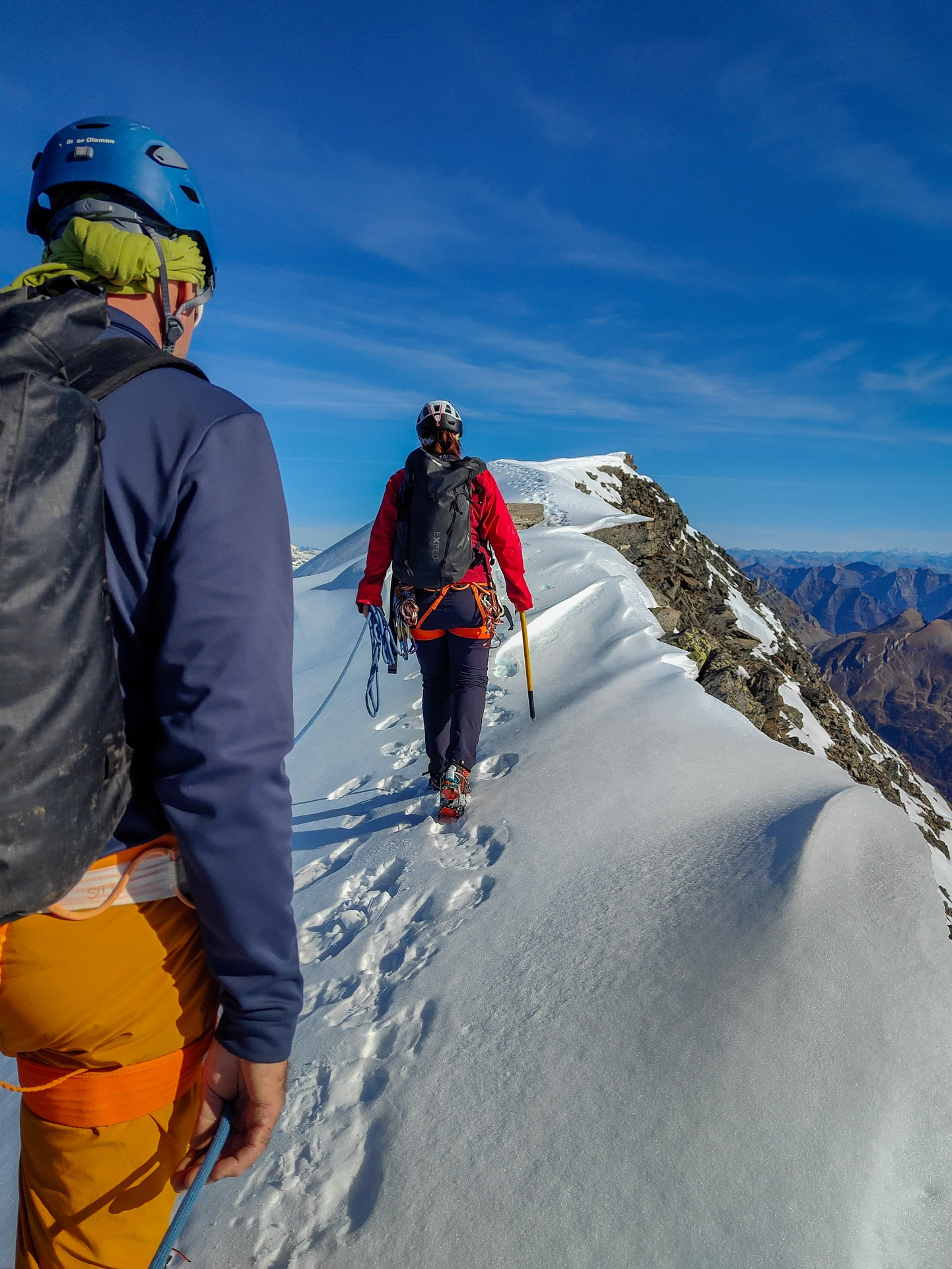 A 8h on se met tranquillement en route. On observe la vue, on photographie, on filme, on pétouille, quoi ! On commence sans les crampons mais rapidement, Claudia qui est en tête de la première cordée demande à tout le monde de les mettre. Effectivement, la neige est belle dure sur l’arête effilée. C’est trop beau ! Claude est en tête de ma cordée, suivit par Pål qui le coach et moi qui suis. Je repasse en tête à quelques mètres de la croix, et essaie de voir la descente. Depuis la croix, il faut continuer quelques dizaines de mètres à plat sur une arête pas trop large. Quand j’arrive au vrai sommet, je me dis que ça va être chaud pour motiver les copains à descendre droit dans la pente en suivant à peu près le chemin d’été. C’est vrai que d’ici la vue est impressionnante. On tergiverse un peu avant de choisir de redescendre par là où on est venu. C’est plus long mais on n’est plus à ça près !