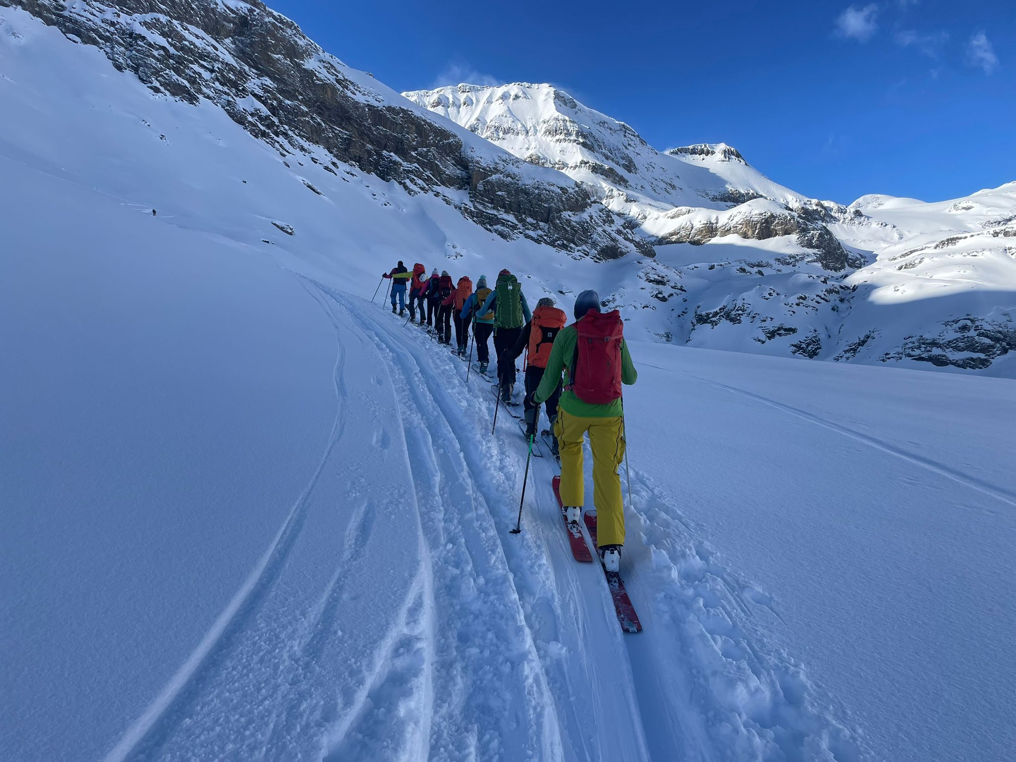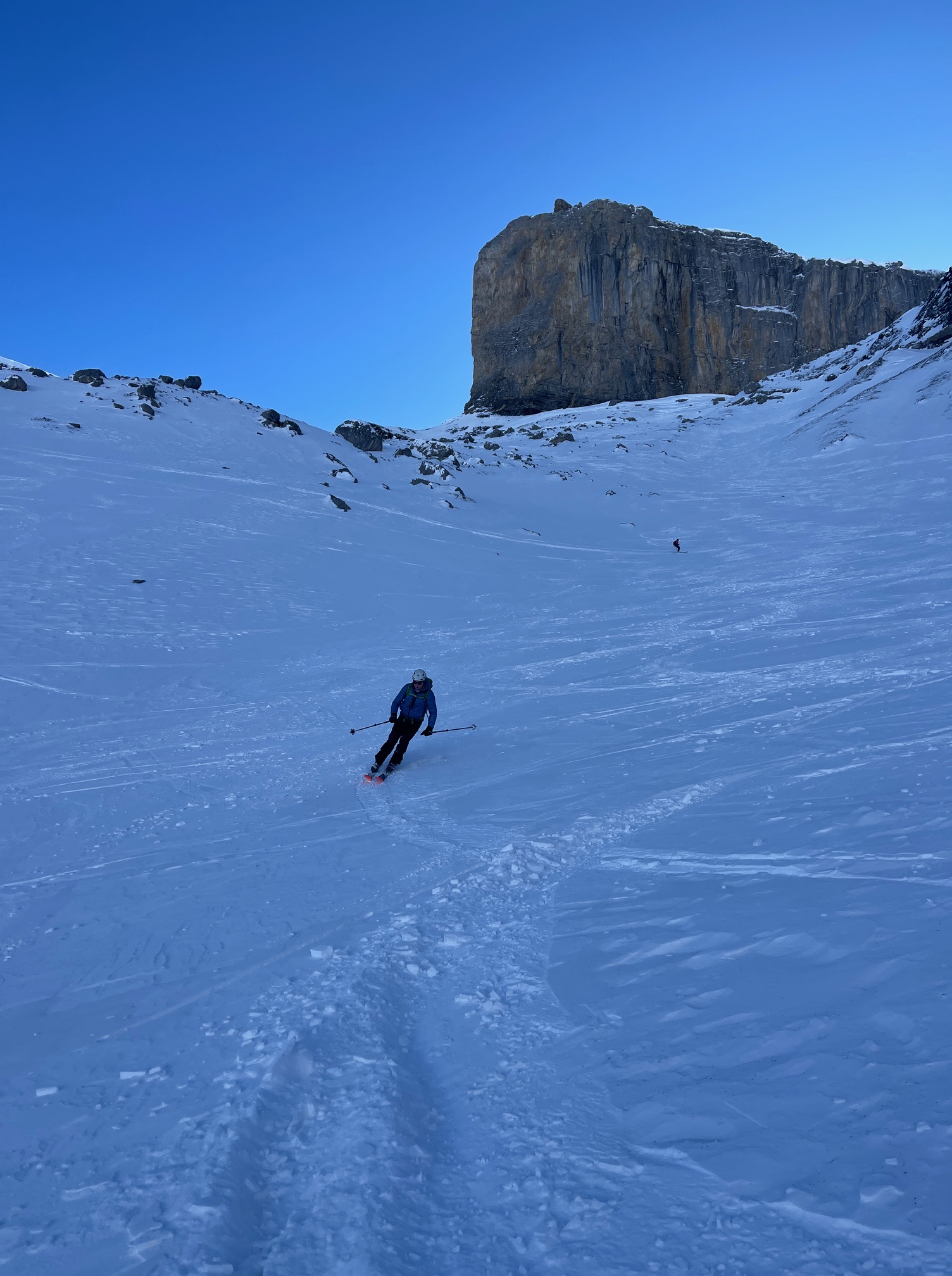 J’ai beau avoir observé l’itinéraire sur la carte pendant des heures, c’est magique de le voir se matérialiser sous ses yeux. Avec le temps, ma lecture de carte devient plus précise et le terrain ressemble de plus en plus à ce que j’imagine, ce qui me réserve moins de mauvaises surprises. On descend des pentes débonnaires et on pousse un peu pour arriver au Walliswand, le point chaud de la descente. Dès qu’on arrive dedans, je suis instantanément rassurée: y a très peu de neige, c’est pas là dedans qu’on risque de déclencher une avalanche. Il faut plutôt faire attention à ne pas se prendre un caillou. La fin est assez cool, dans un large couloir et avec une meilleure neige.