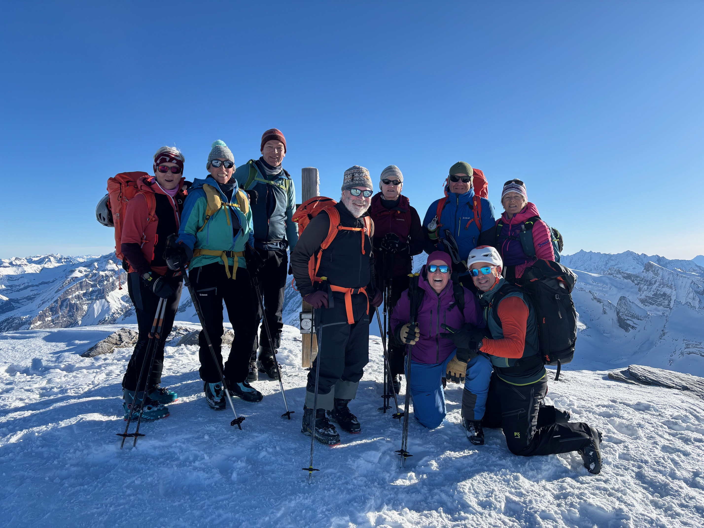 Le dimanche matin, on calque notre réveil pour être sur les skis au levé du jour et laisser les frontales au fond du sac. Notre premier objectif est le Steghorn. Bien que je vienne dans le coin chaque hiver, c’est une première pour moi. La distance est importante, mais il n’y a pas de difficultés. Le haut a été ravagé par le vent, on termine à pieds dans les cailloux. Depuis la croix, on a tout loisir de repérer notre future descente qui nous attend dans quelques heures.