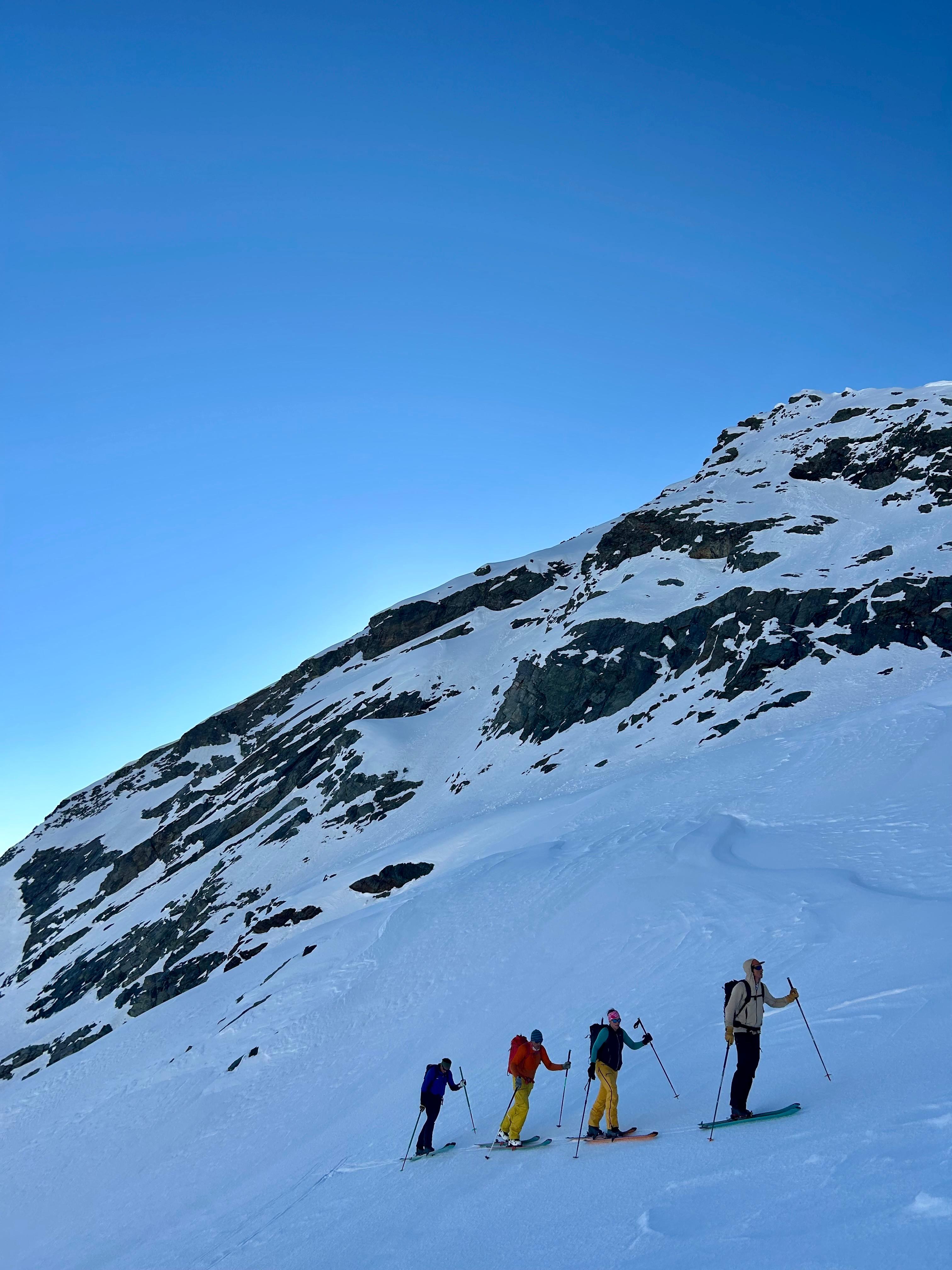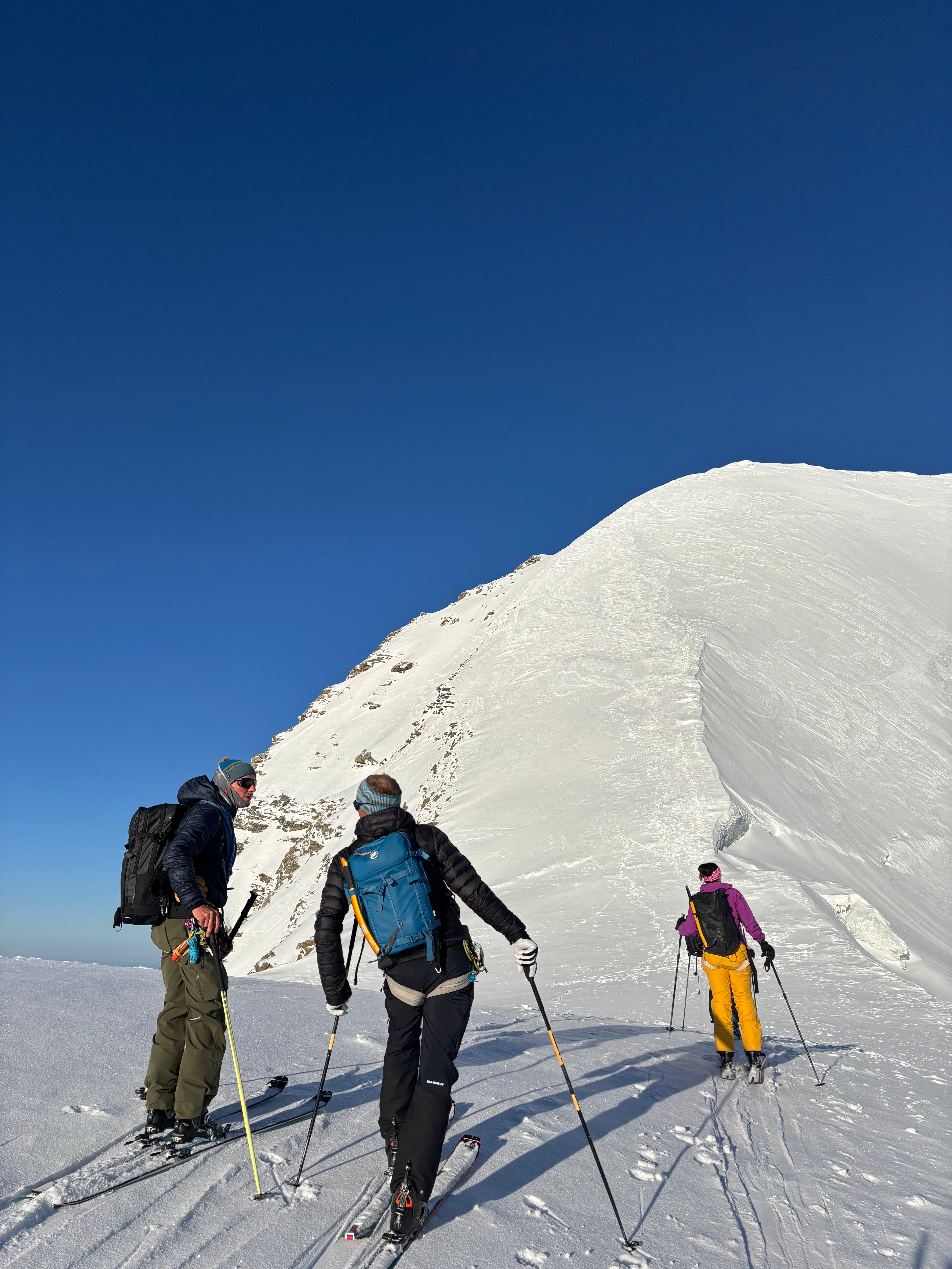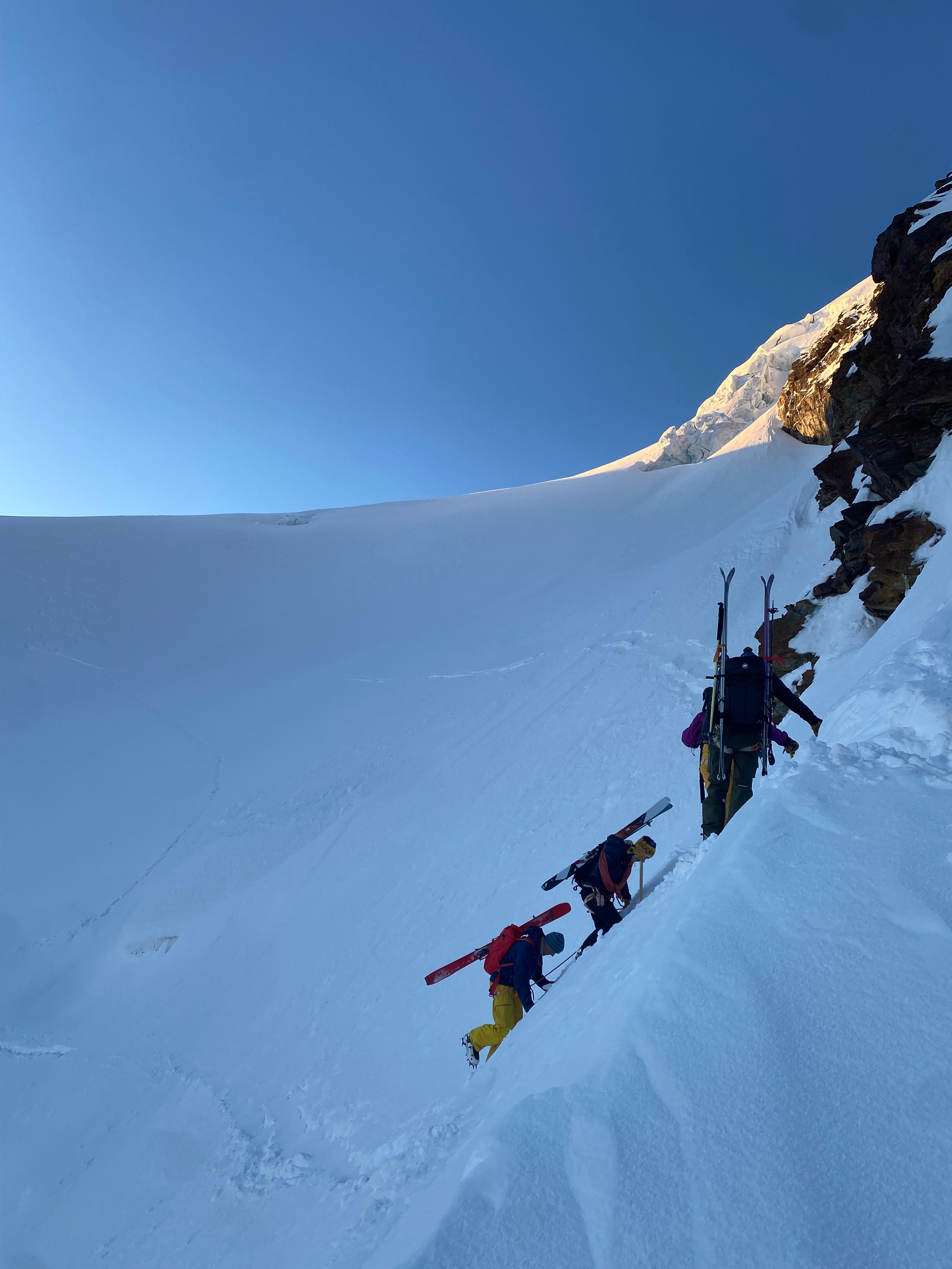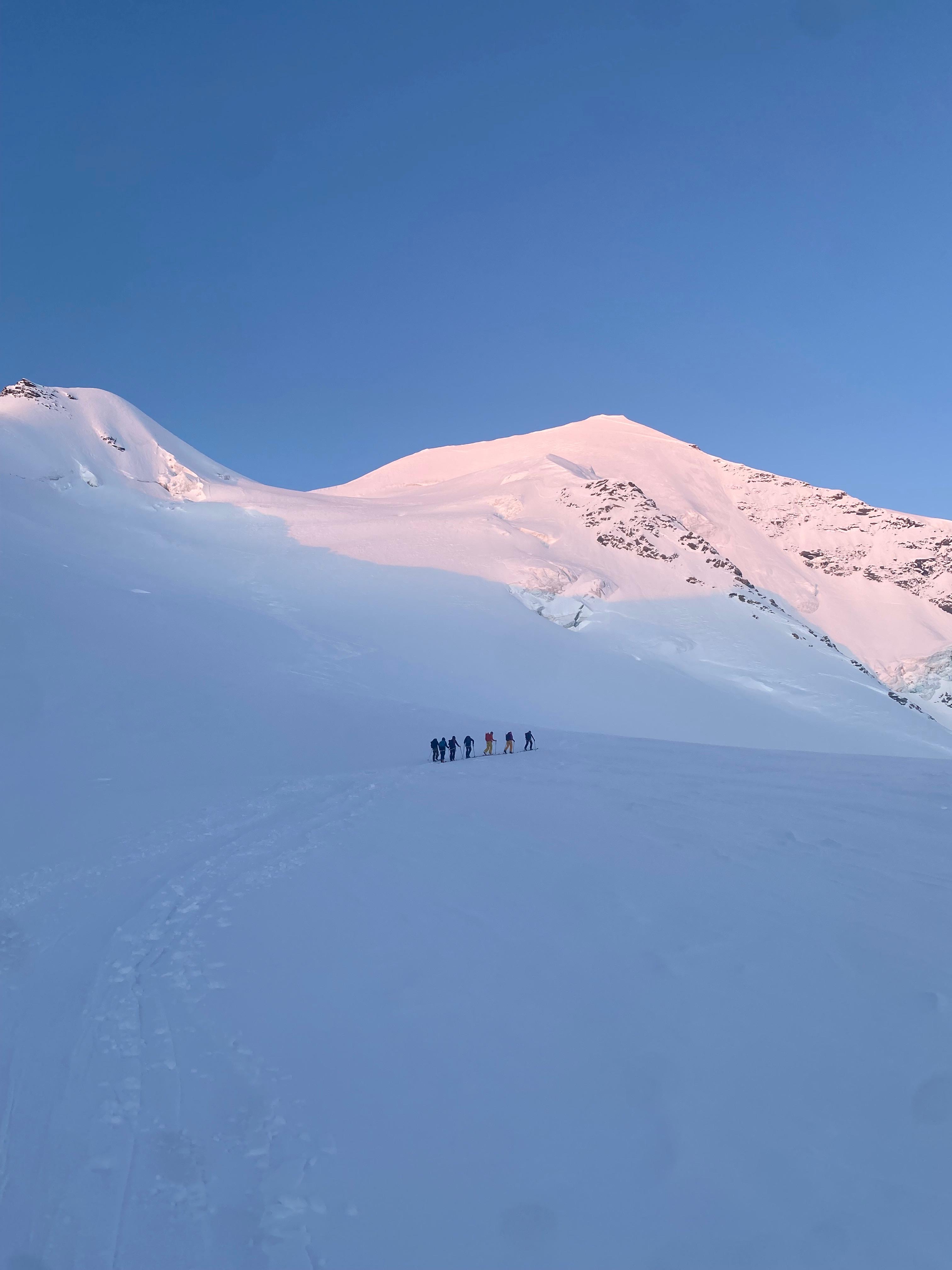 Un autre sommet emblématique du coin, je me réjouissais d’y aller. L’équipe à prévu de faire également une traversée et de descendre sur le col de la Bernina. La descente à l’air un peu raide mais bon, s’ils disent qu’on peut y aller, ils savent ce qu’ils font.
