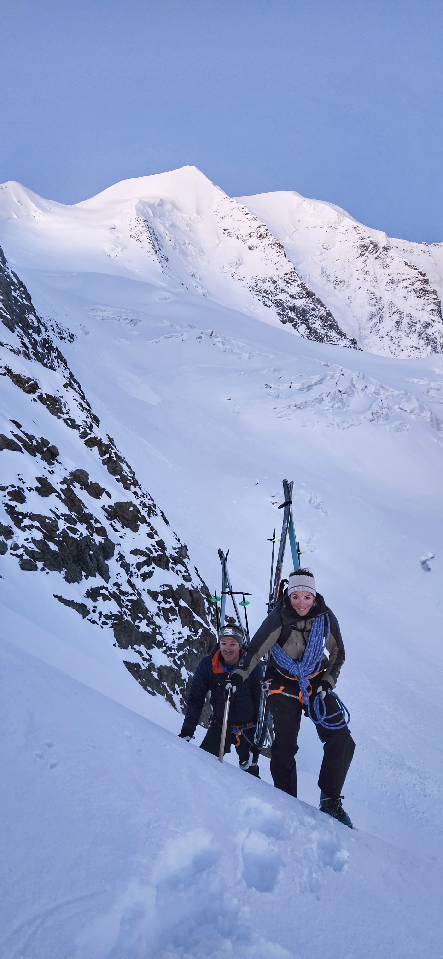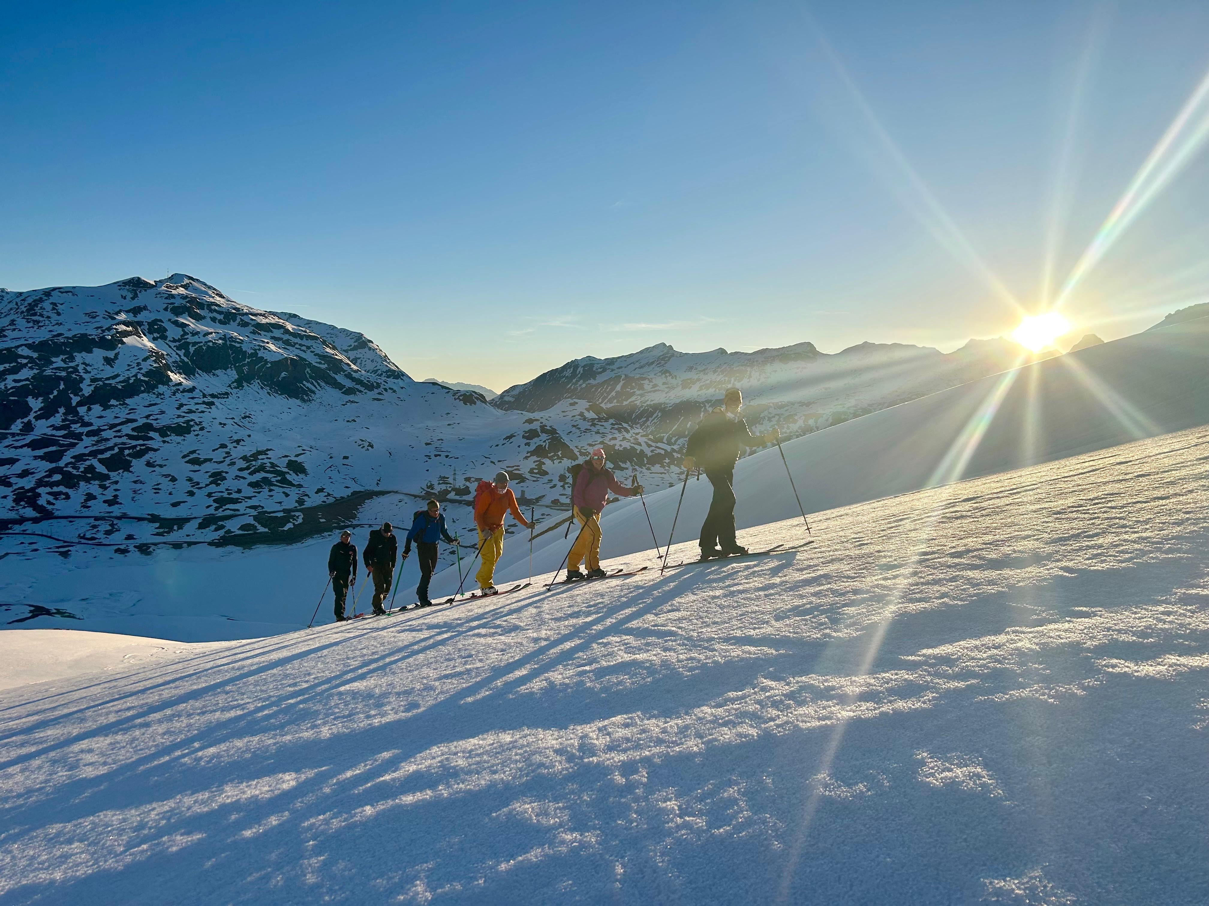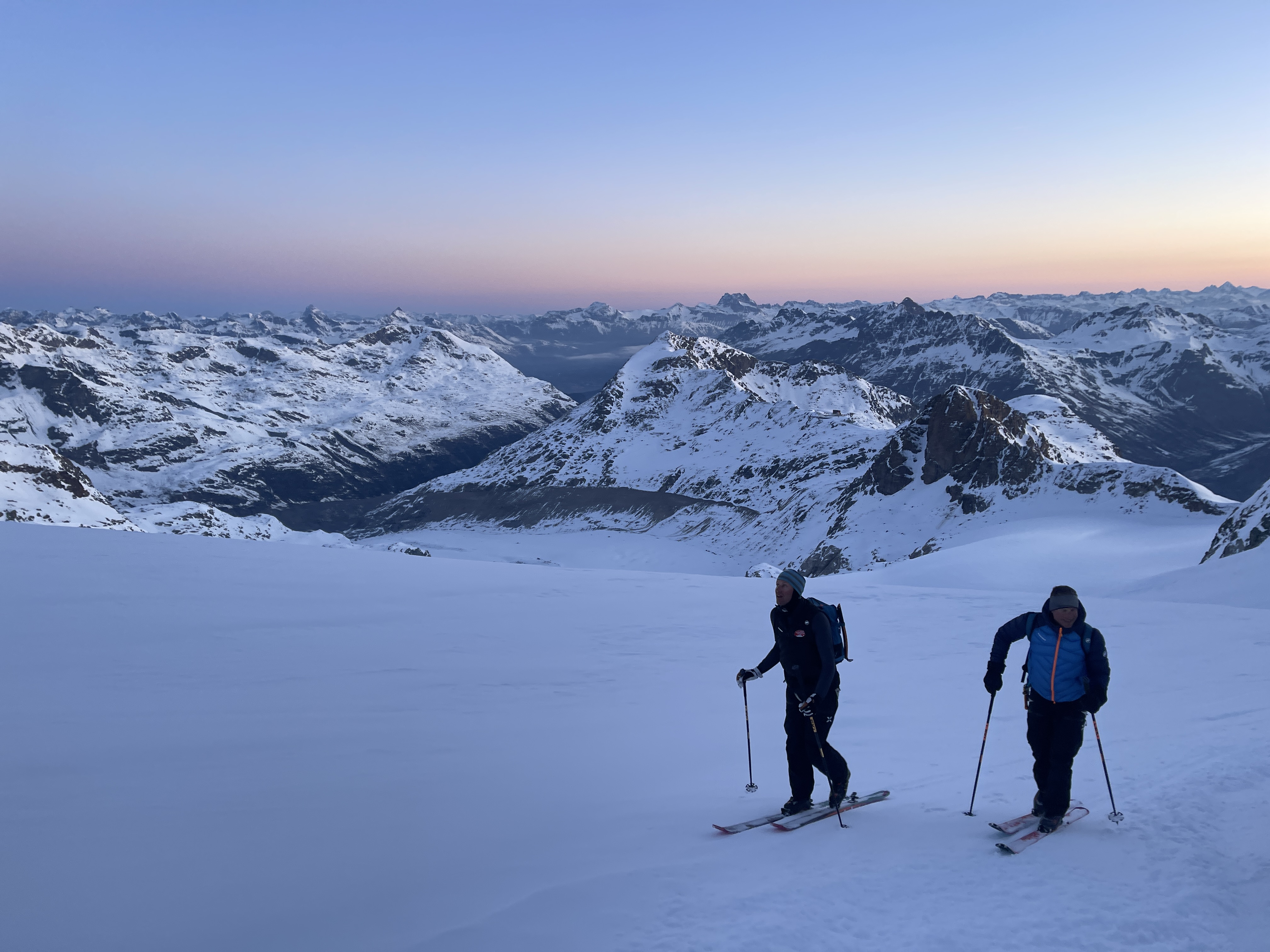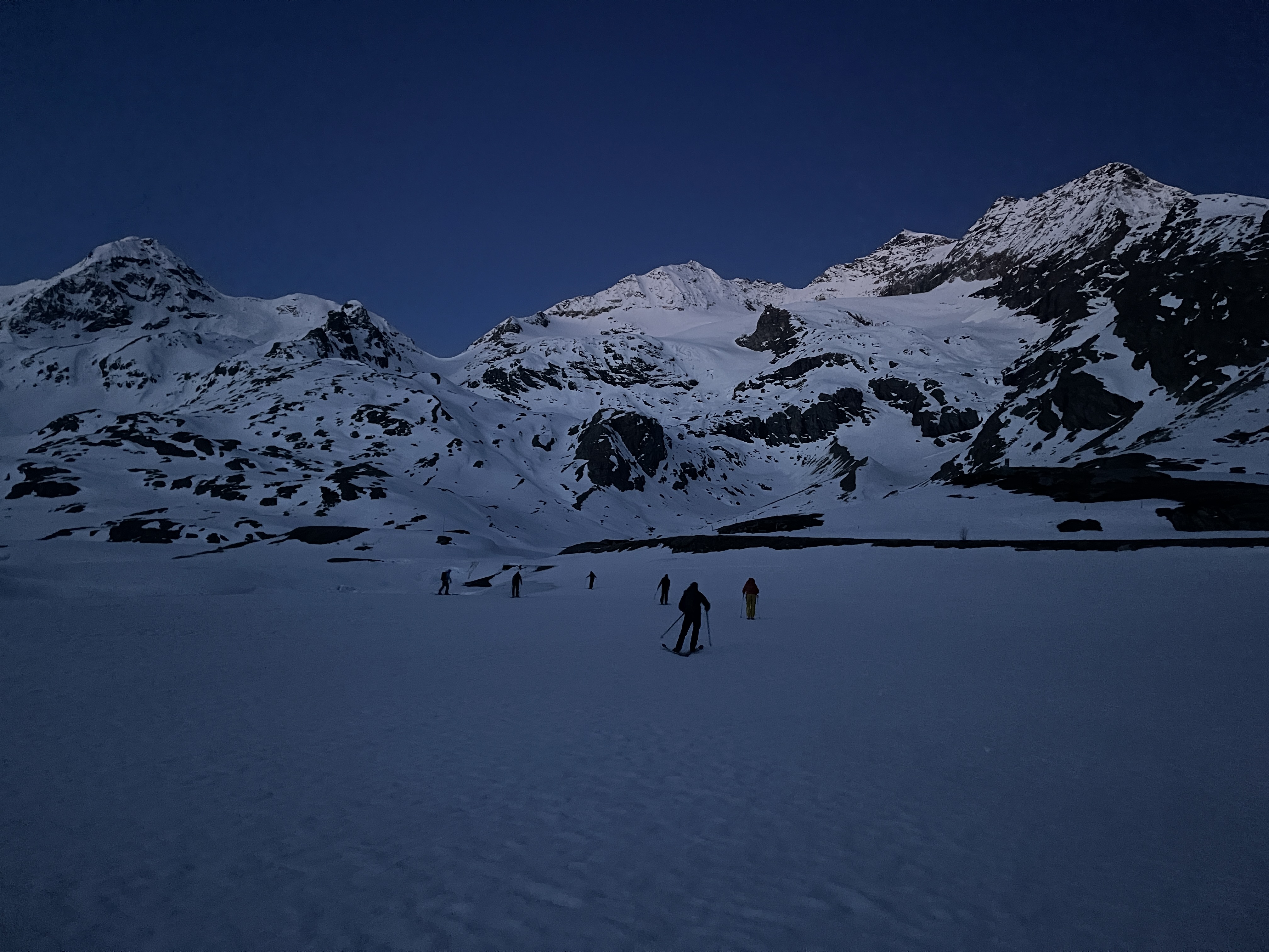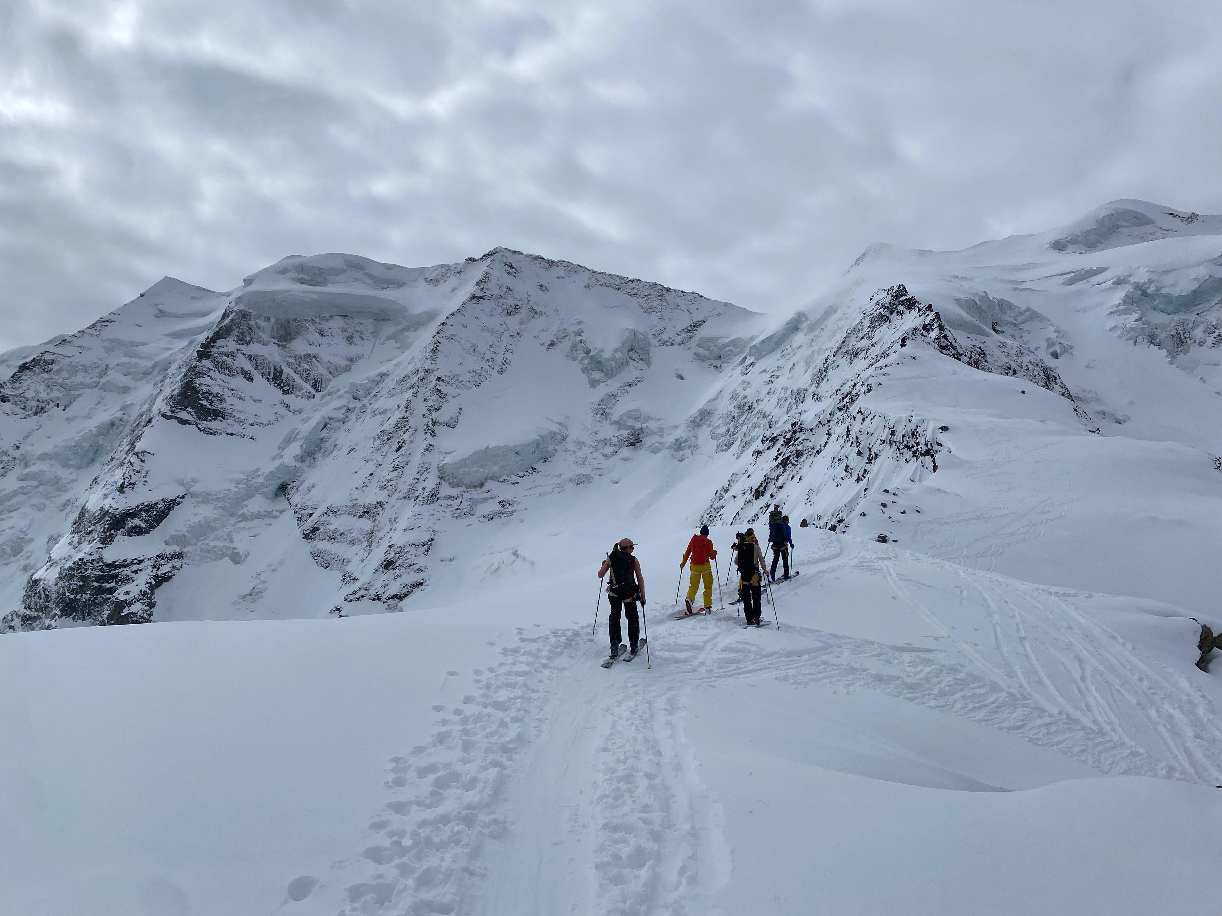 Un autre sommet emblématique du coin, je me réjouissais d’y aller. L’équipe à prévu de faire également une traversée et de descendre sur le col de la Bernina. La descente à l’air un peu raide mais bon, s’ils disent qu’on peut y aller, ils savent ce qu’ils font.