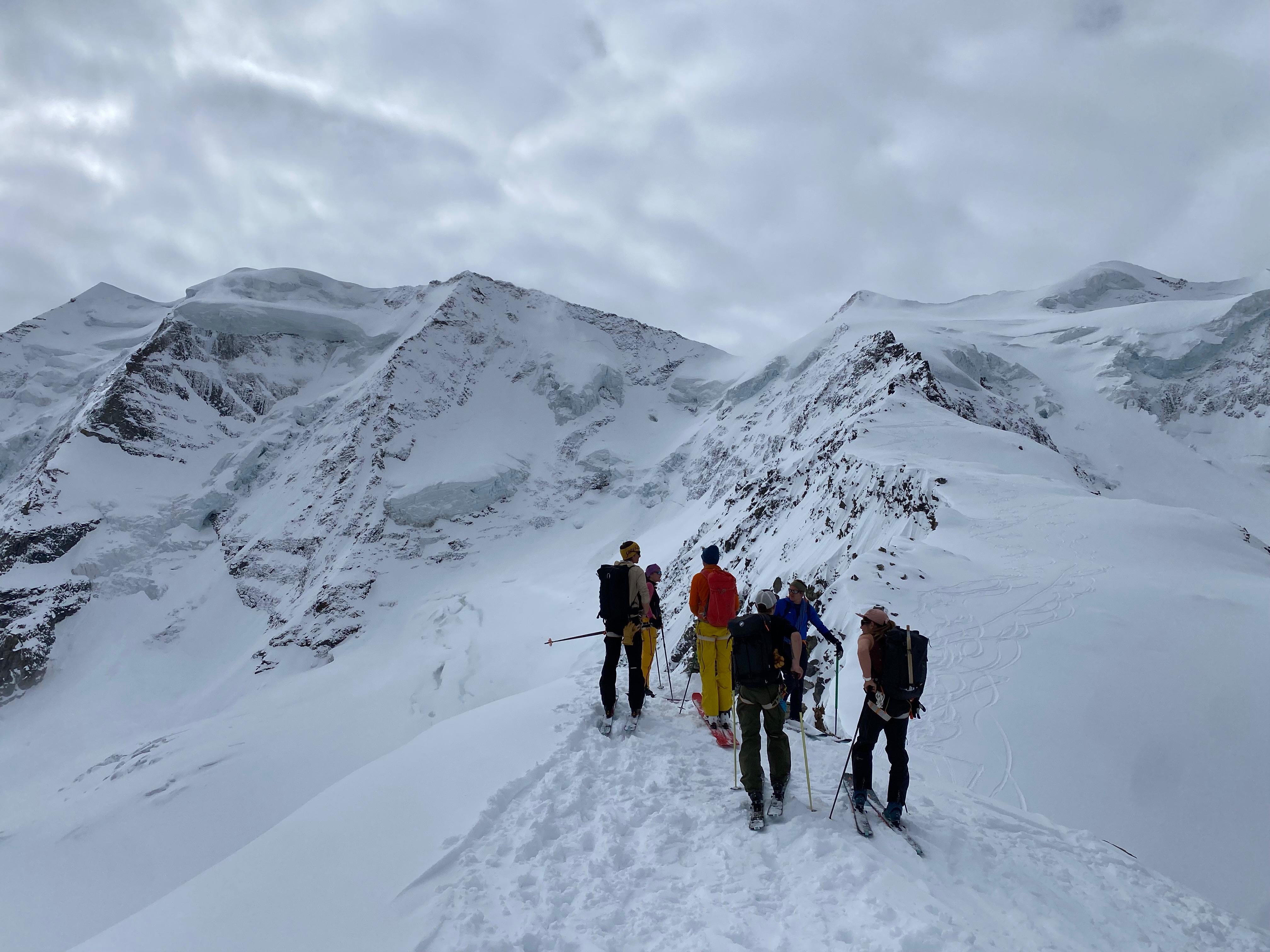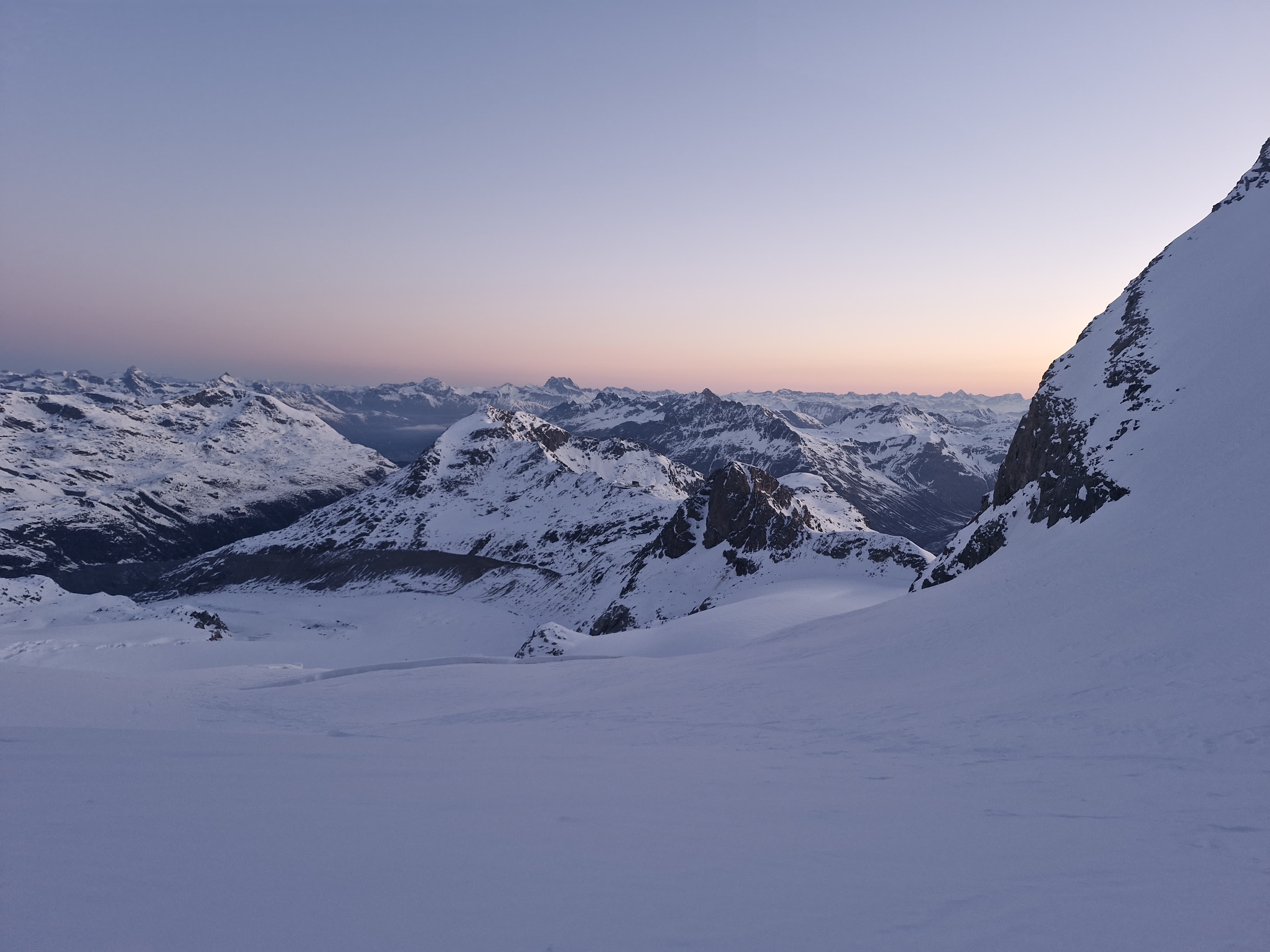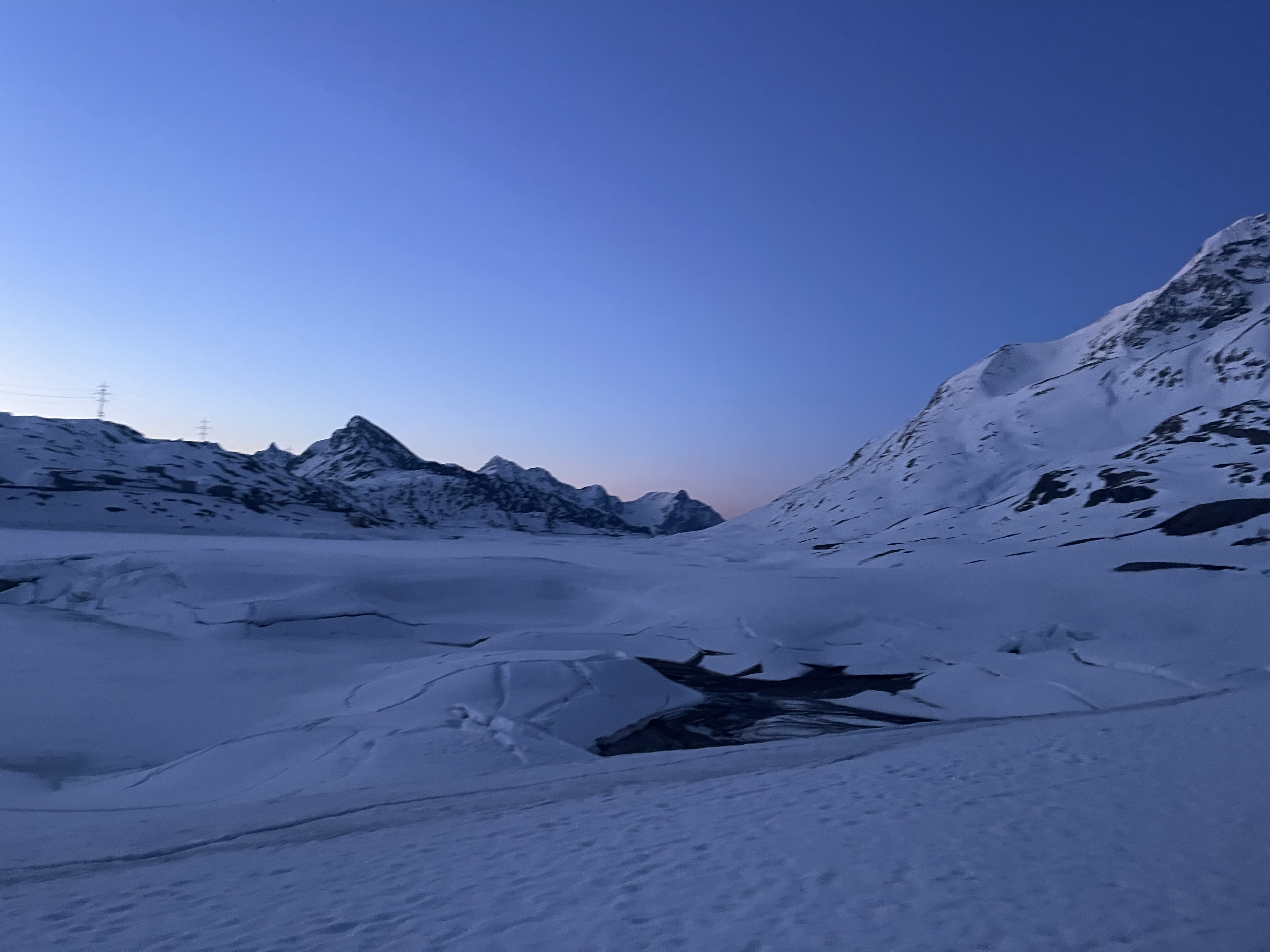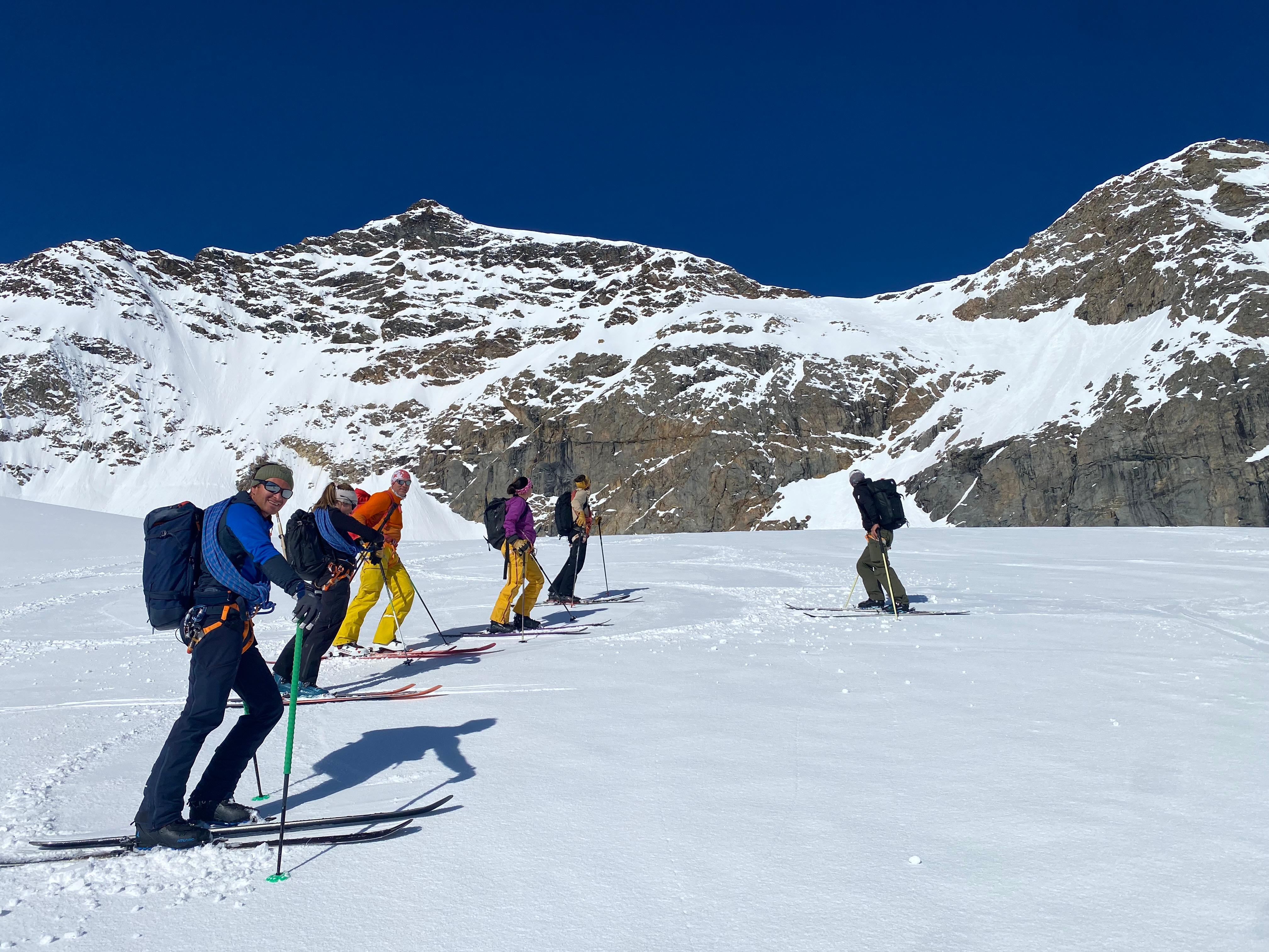 Un autre sommet emblématique du coin, je me réjouissais d’y aller. L’équipe à prévu de faire également une traversée et de descendre sur le col de la Bernina. La descente à l’air un peu raide mais bon, s’ils disent qu’on peut y aller, ils savent ce qu’ils font.