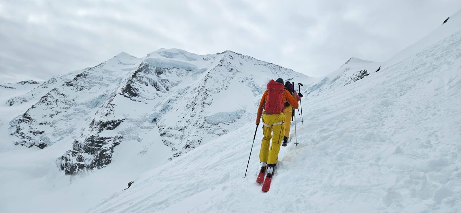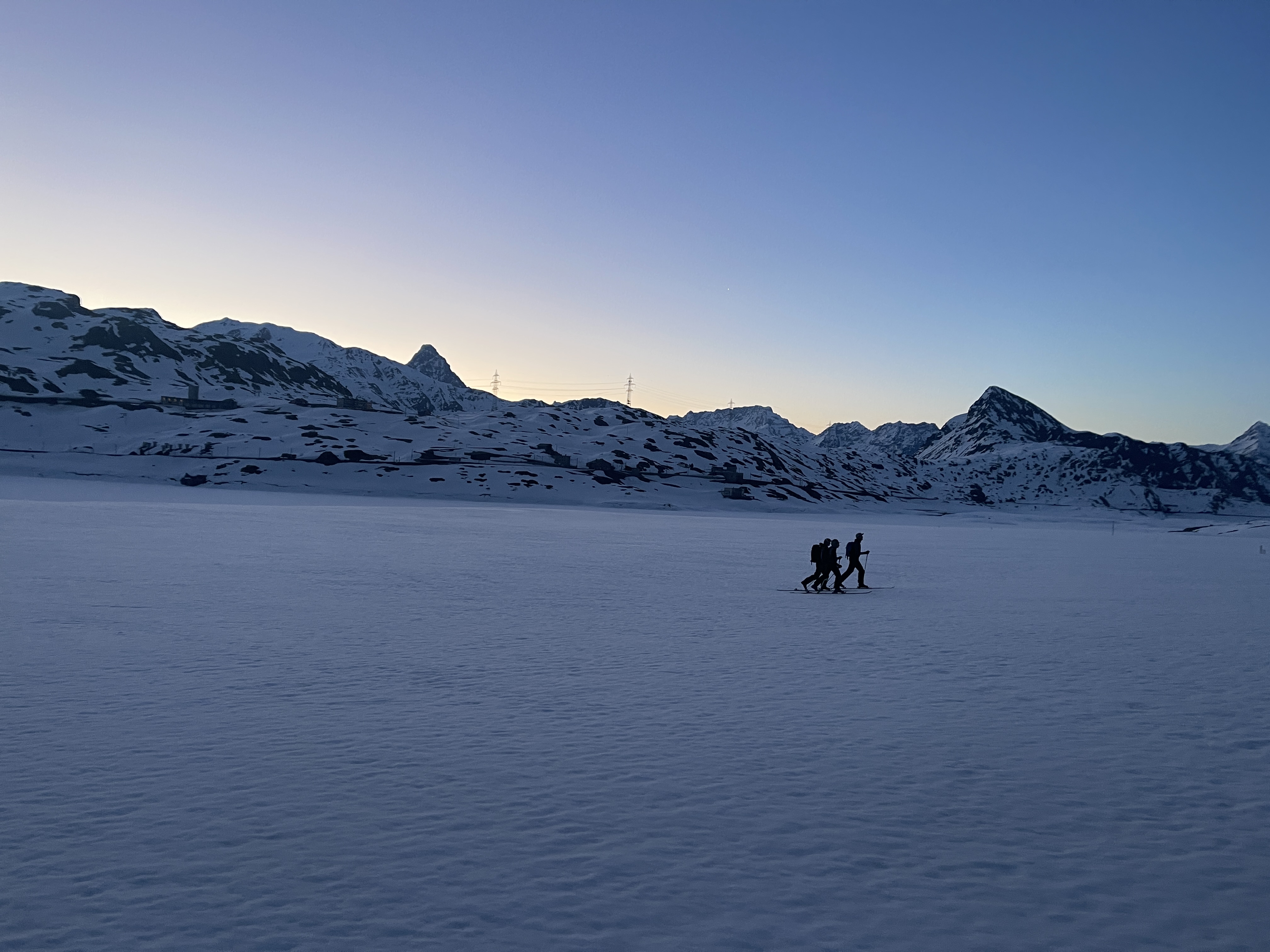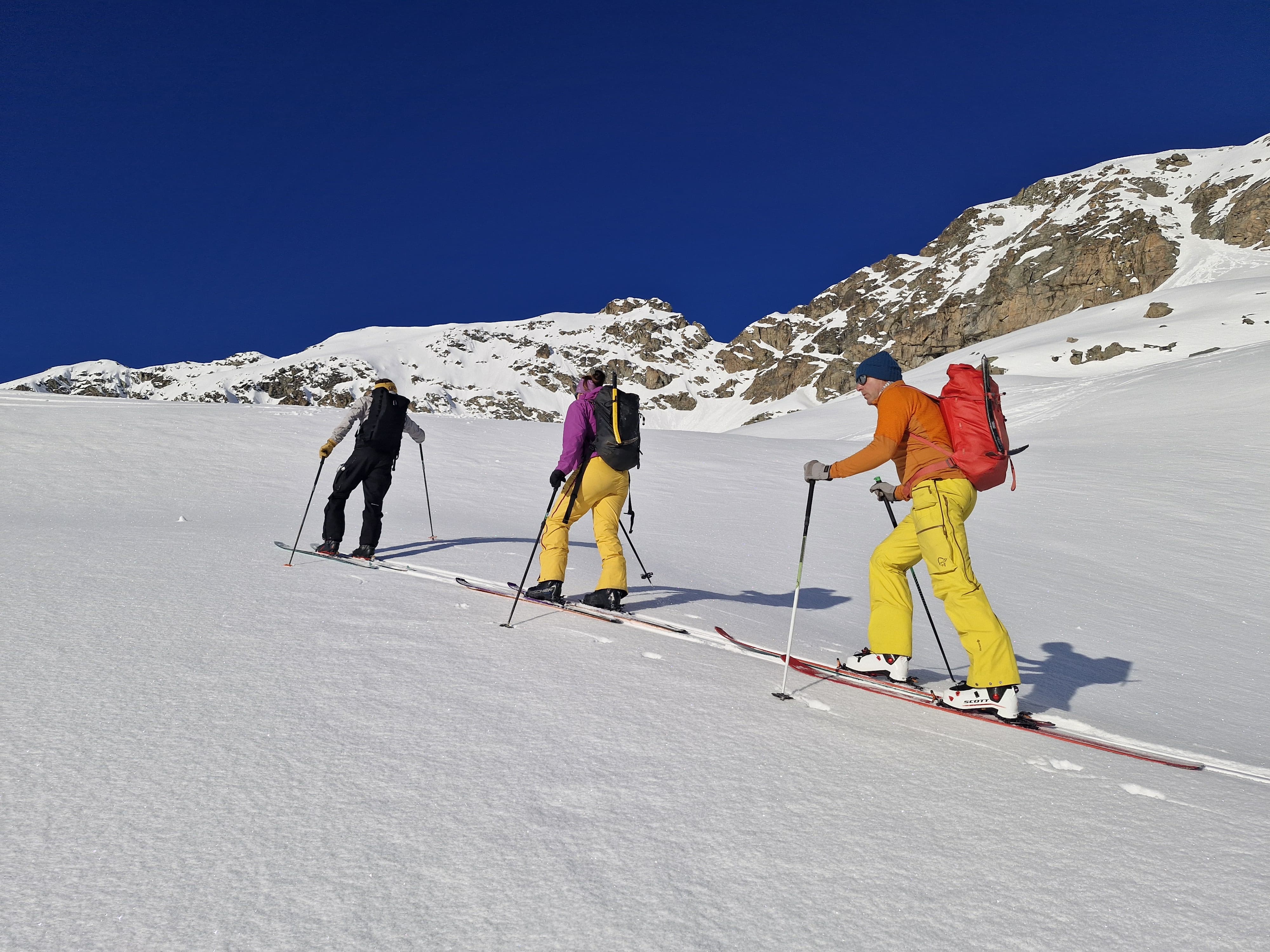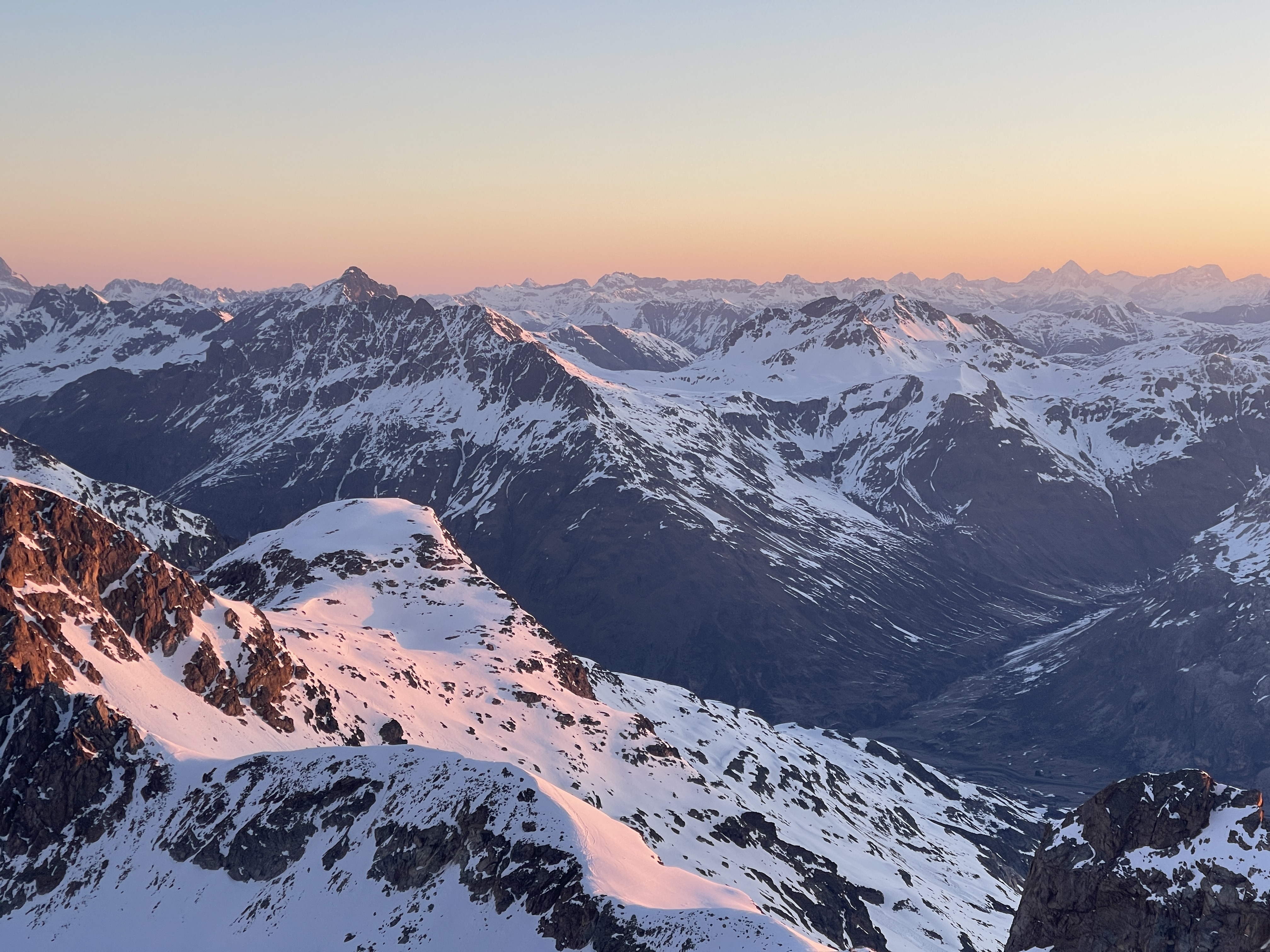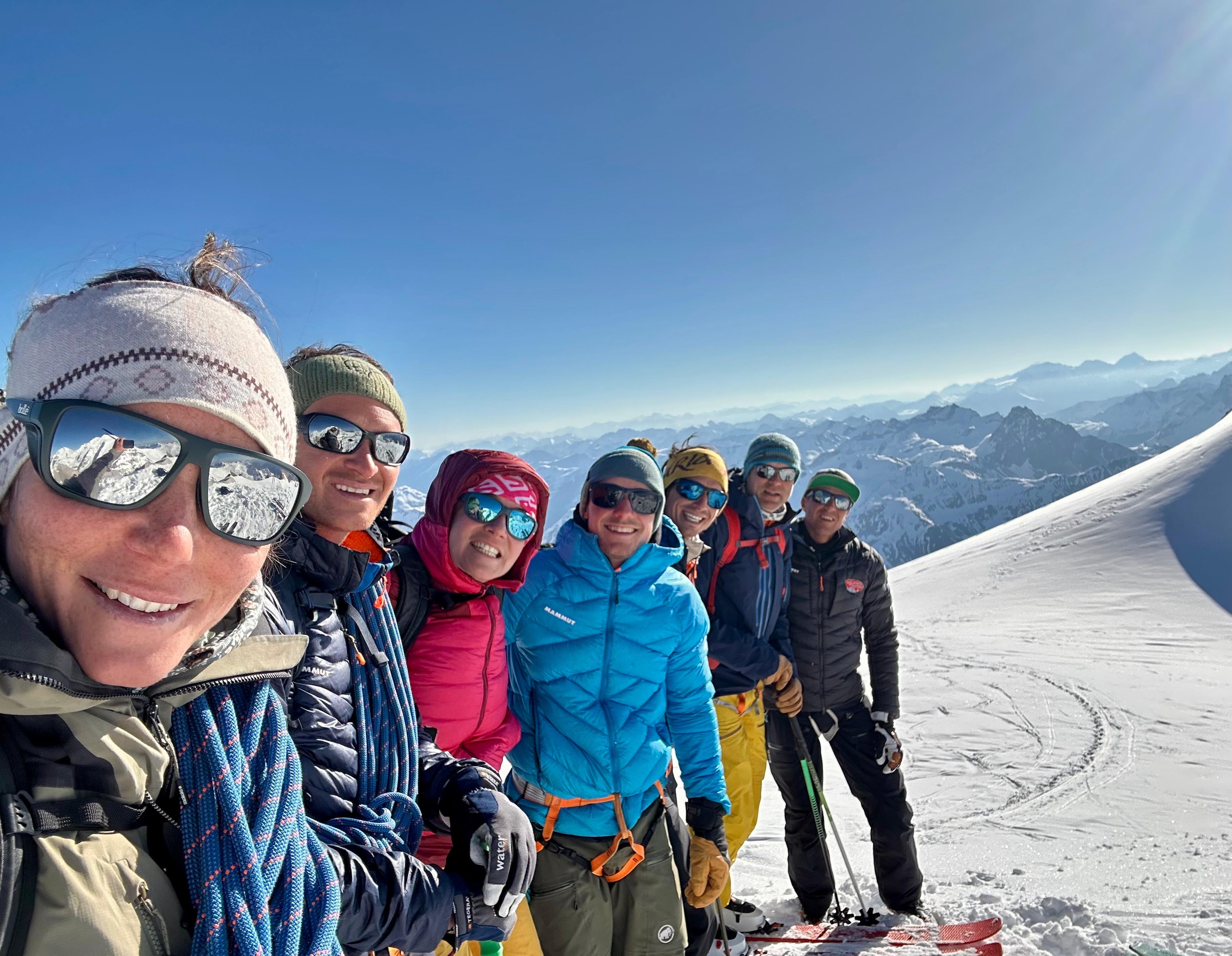 Un autre sommet emblématique du coin, je me réjouissais d’y aller. L’équipe à prévu de faire également une traversée et de descendre sur le col de la Bernina. La descente à l’air un peu raide mais bon, s’ils disent qu’on peut y aller, ils savent ce qu’ils font.