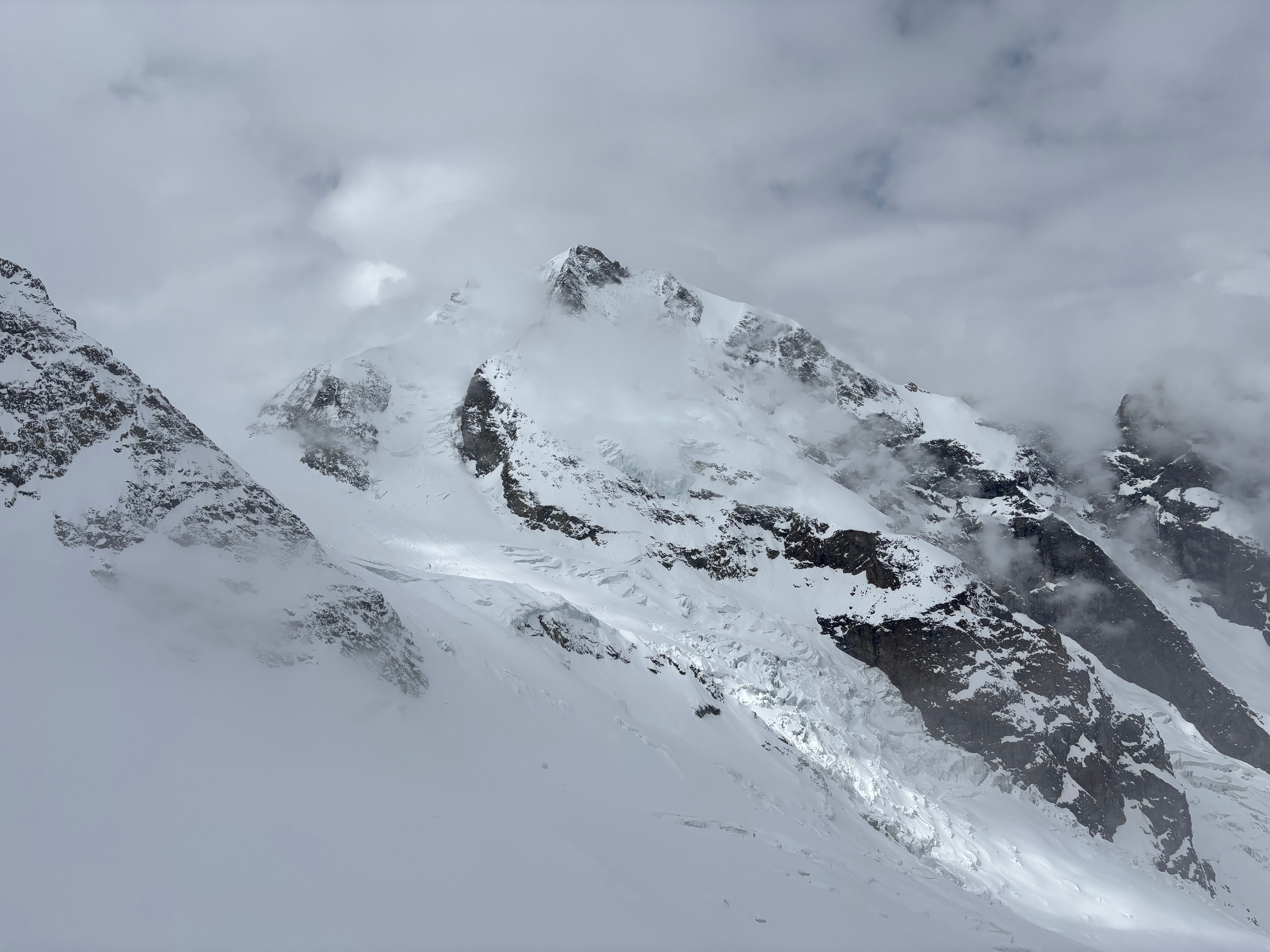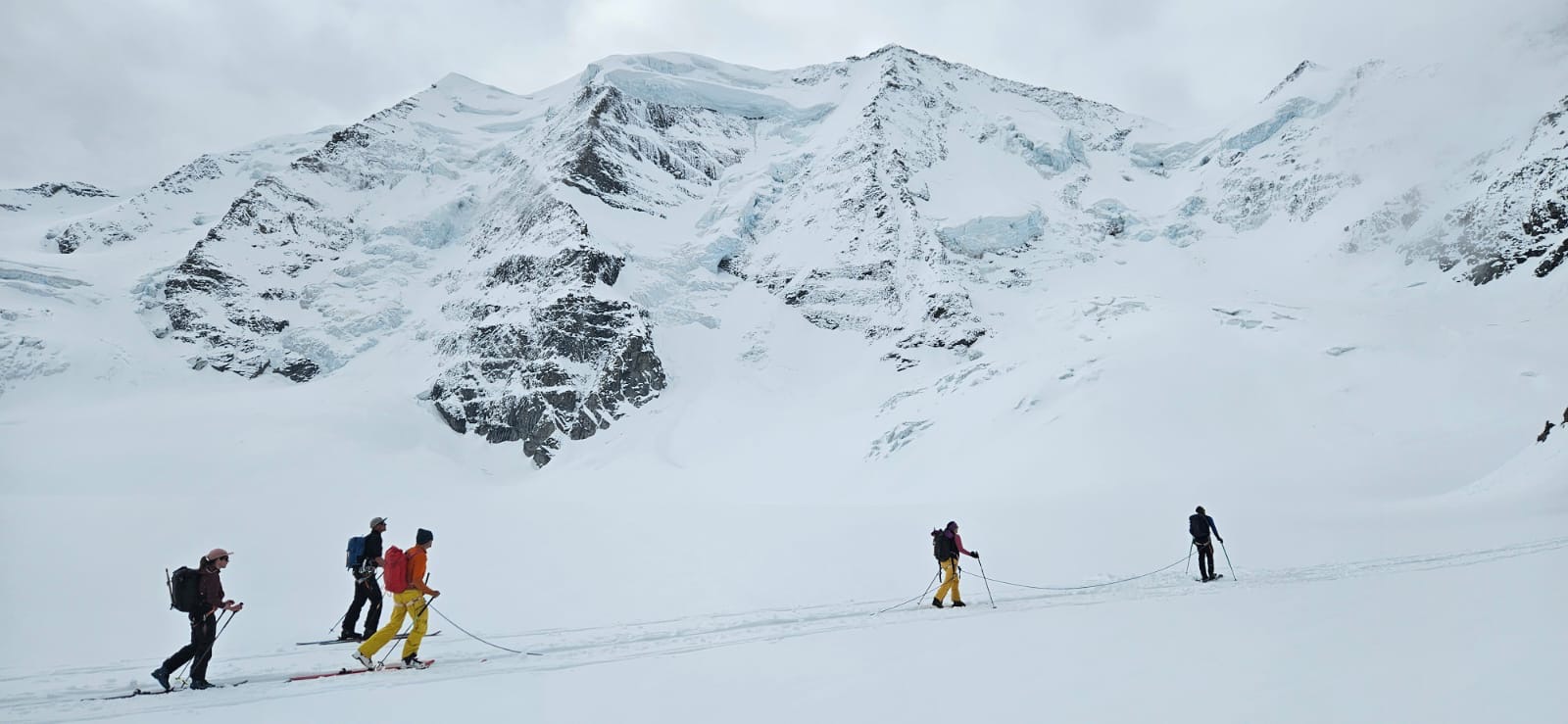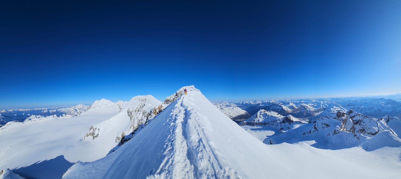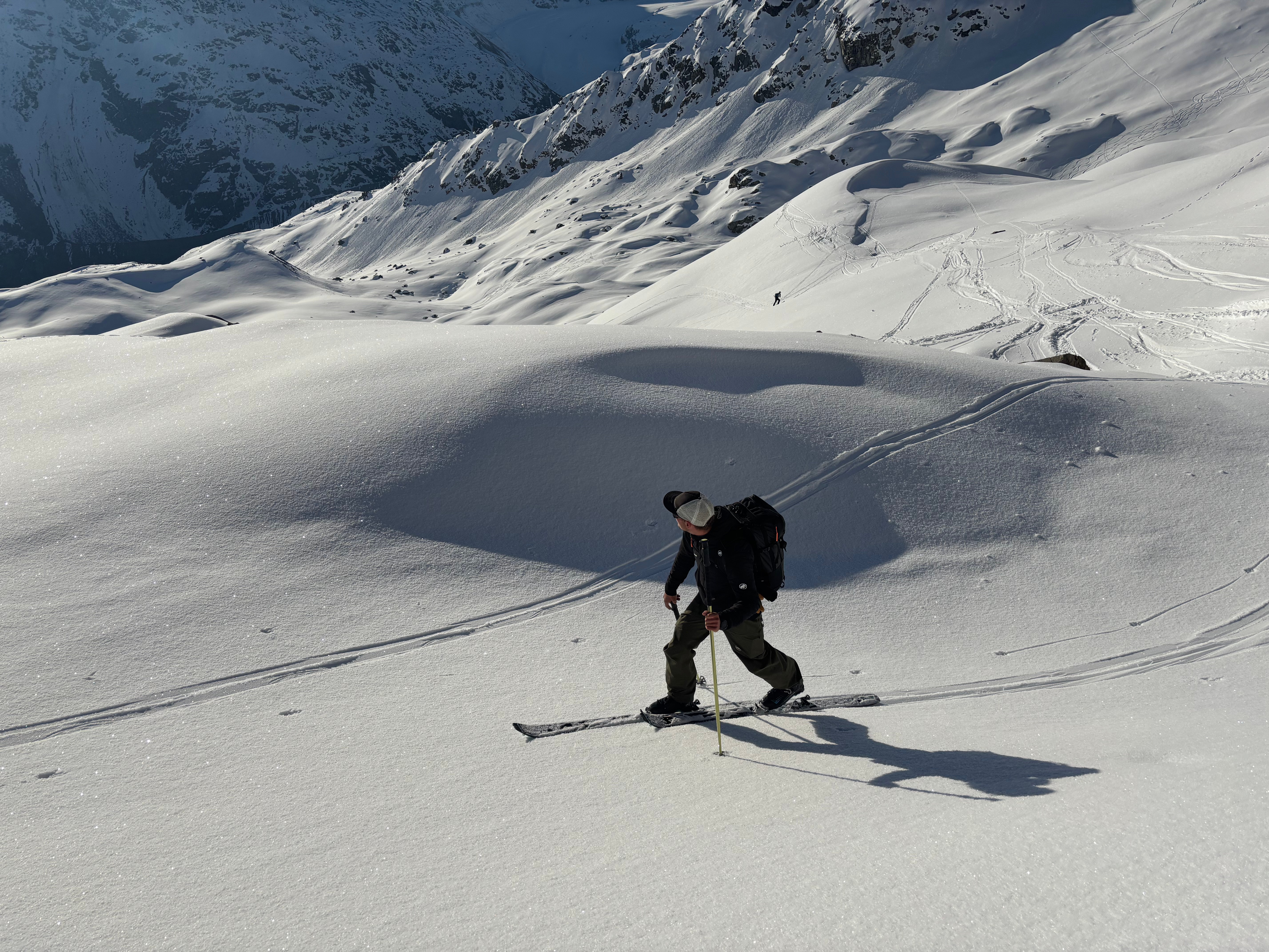 Un autre sommet emblématique du coin, je me réjouissais d’y aller. L’équipe à prévu de faire également une traversée et de descendre sur le col de la Bernina. La descente à l’air un peu raide mais bon, s’ils disent qu’on peut y aller, ils savent ce qu’ils font.