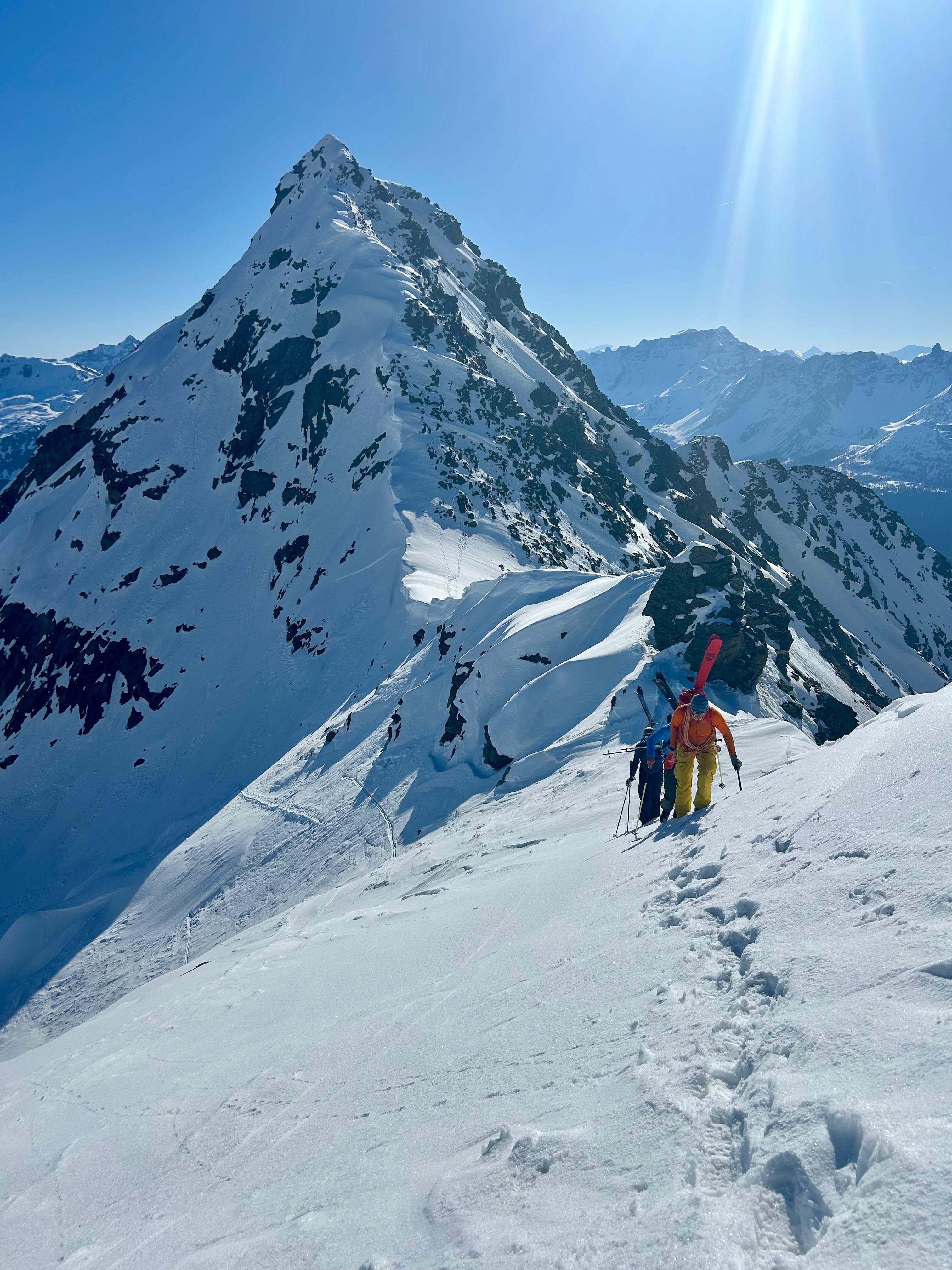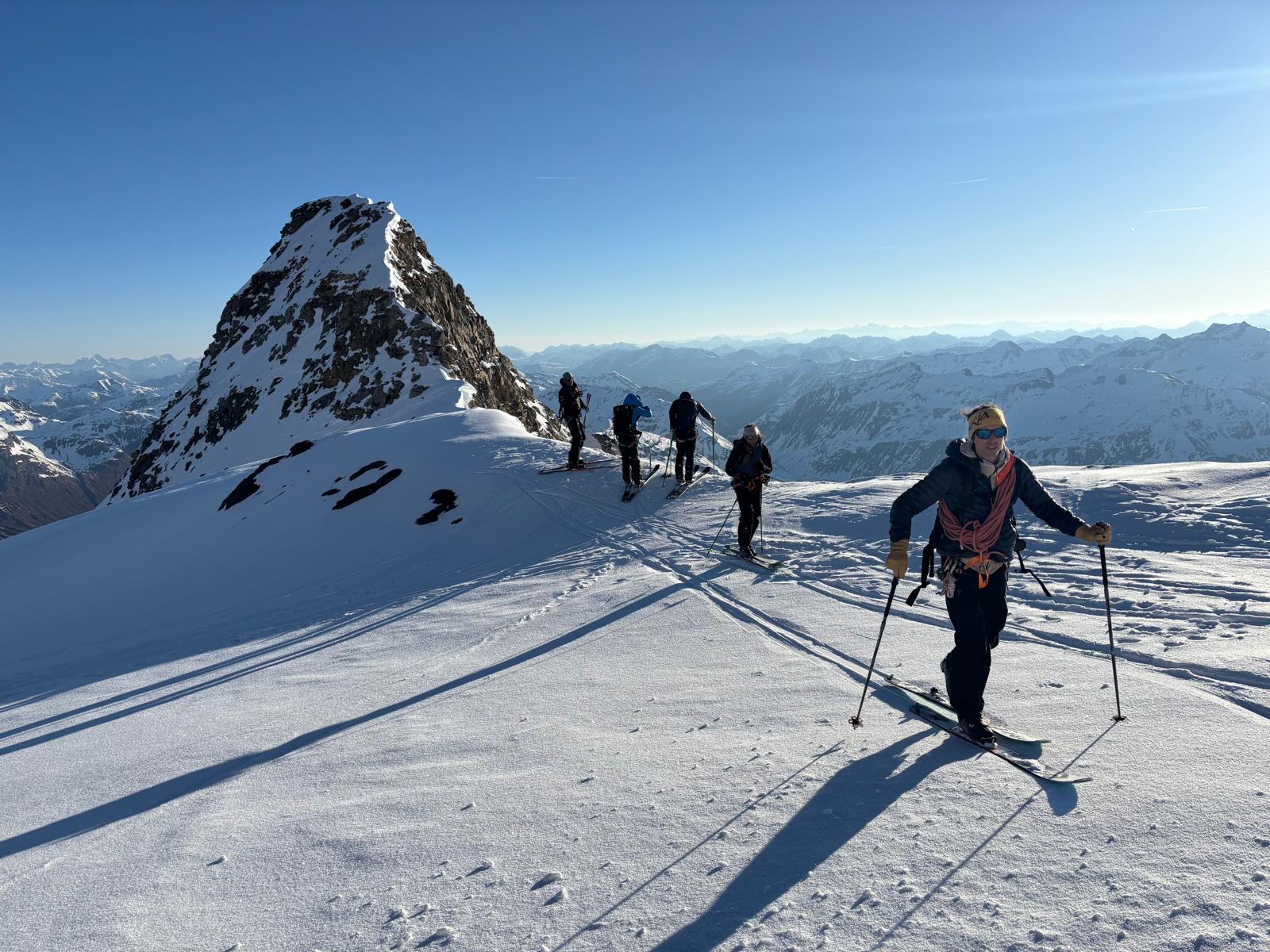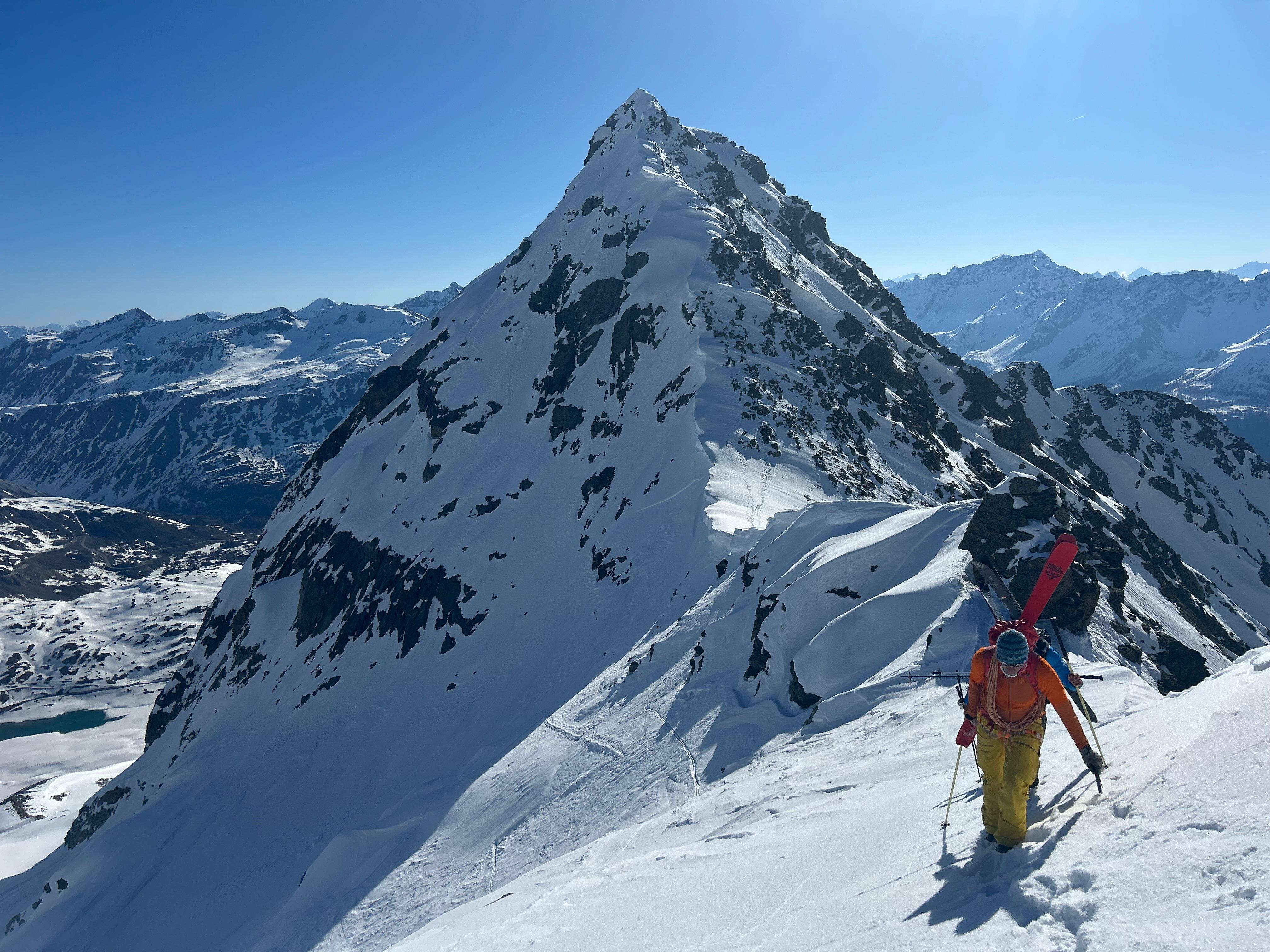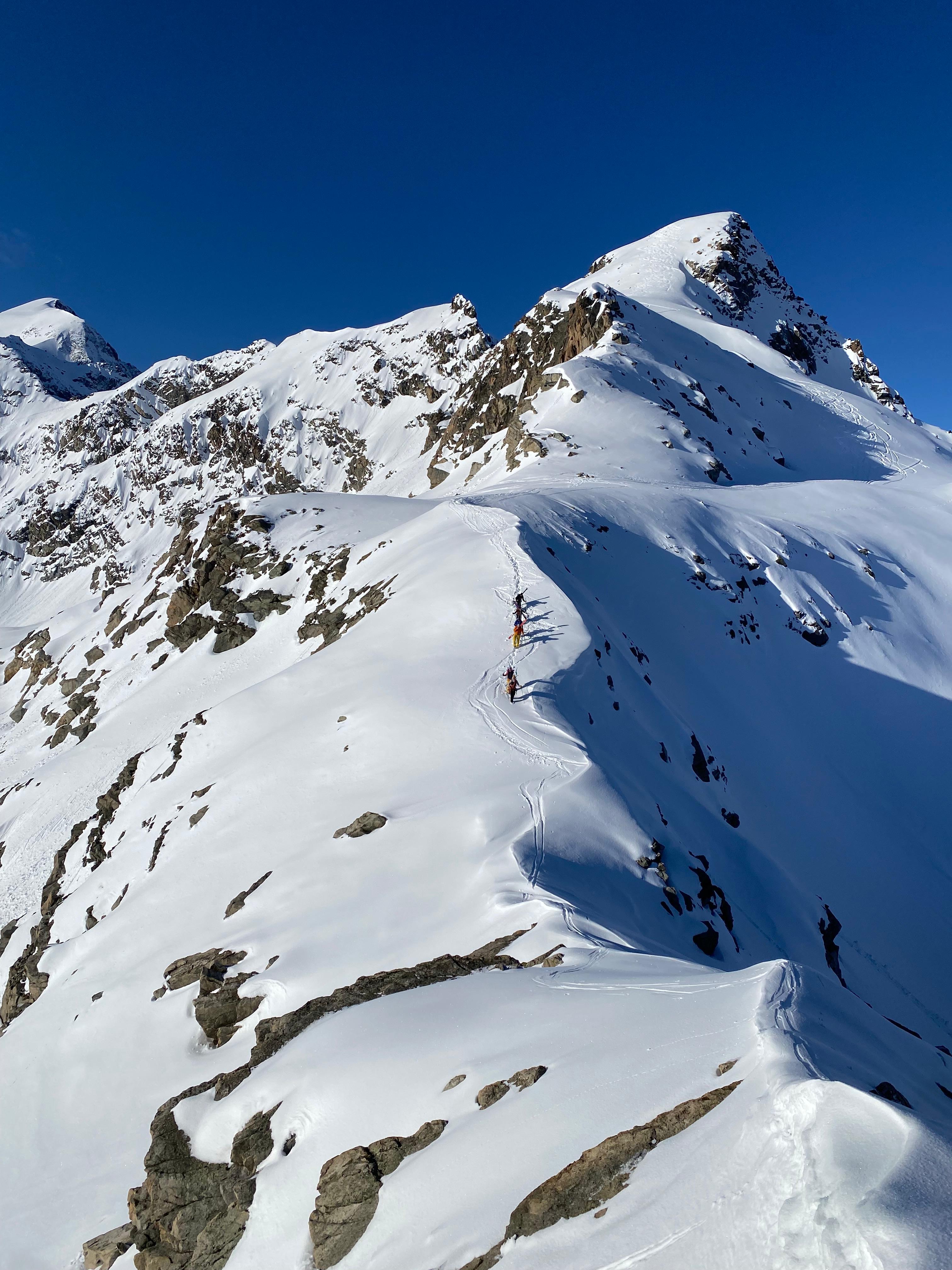 Arrivés sur la ligne de crête, on fait une petite pause puis on enlève les skis et on continue à pieds sur une arête avec quelques rochers pour arriver au Piz Mandra.