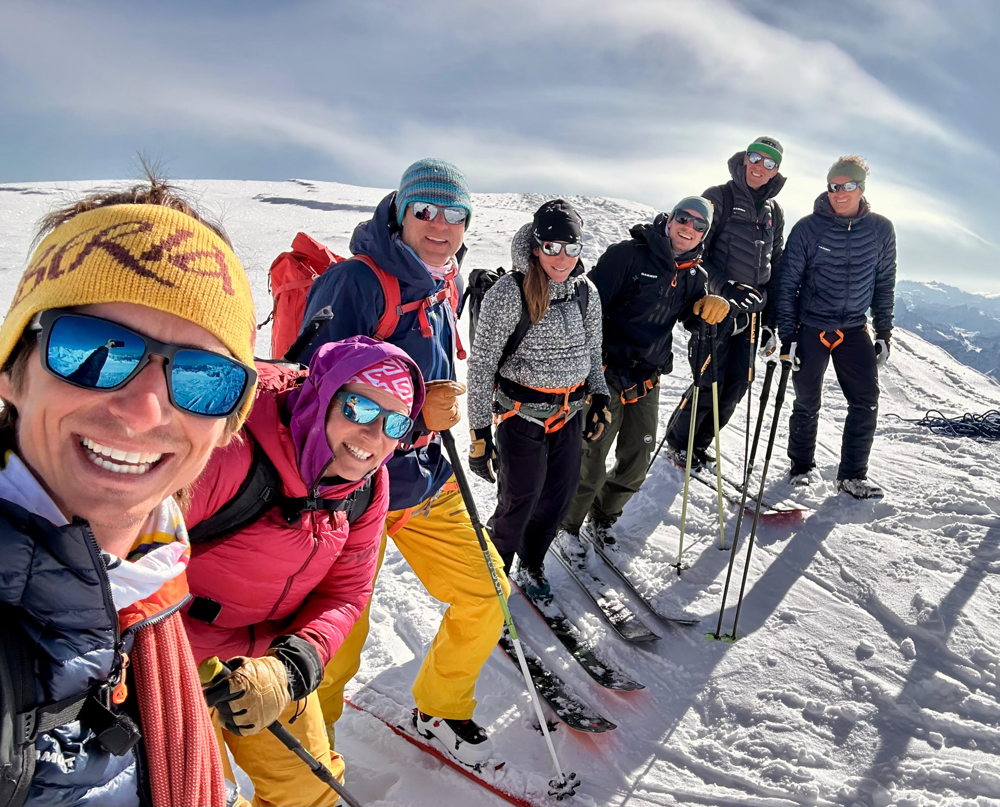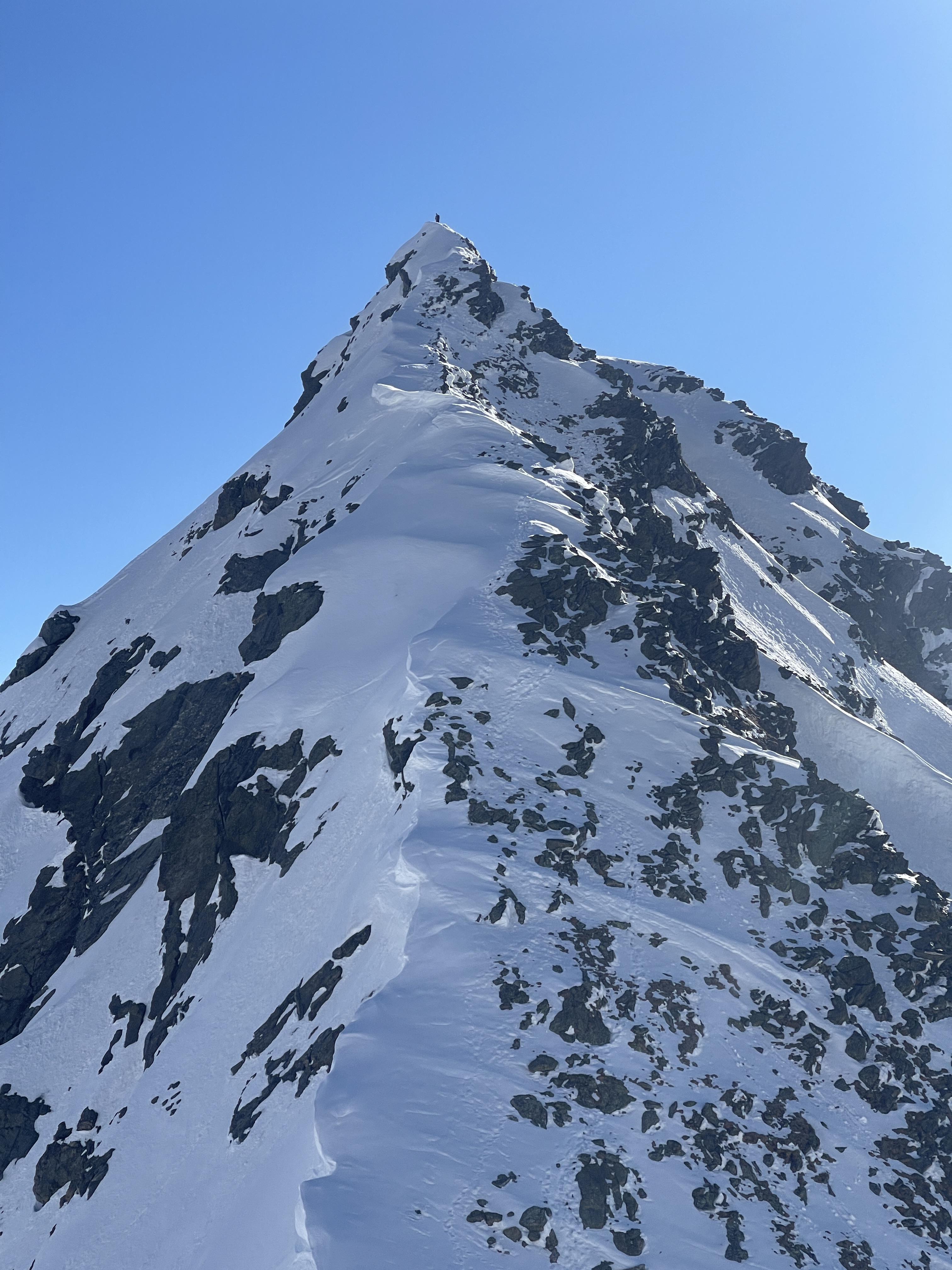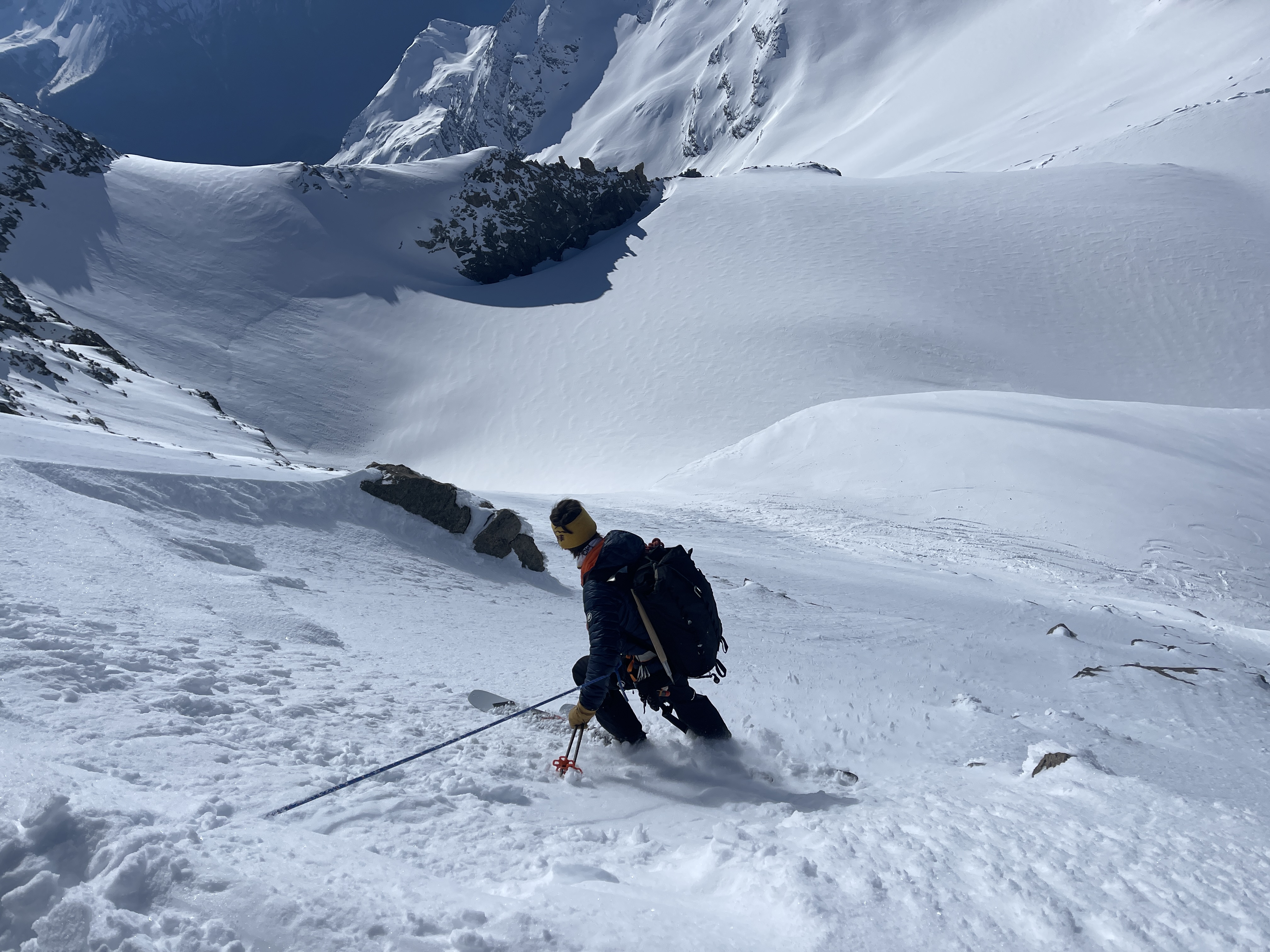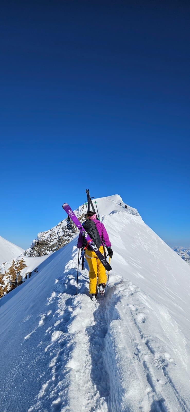 Bon c’est pas tout ça, nous aussi on arrive au petit col où, comme toute personne normalement constituée, nous enlevons nos skis et mettons les crampons pour attaquer l’arête. Johann me prend à sa corde et on y va, les conditions sont topissimes et je suis trop contente d’être là. On arrive au premier sommet puis au second, le sommet principal. Johann fait un encrage avec ses skis et nous mouline sur 60m dans la face sud. Après on peut recommencer à skier, c’est vraiment chouette.