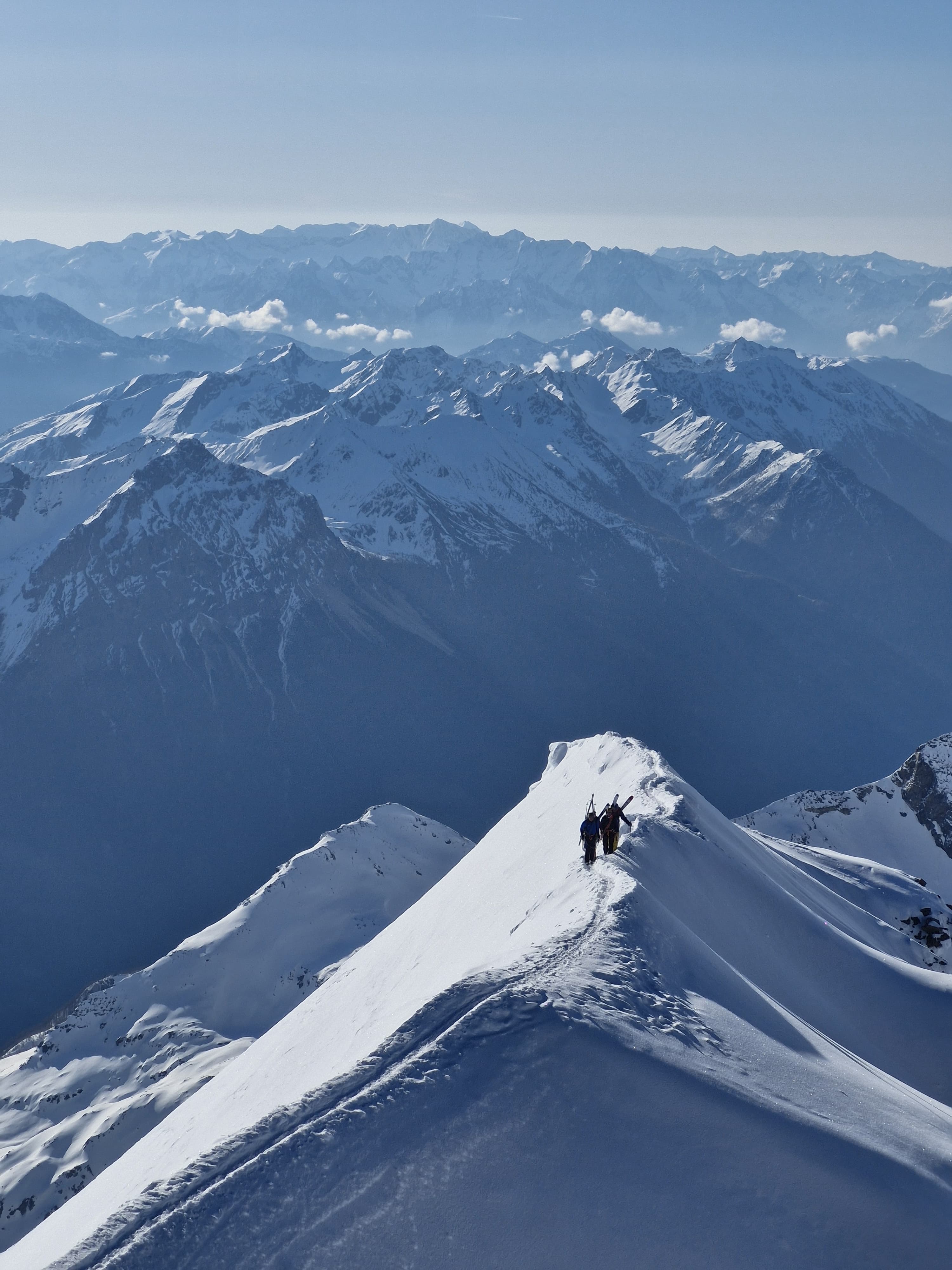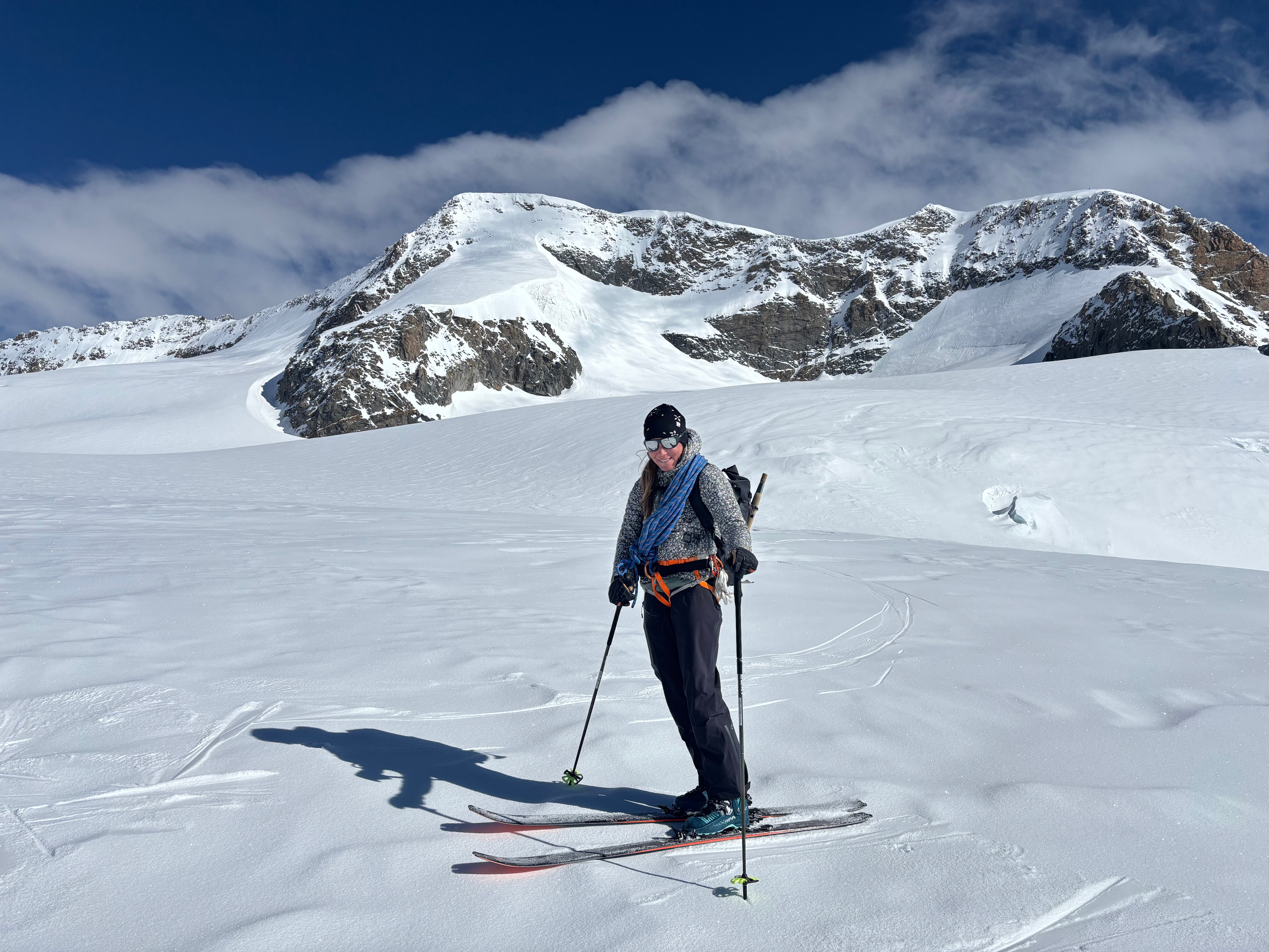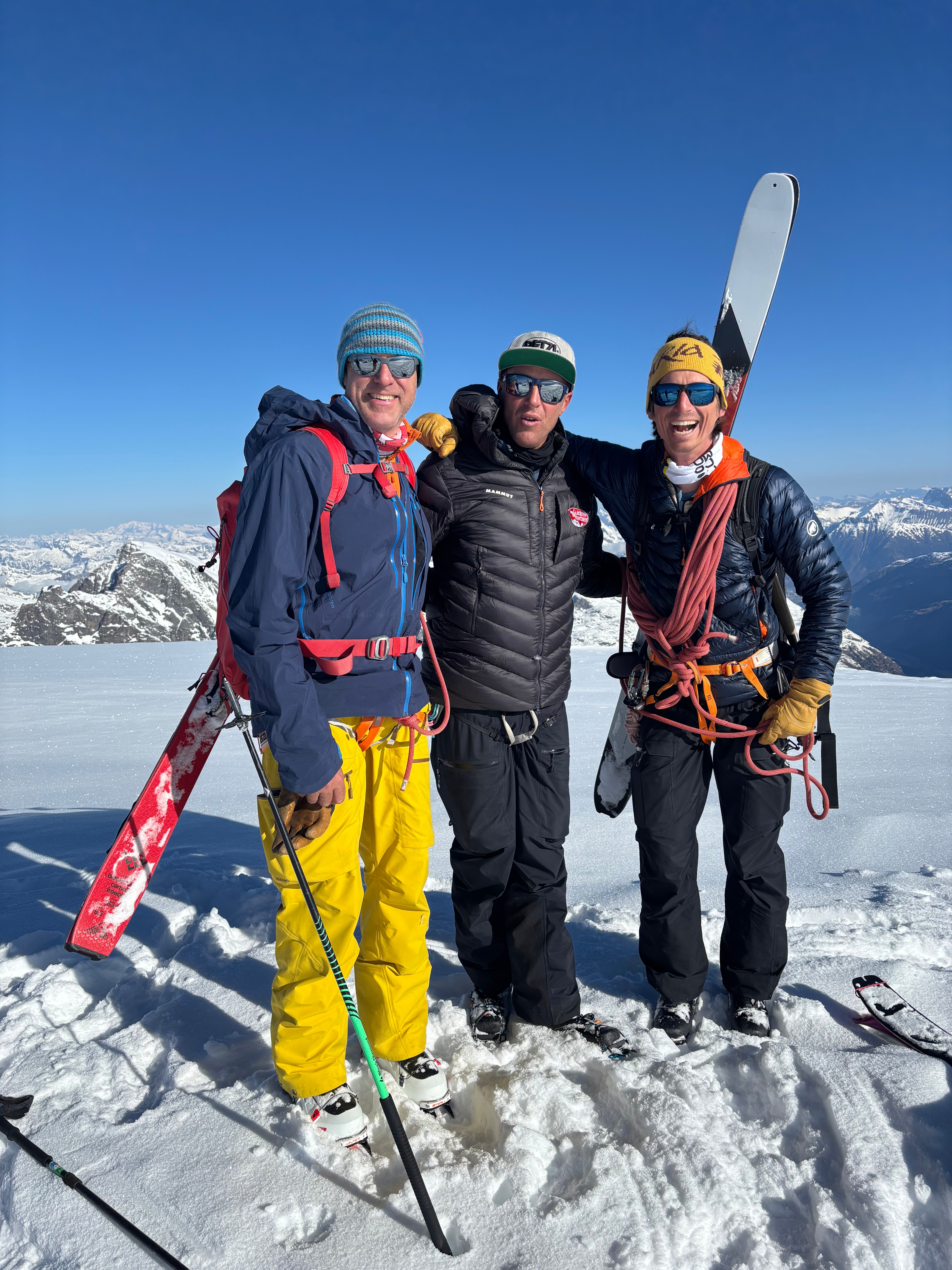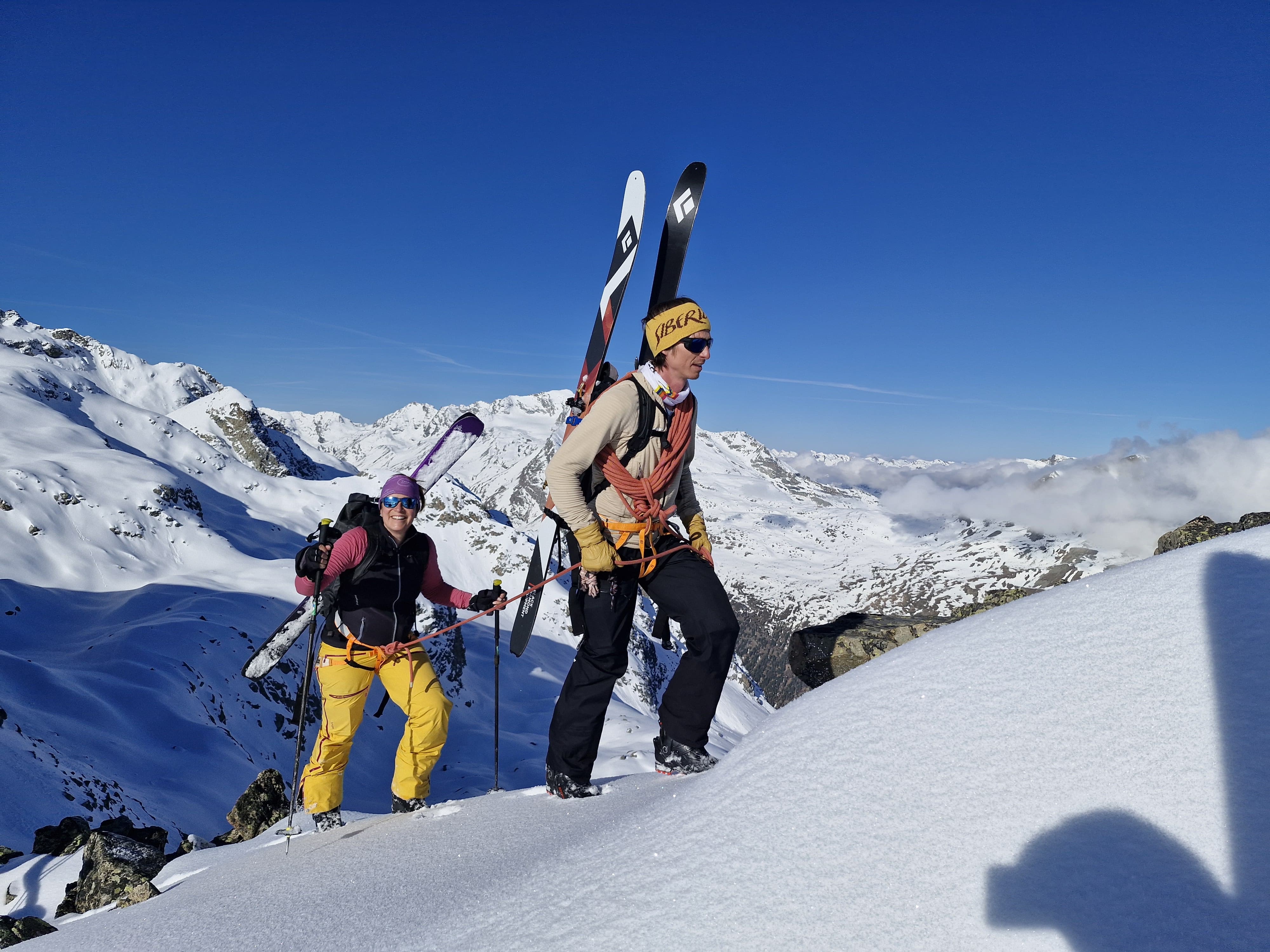 Bon c’est pas tout ça, nous aussi on arrive au petit col où, comme toute personne normalement constituée, nous enlevons nos skis et mettons les crampons pour attaquer l’arête. Johann me prend à sa corde et on y va, les conditions sont topissimes et je suis trop contente d’être là. On arrive au premier sommet puis au second, le sommet principal. Johann fait un encrage avec ses skis et nous mouline sur 60m dans la face sud. Après on peut recommencer à skier, c’est vraiment chouette.
