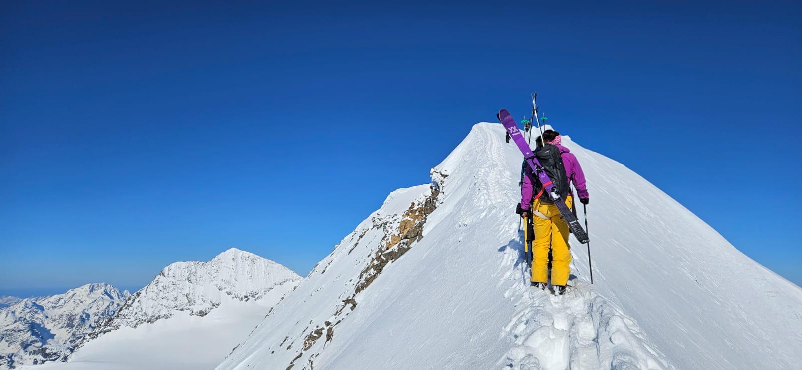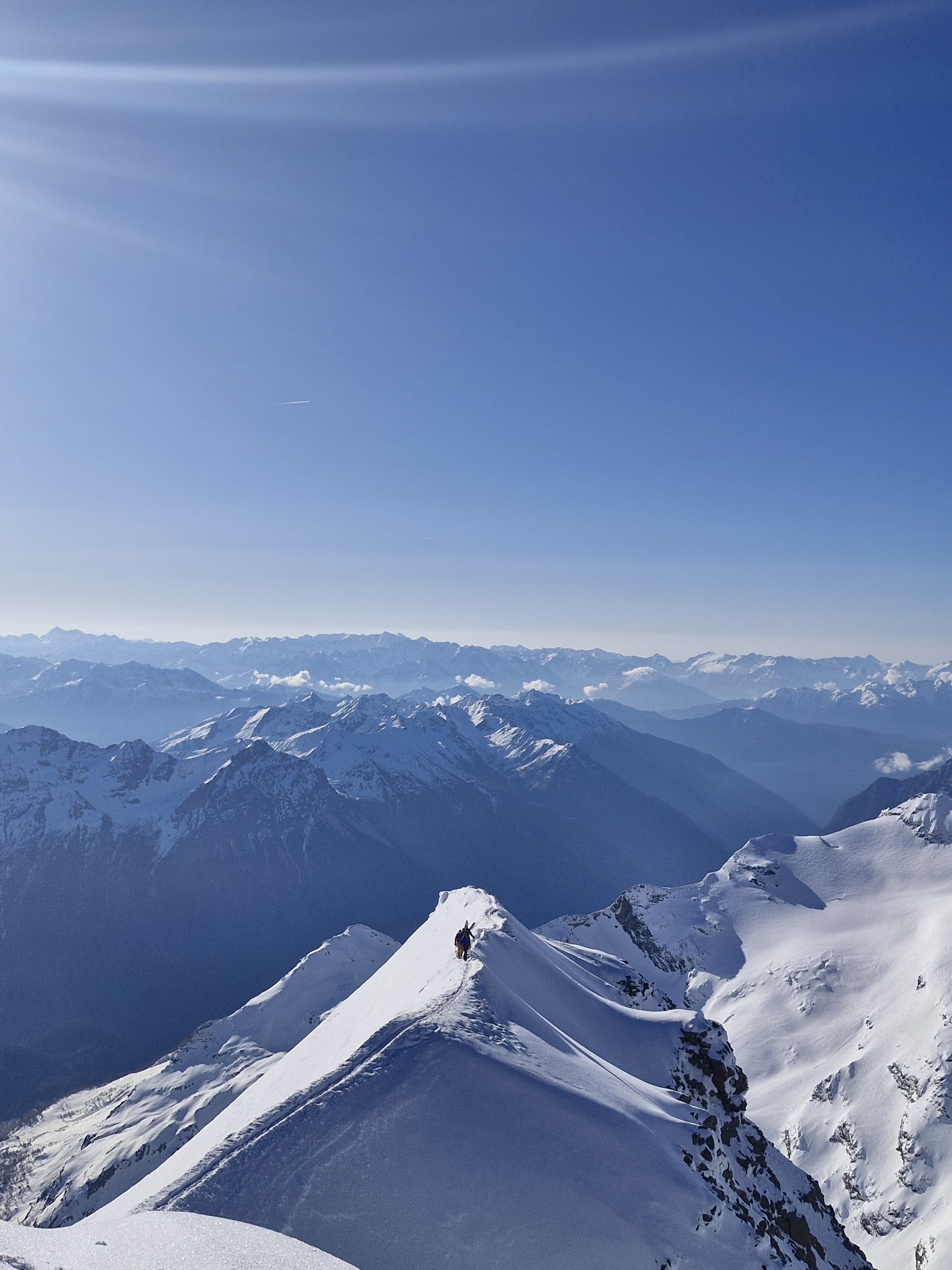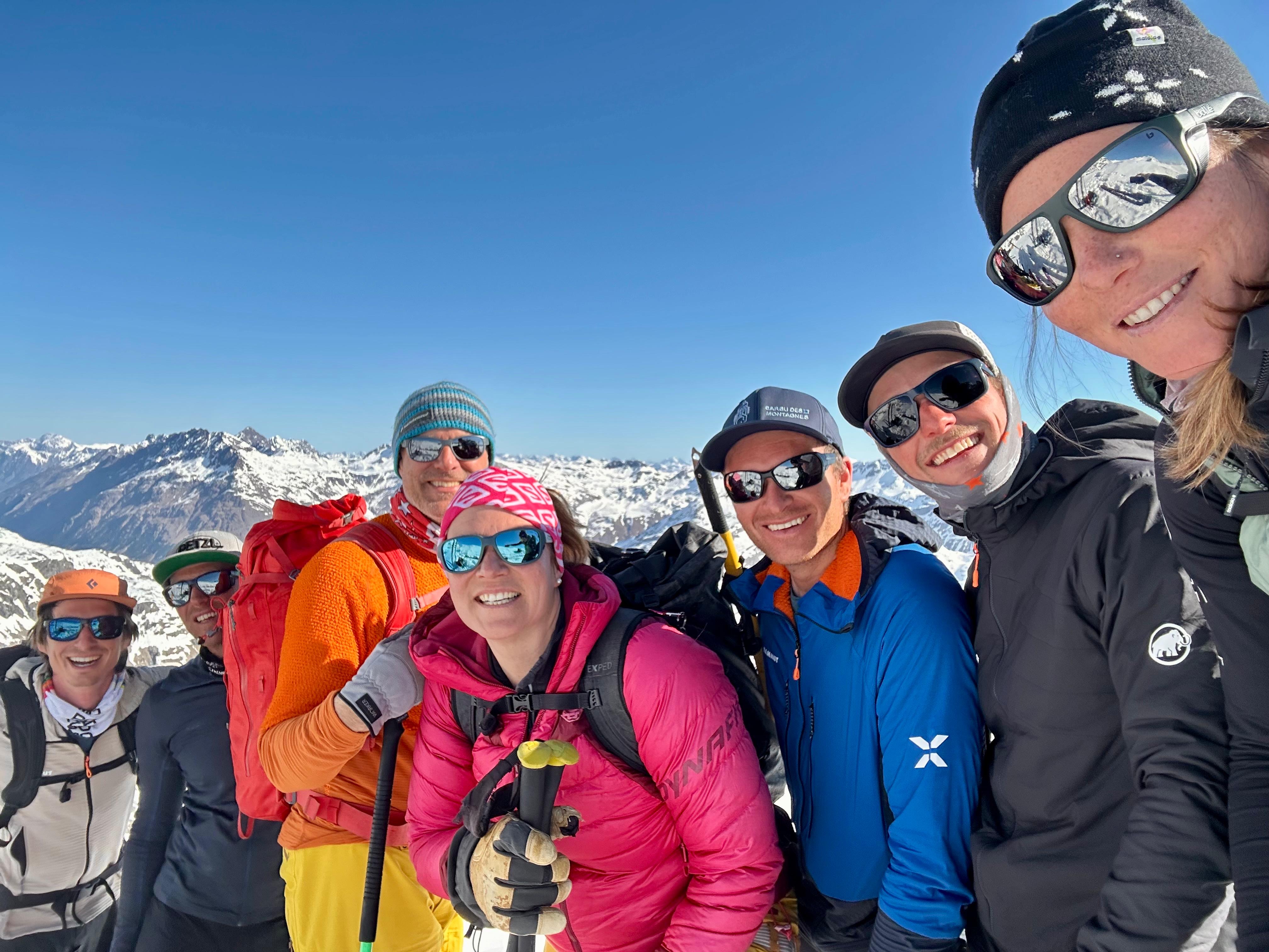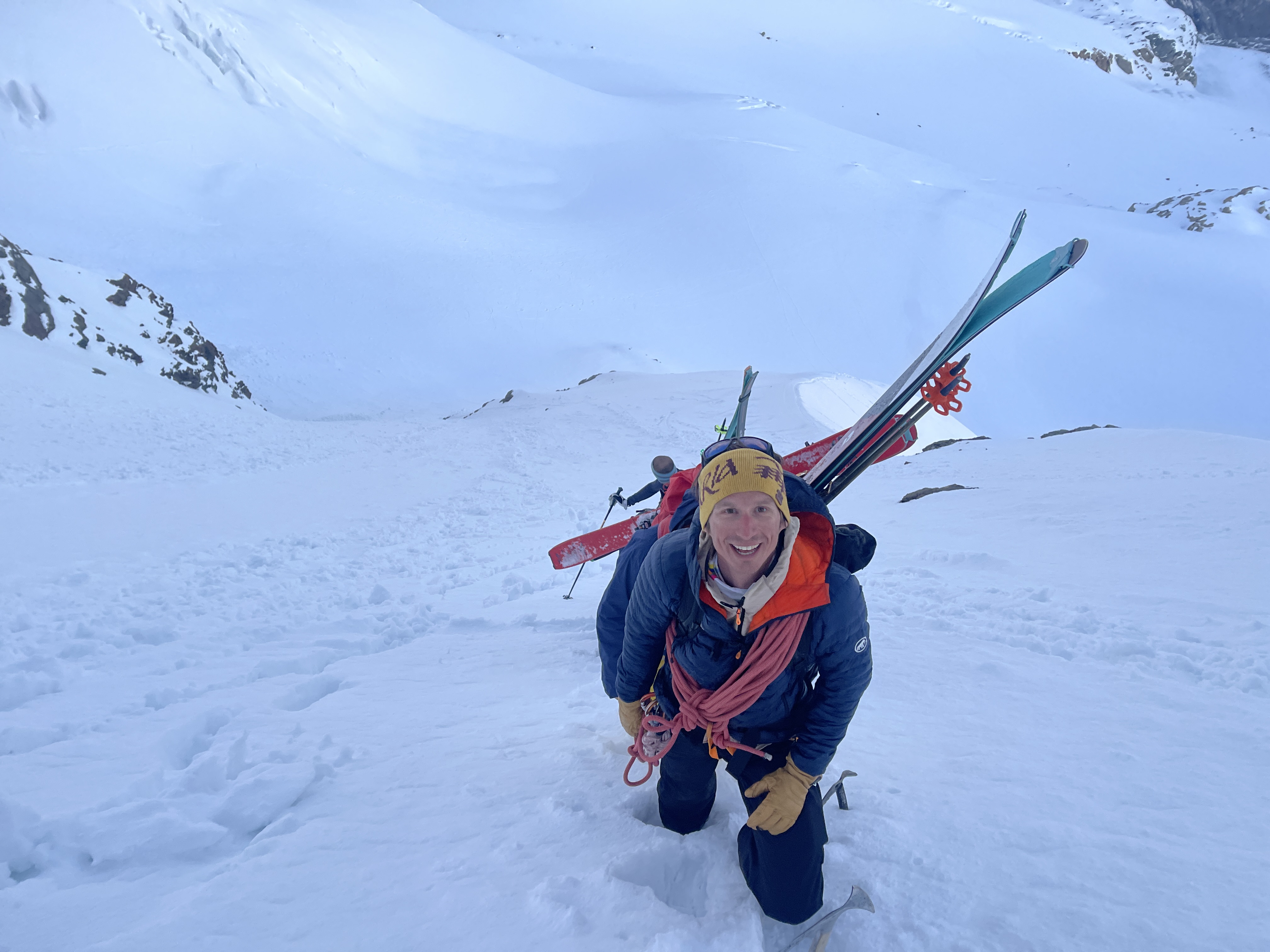 Bon c’est pas tout ça, nous aussi on arrive au petit col où, comme toute personne normalement constituée, nous enlevons nos skis et mettons les crampons pour attaquer l’arête. Johann me prend à sa corde et on y va, les conditions sont topissimes et je suis trop contente d’être là. On arrive au premier sommet puis au second, le sommet principal. Johann fait un encrage avec ses skis et nous mouline sur 60m dans la face sud. Après on peut recommencer à skier, c’est vraiment chouette.