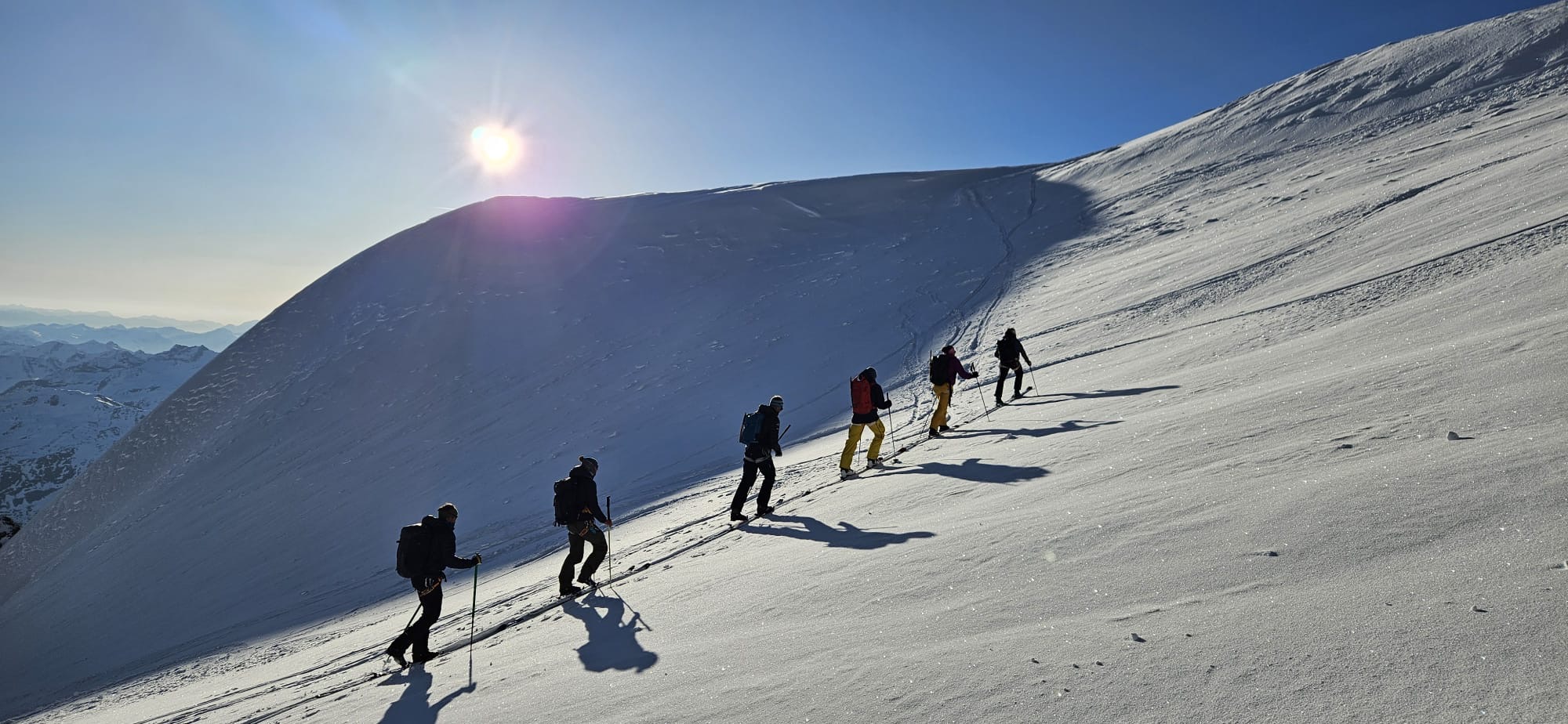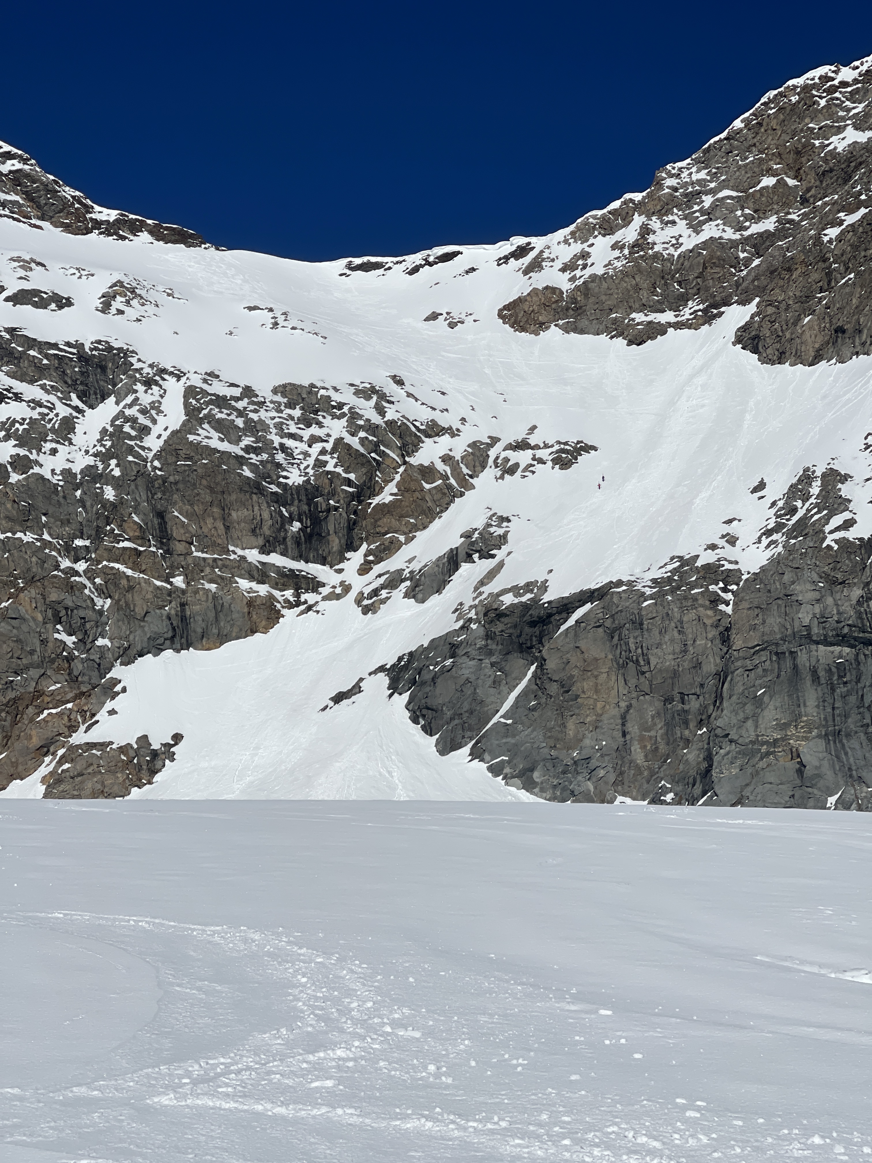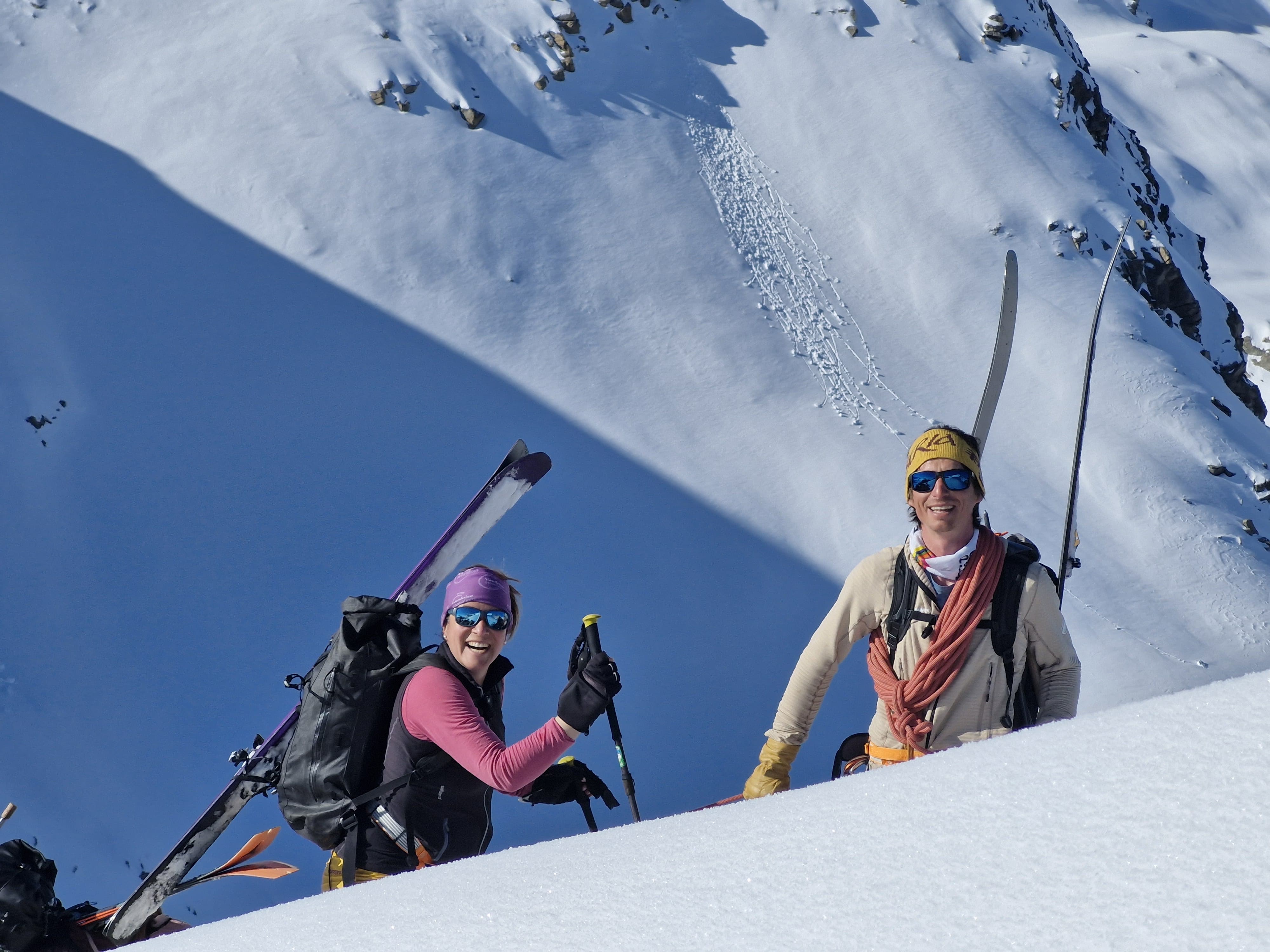 On est trop tôt au sommet. Purée, je crois bien que c’est la première fois de ma vie que ça m’arrive, j’ai plutôt l’habitude de courir après le temps perdu. Cédric en profite pour nous expliquer les différentes techniques pour assurer une personne en skis de pente raide, techniques que nous avons tout loisirs d’exercer sur une petite pente pas exposée sous le sommet. Après ce tour de chauffe, on part dans la vraie pente. C’est trop beau. Il y a un petit verrou à passer, pas large, bien raide et sur mon mauvais pieds. Jo m’aide et ça ne va pas trop mal, ensuite on est vite en bas du passage raide. Et comme la veille, on se fait super plaisir dans la descente, même si pour la démo de ski synchronisé, y a encore un peu de travail, ça ne ressemblait à rien !