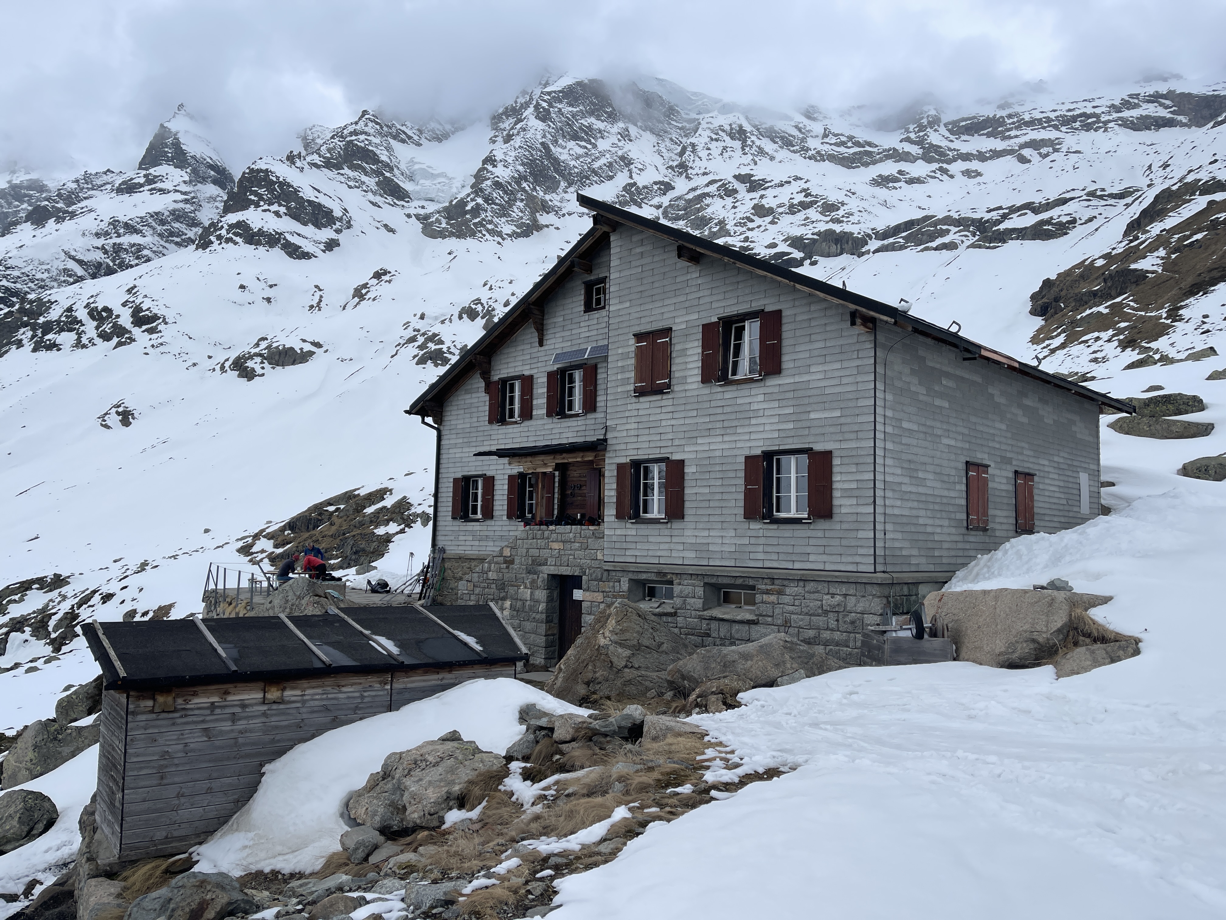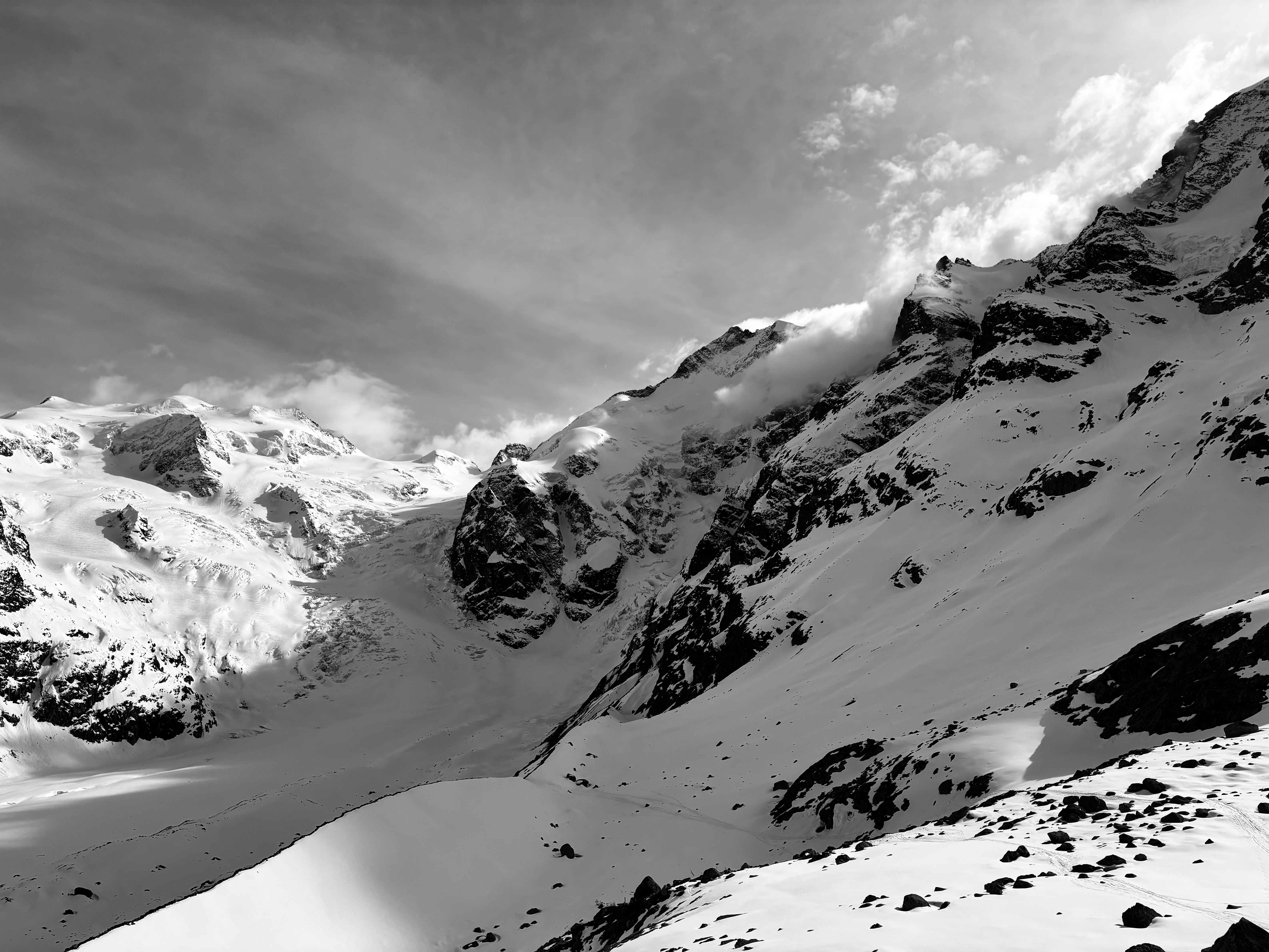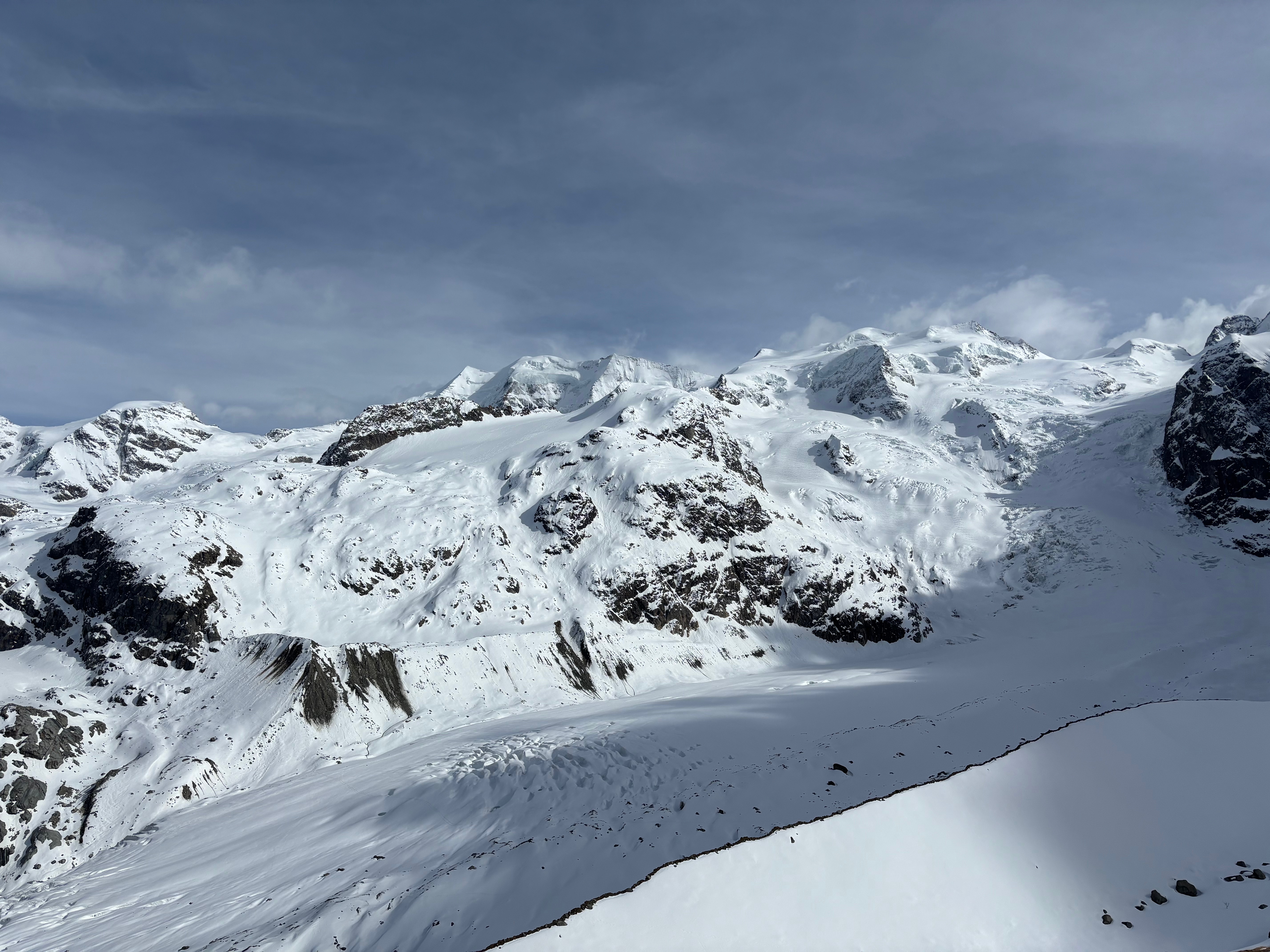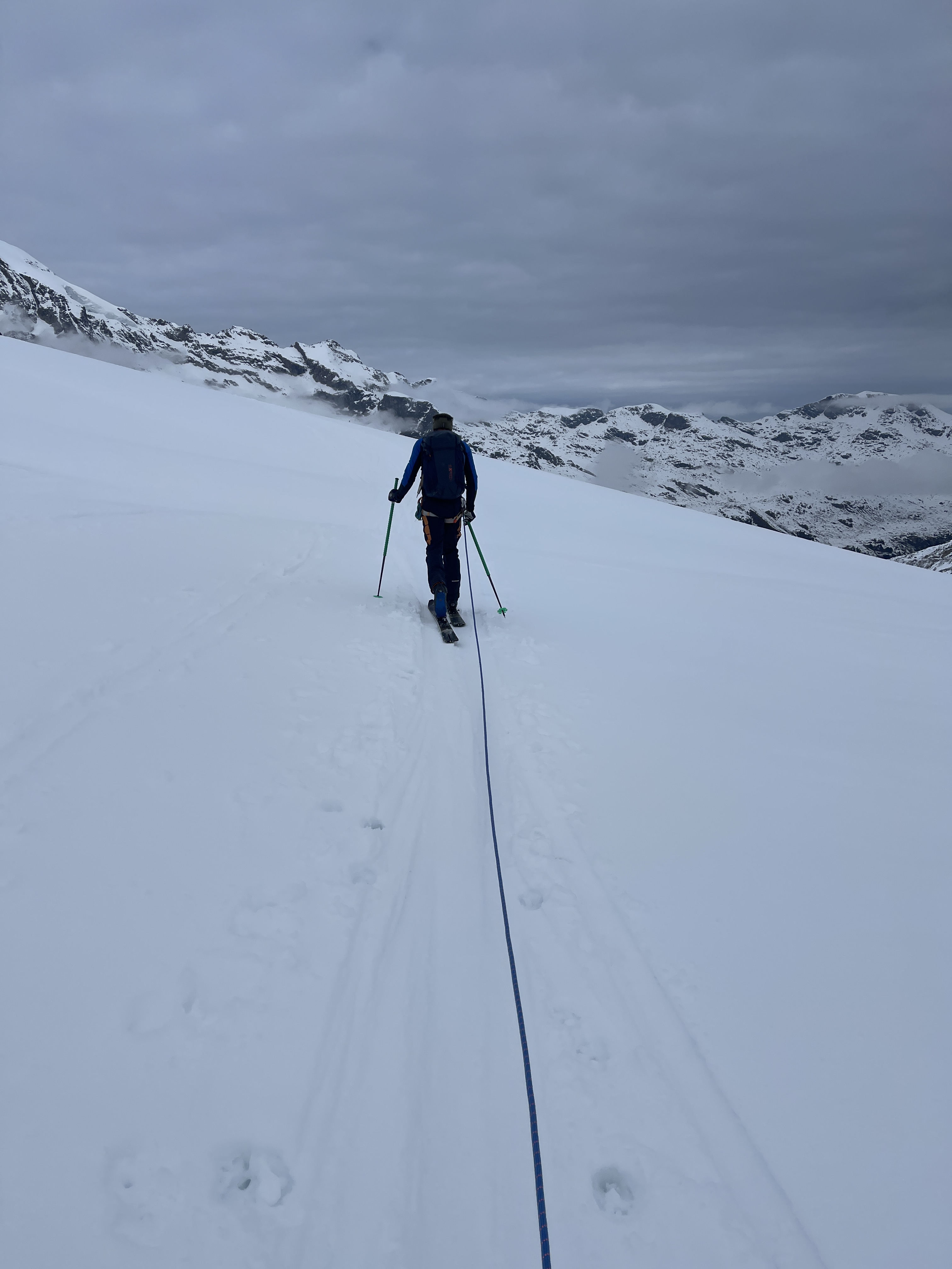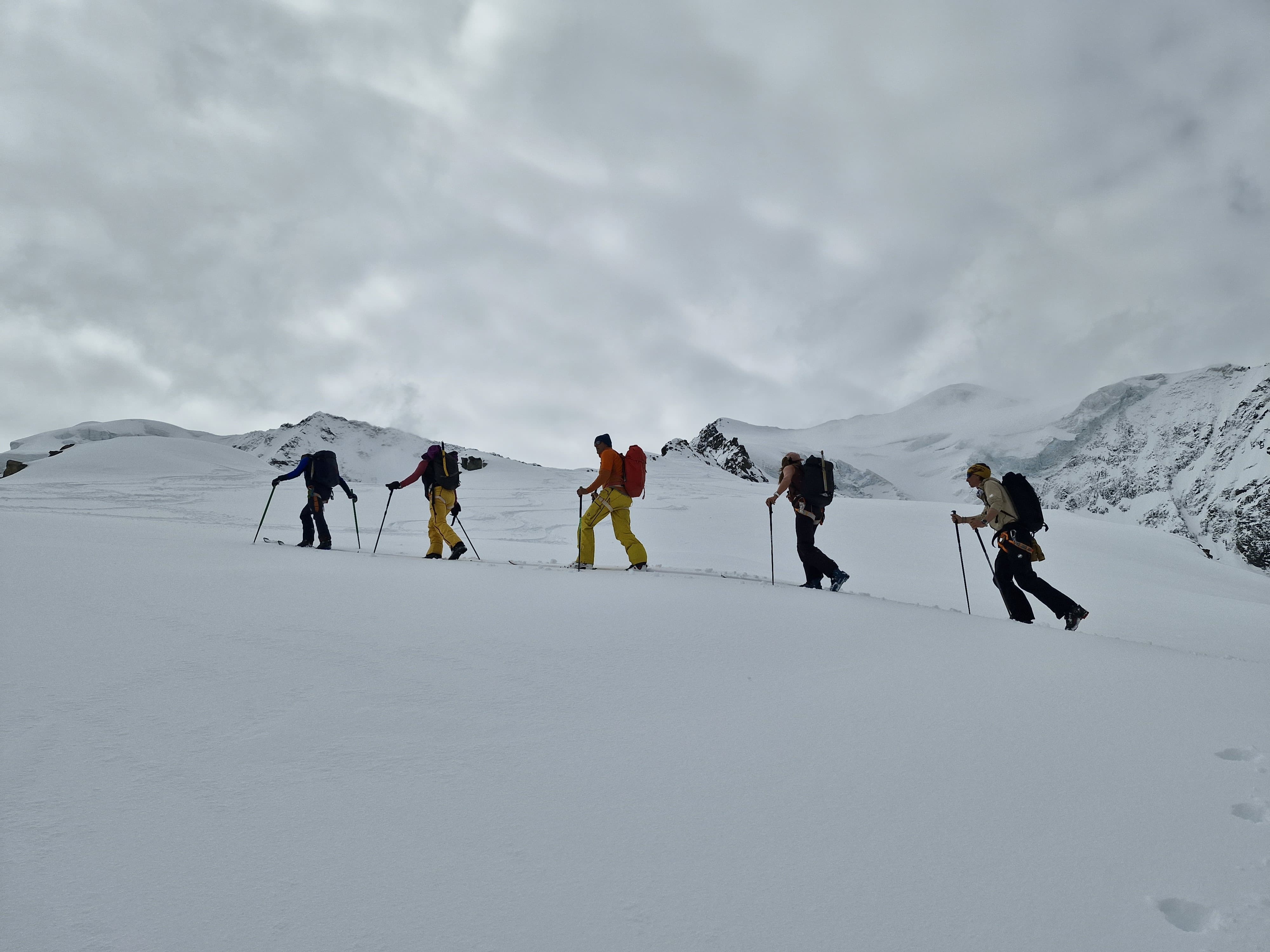 La descente sur le glacier est désagréable, mais dès qu’on met les peaux et qu’on commence à traverser, c’est vraiment chouette. Il ne fait pas super beau mais il n’y a pas de vent, Johann est devant et marche à un super rythme, c’est top. Après le plat on fait une petite pause pour boire et manger un truc et on commence à monter. Alors là ça se corse … je souffle fort, je sens que je ne suis presque pas allé en altitude cette saison. J’essaie de m’accrocher au max et de ne pas (trop) faire mon boulet. On arrive d’abord à un petit sommet qui s’appelle Gemsfreiheit, puis on continue sur l’arête de Fortezza tant qu’elle est neigeuse et on s’arrête au début des rochers. Cela va nous permettre de faire une super descente sur le glacier de Morteratsch avant de remonter la moraine pour rejoindre la cabane Boval. Le soir, Émilie nous fait une leçon sur la gestion de groupe et la prise de décision, c’est super intéressant.