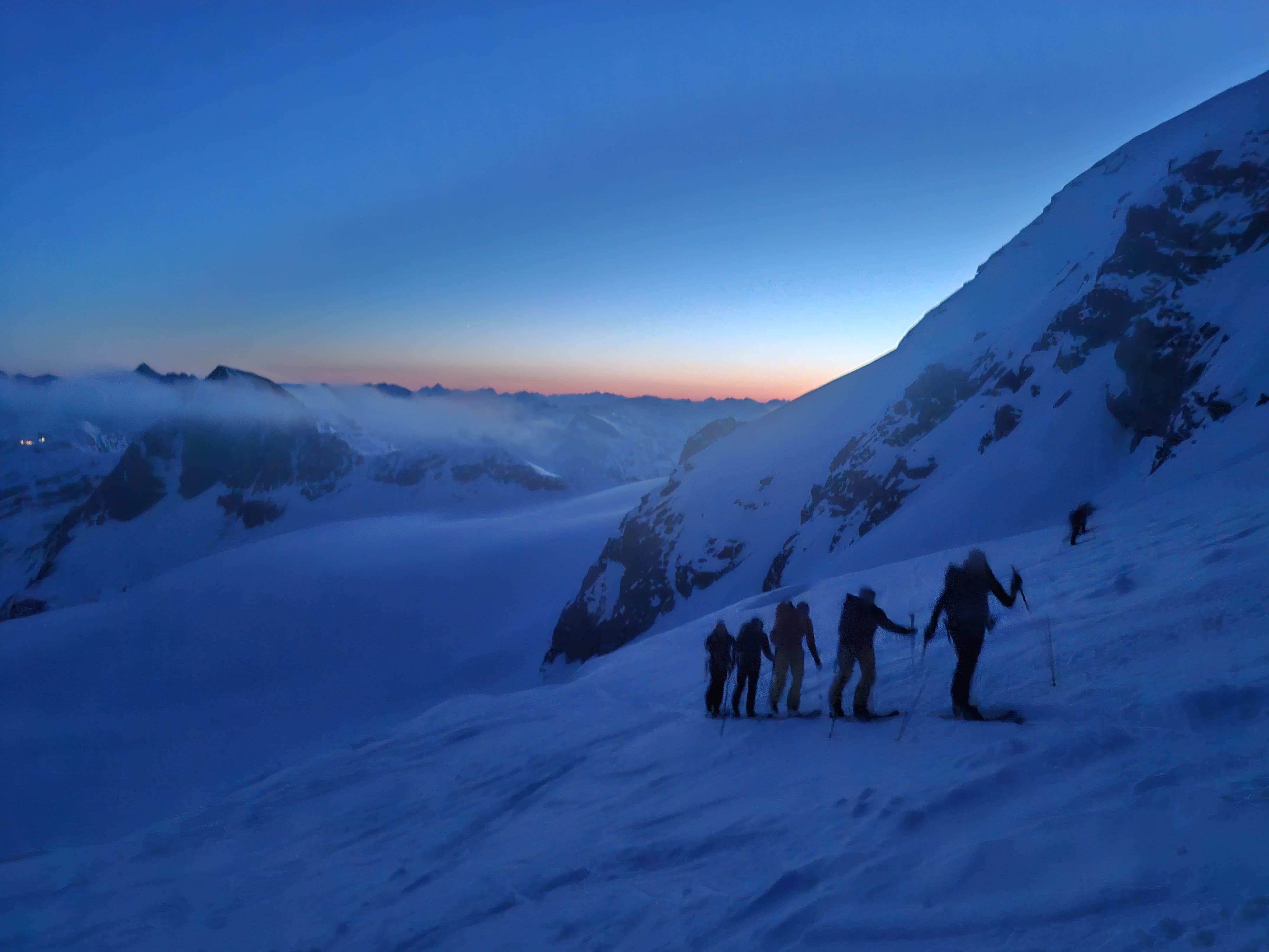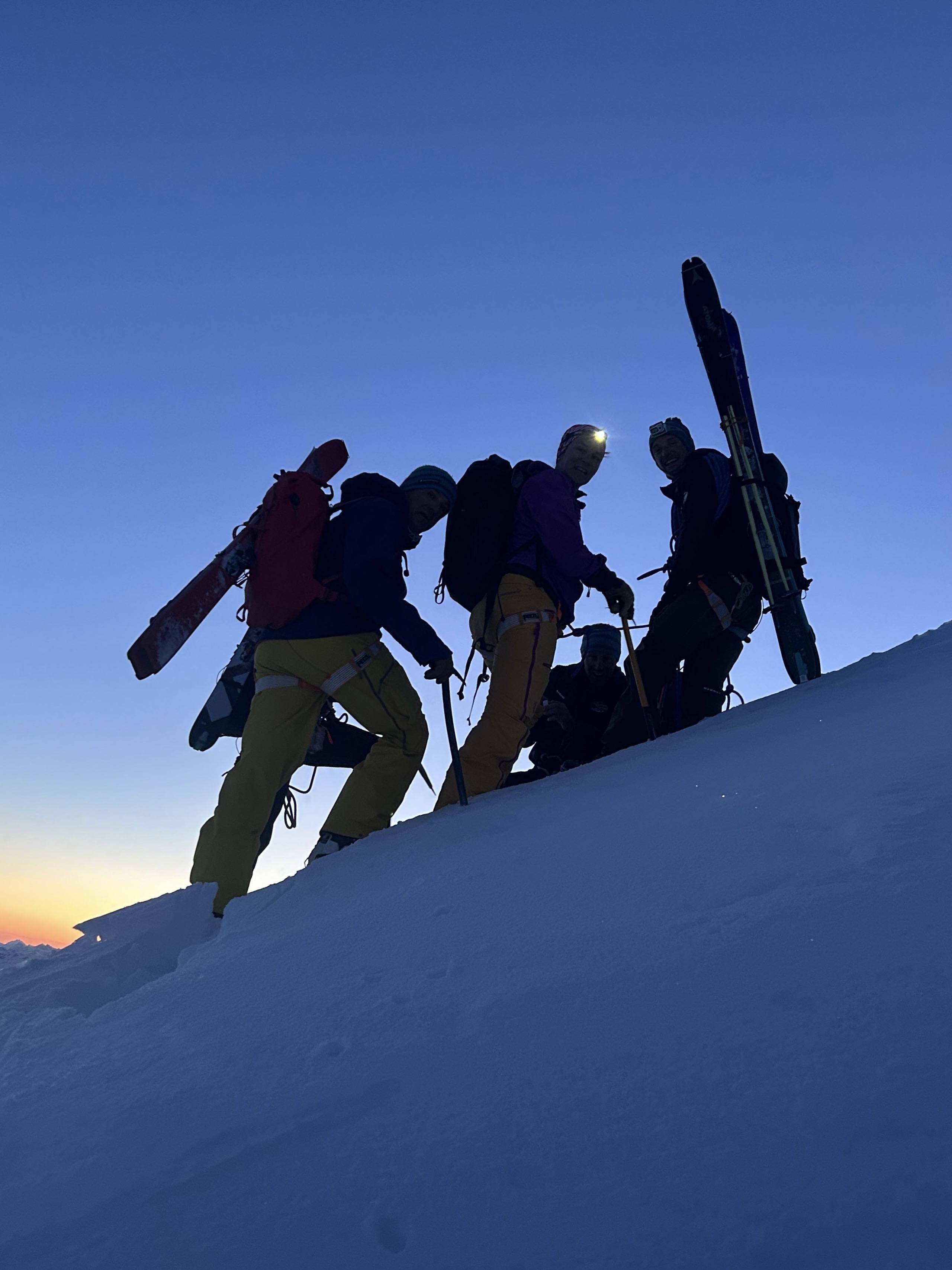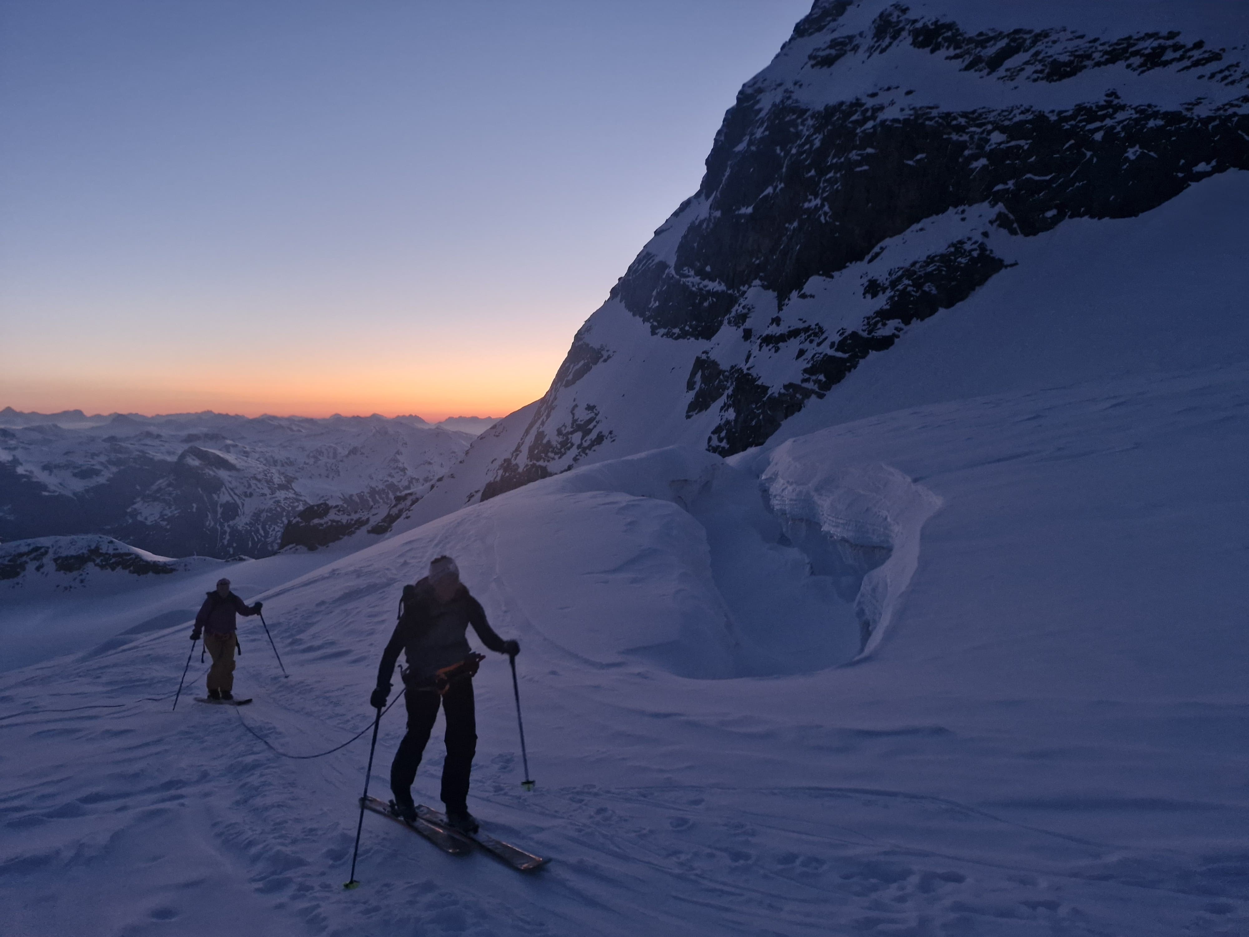 La descente sur le glacier est belle dure, beurk, je suis bien contente d’arriver au plat et de mettre les peaux. On commence notre montée, de nuit, à la lueur des frontales, je m’enferme dans ma bulle et on avance bien, lentement mais surement. Les premières lueurs du jour viennent me sortir de ma torpeur, eh mais si c’est beau. Je ne me lasserais jamais de ces instants, ça vaut tous les levés au milieu de la nuit et tous les intestins détraqués du monde.