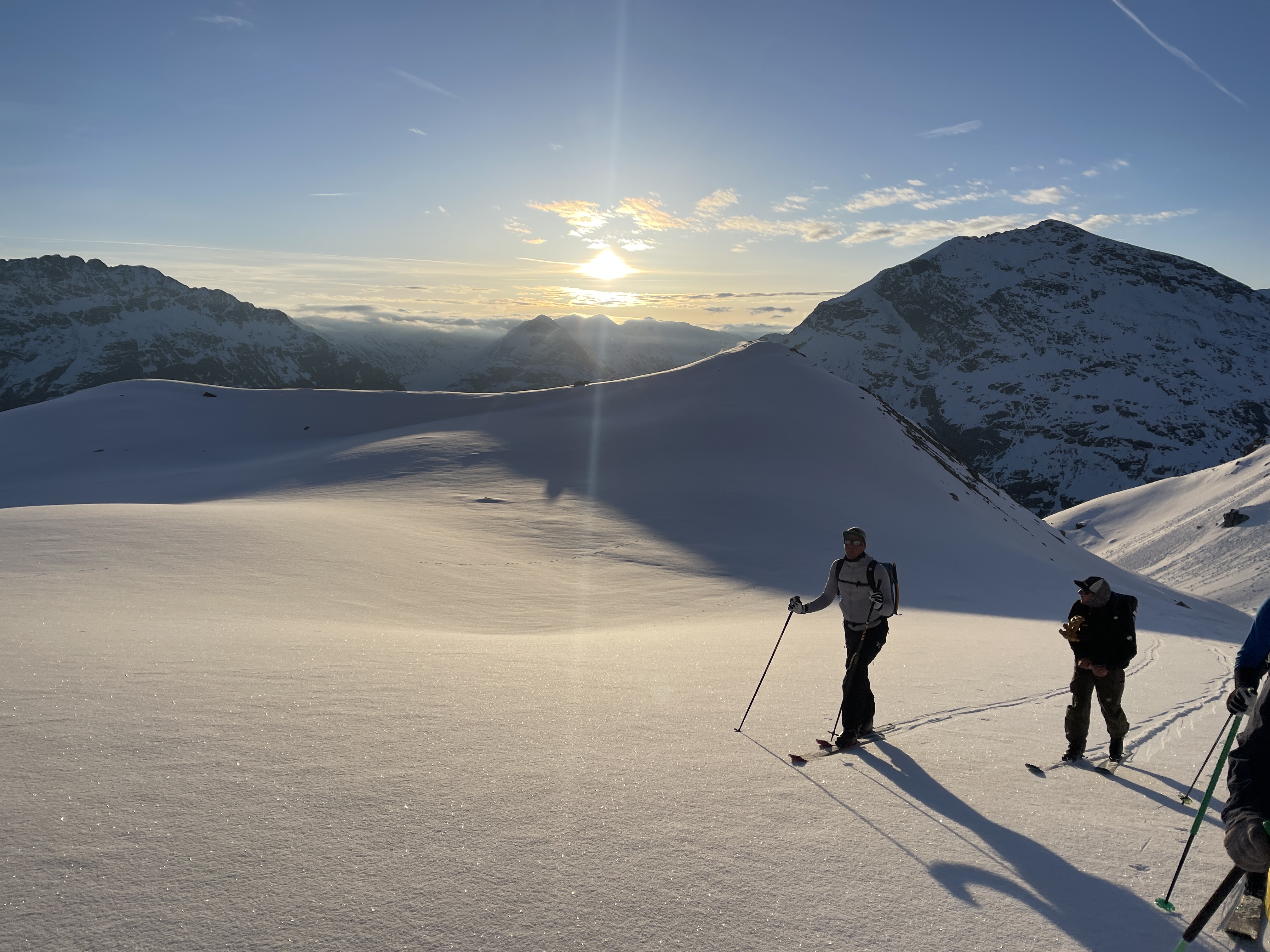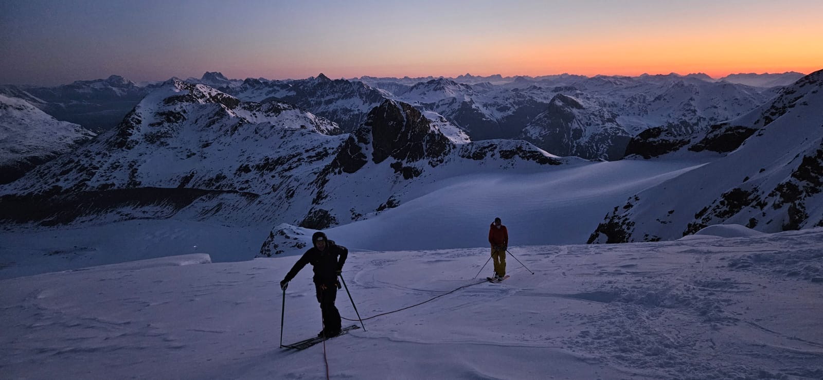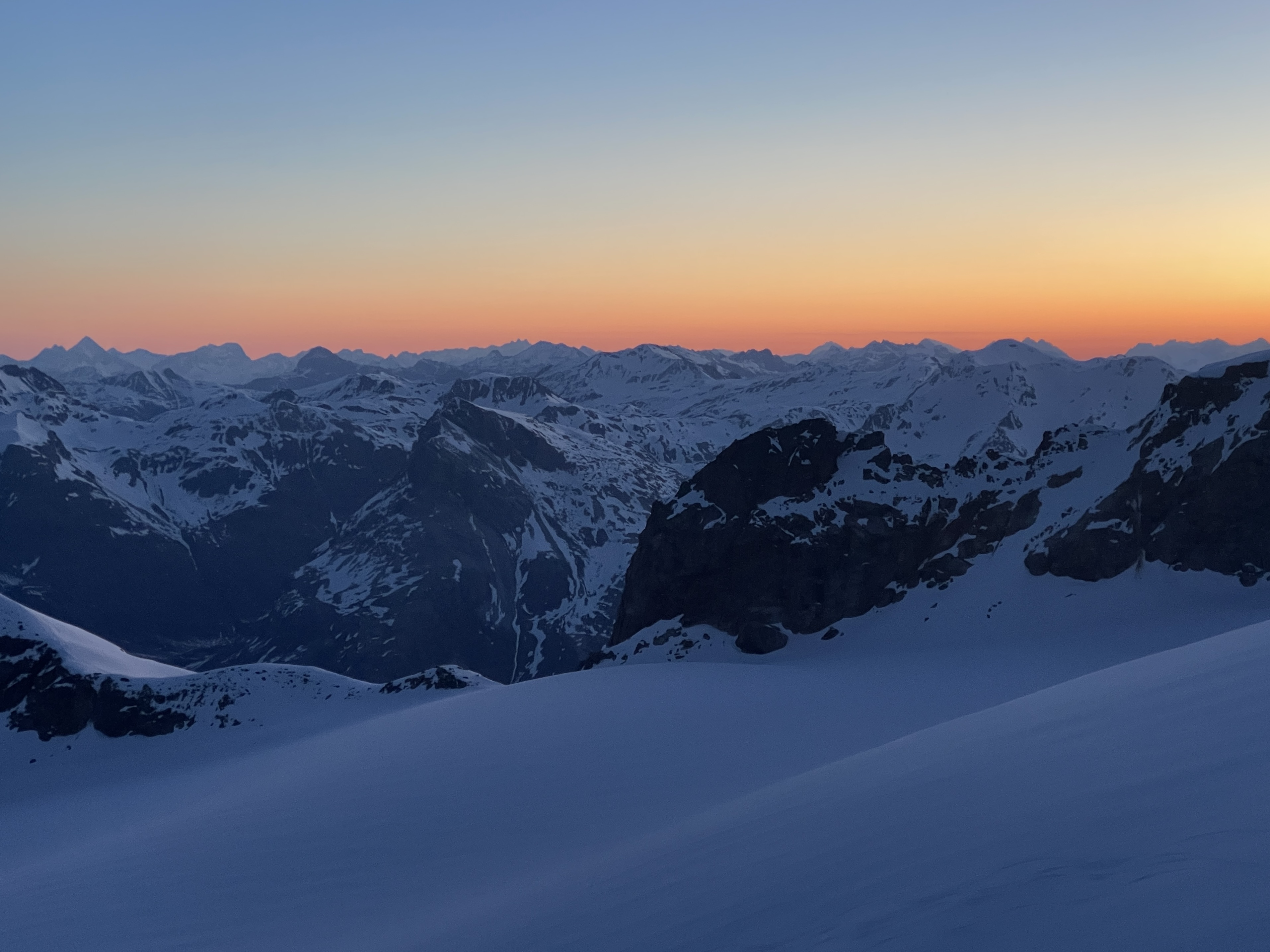 La descente sur le glacier est belle dure, beurk, je suis bien contente d’arriver au plat et de mettre les peaux. On commence notre montée, de nuit, à la lueur des frontales, je m’enferme dans ma bulle et on avance bien, lentement mais surement. Les premières lueurs du jour viennent me sortir de ma torpeur, eh mais si c’est beau. Je ne me lasserais jamais de ces instants, ça vaut tous les levés au milieu de la nuit et tous les intestins détraqués du monde.