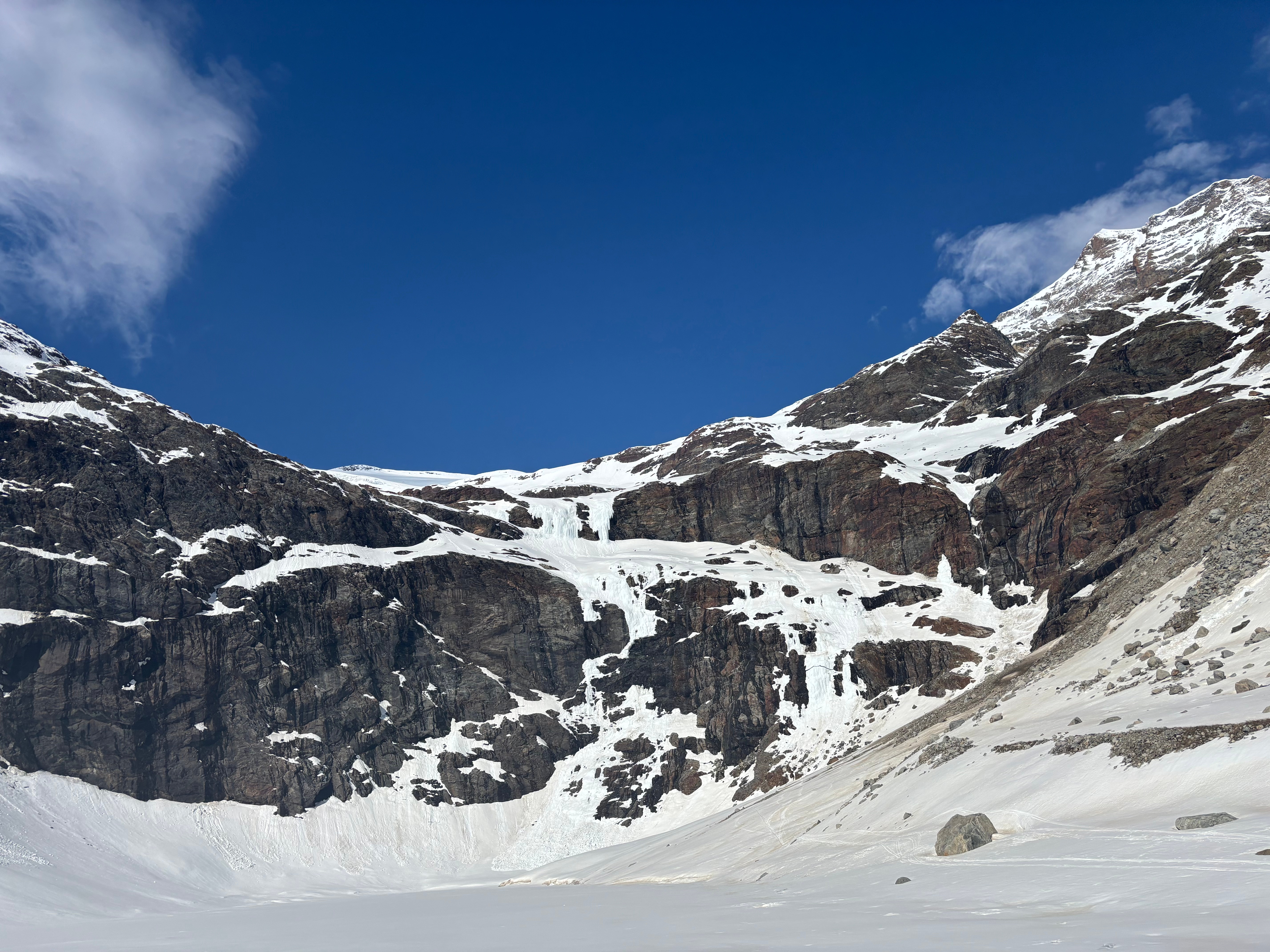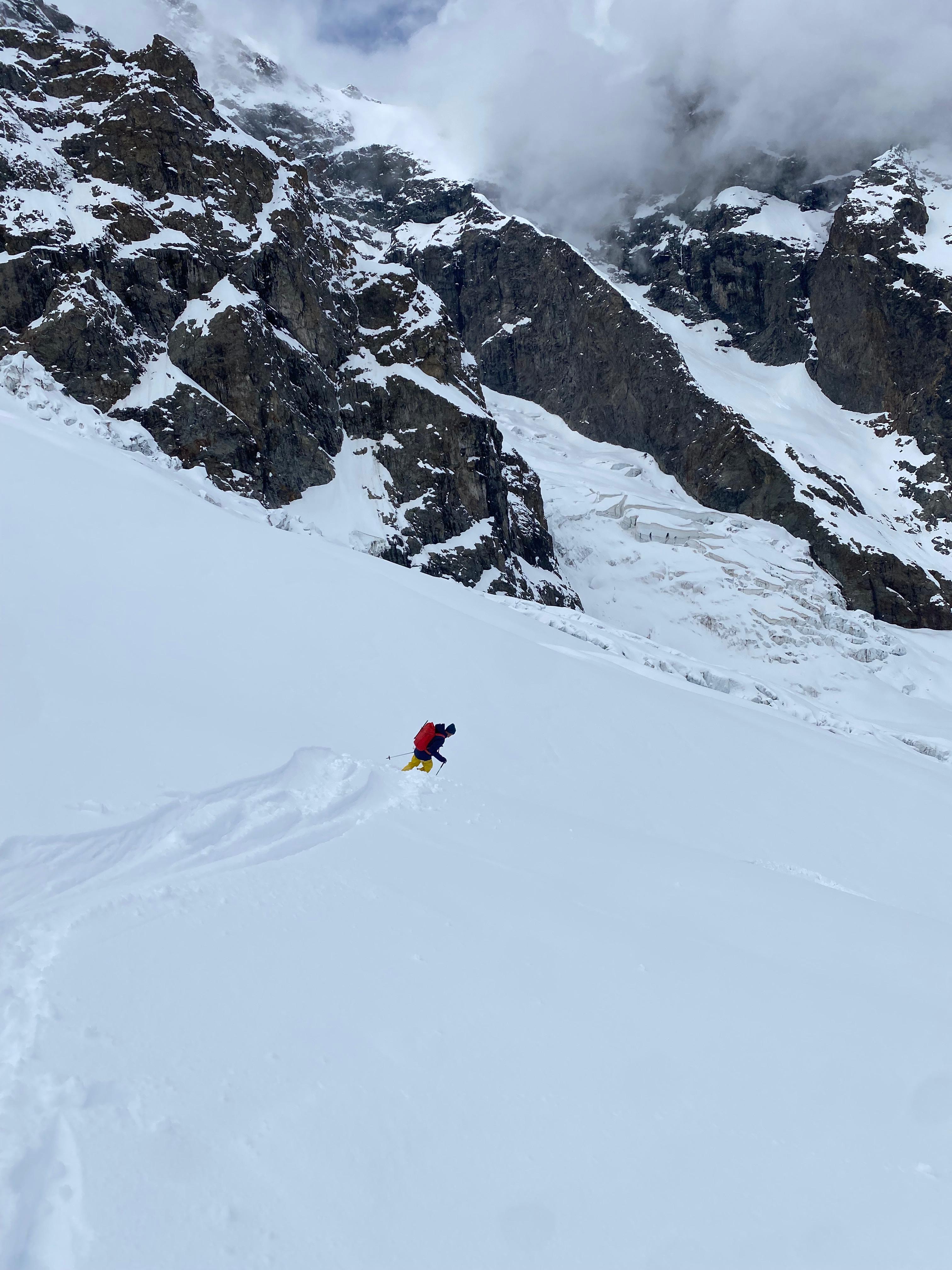 Il arrive inévitablement le moment où la neige devient moins bonne. Et là en prime, on arrive dans un espèce de cirque avec de vieilles cascades de glace en train de se fendre en deux, ça ne donne pas trop envie de faire de vieux os par ici. Cédric nous mouline en bas quelques mètres et on fiche le camp.