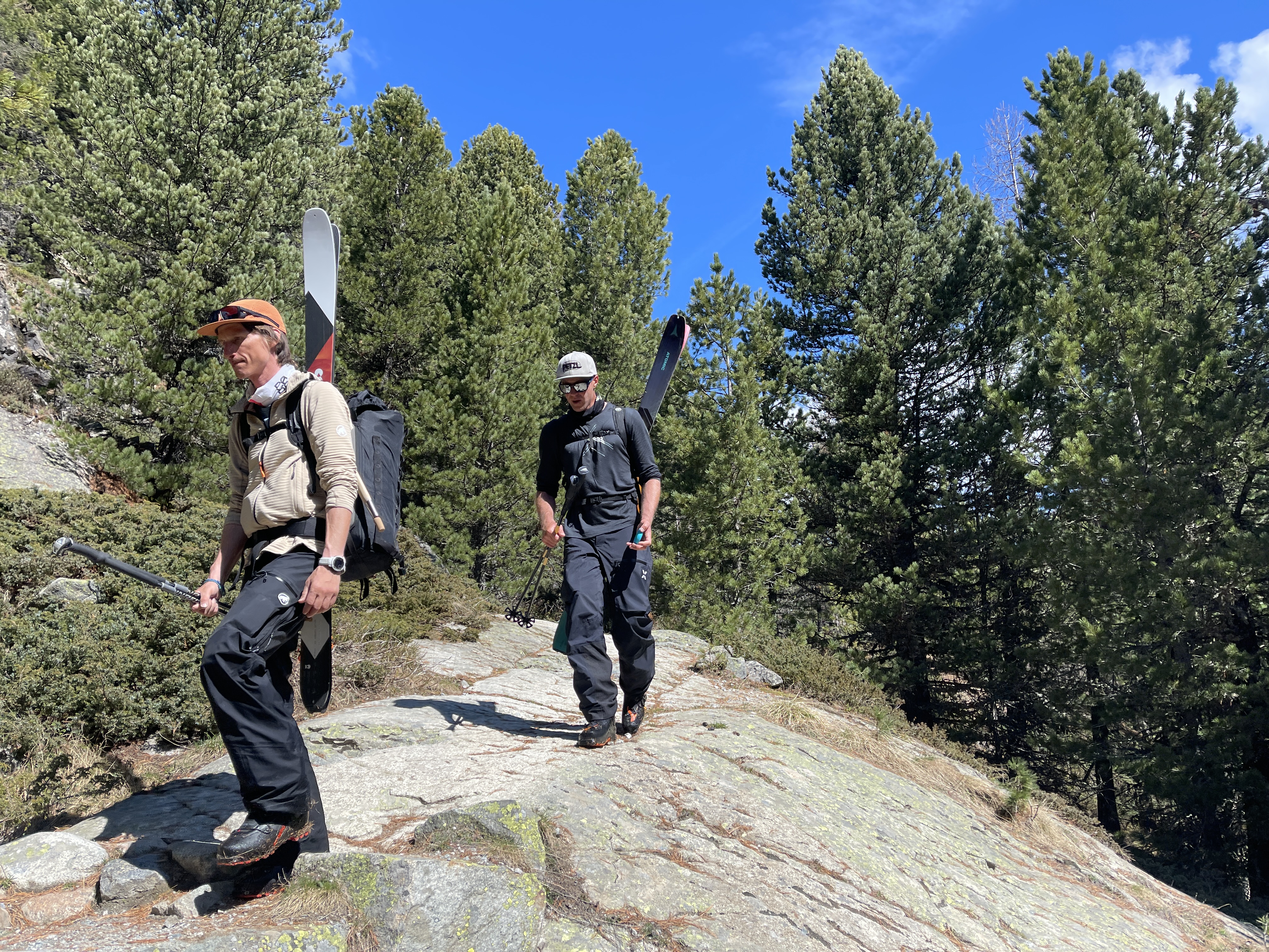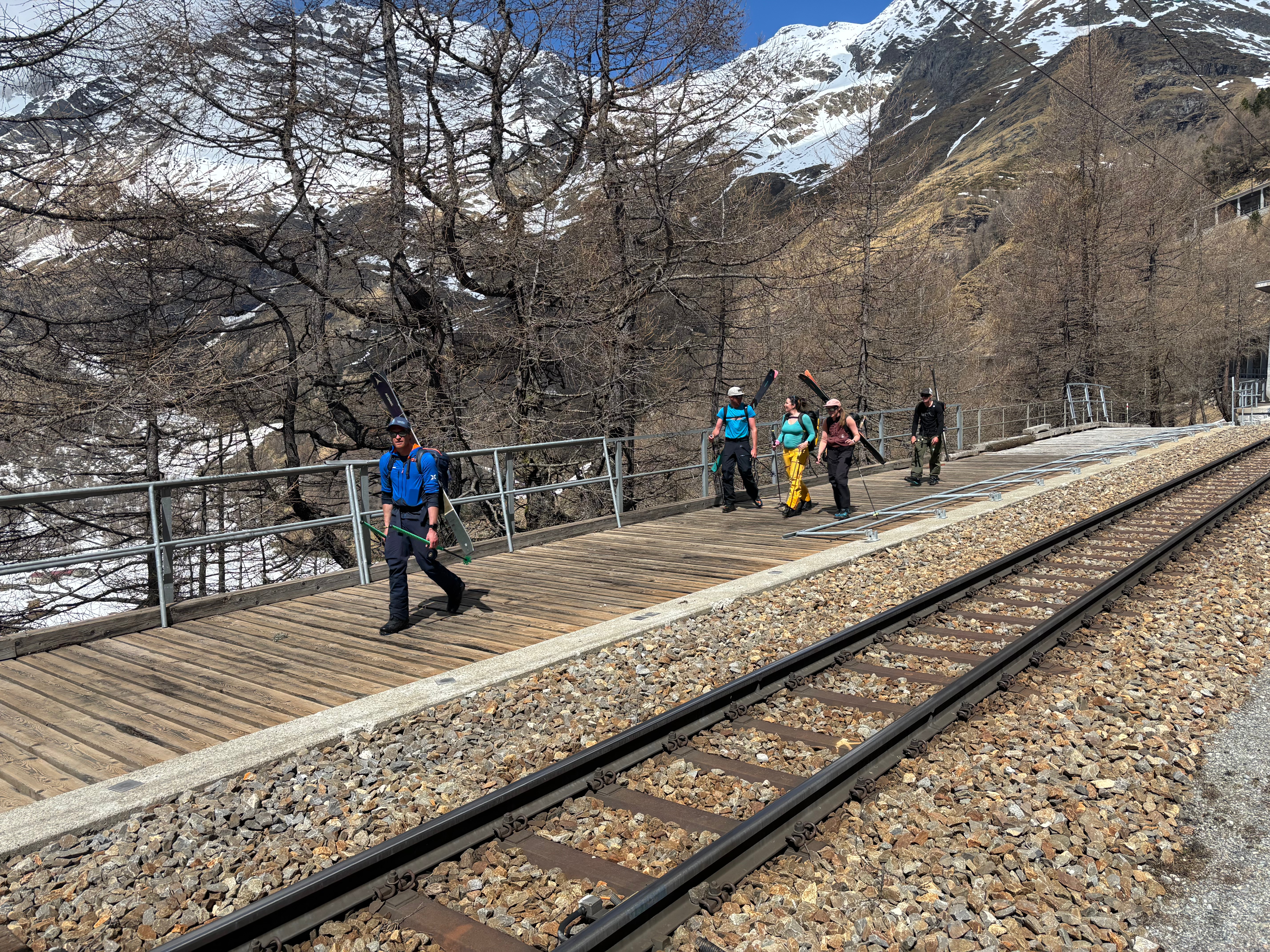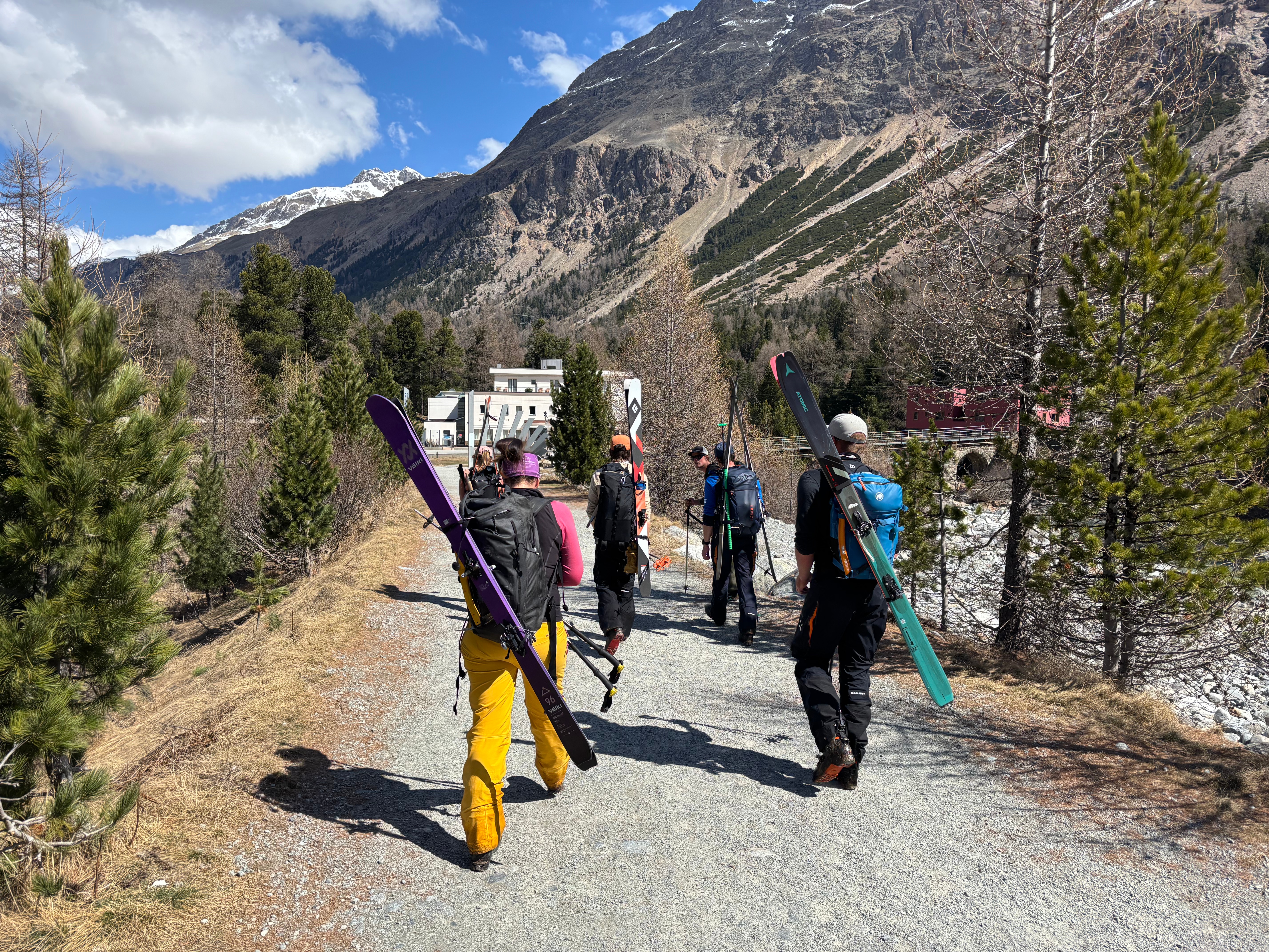 Malheureusement, on arrive bien trop rapidement à la fin de la neige.. il faut mettre les skis sur le sac et descendre à Morteratsch. C’est pas ultra long et le temps passe vite quand on est avec des gens sympas, on a plein de trucs à se raconter et beaucoup de choses à apprendre (pour nous, hein..)